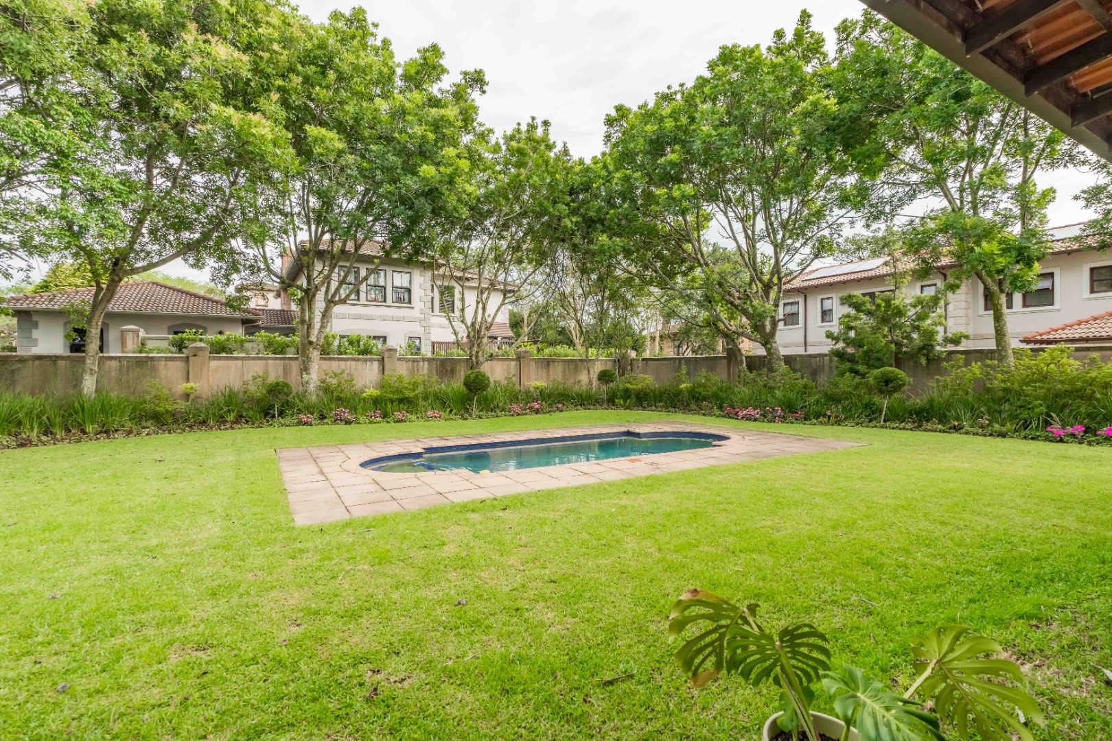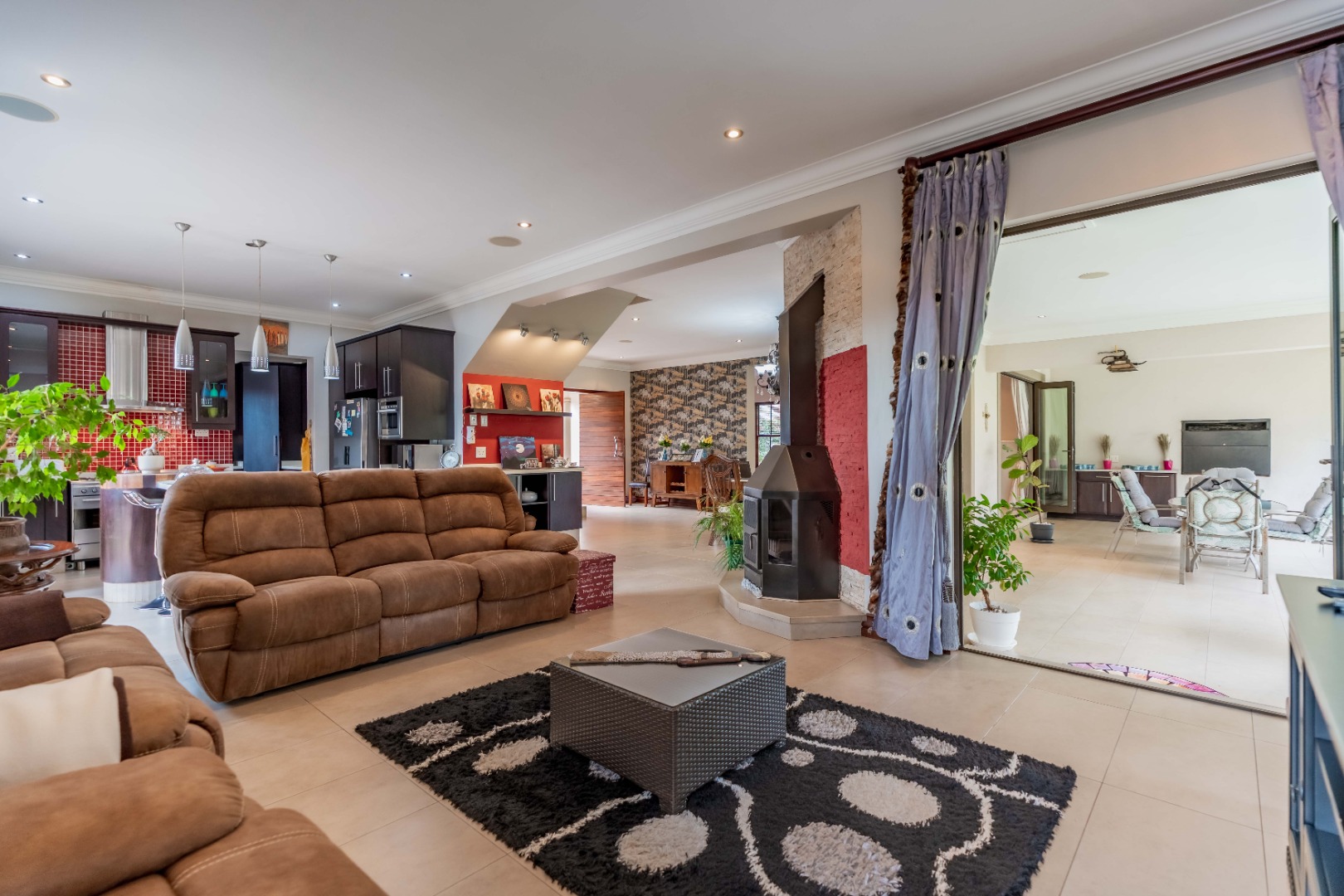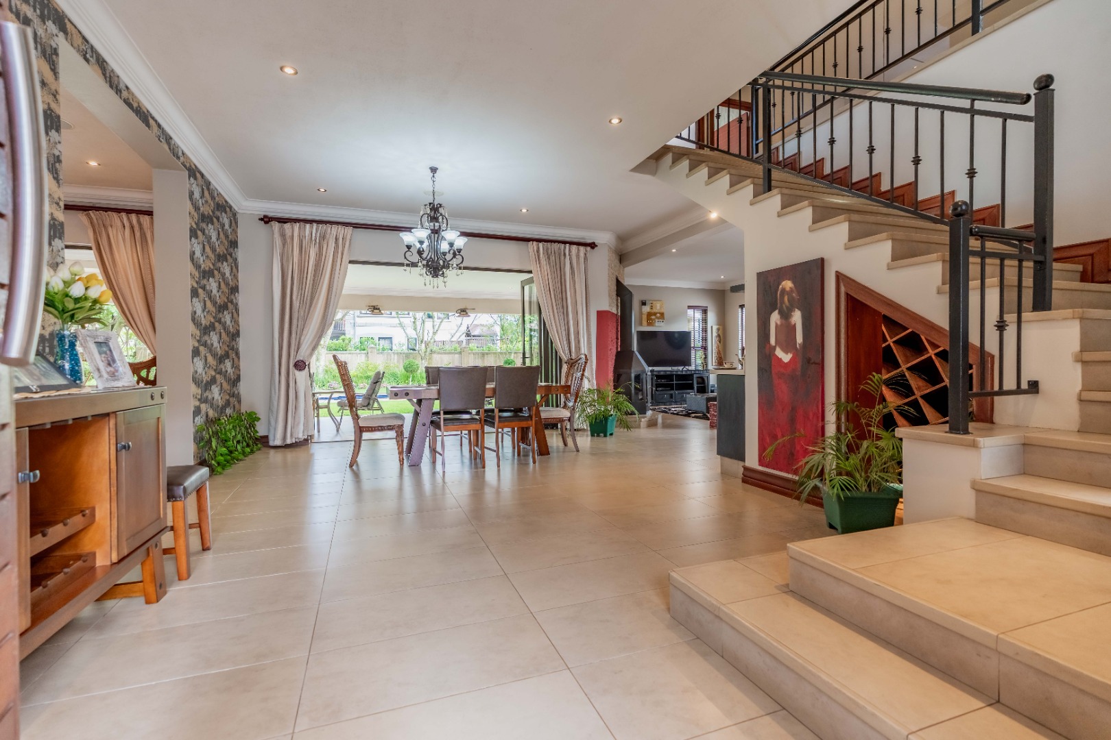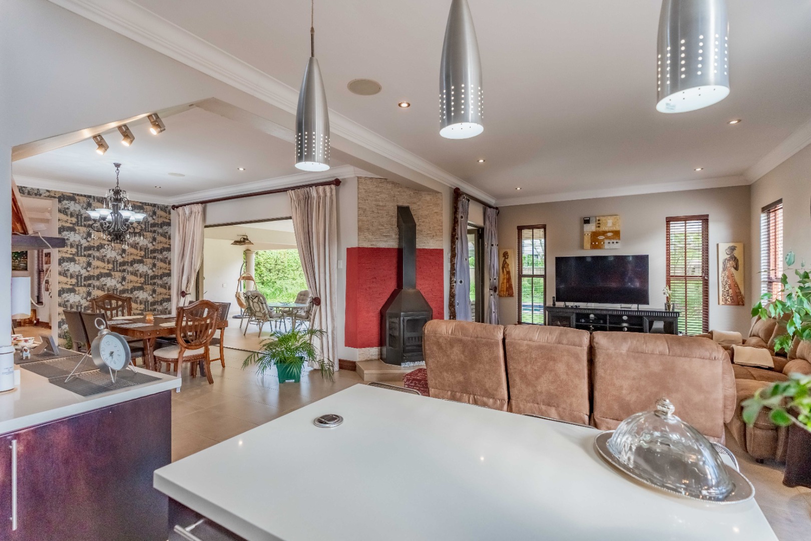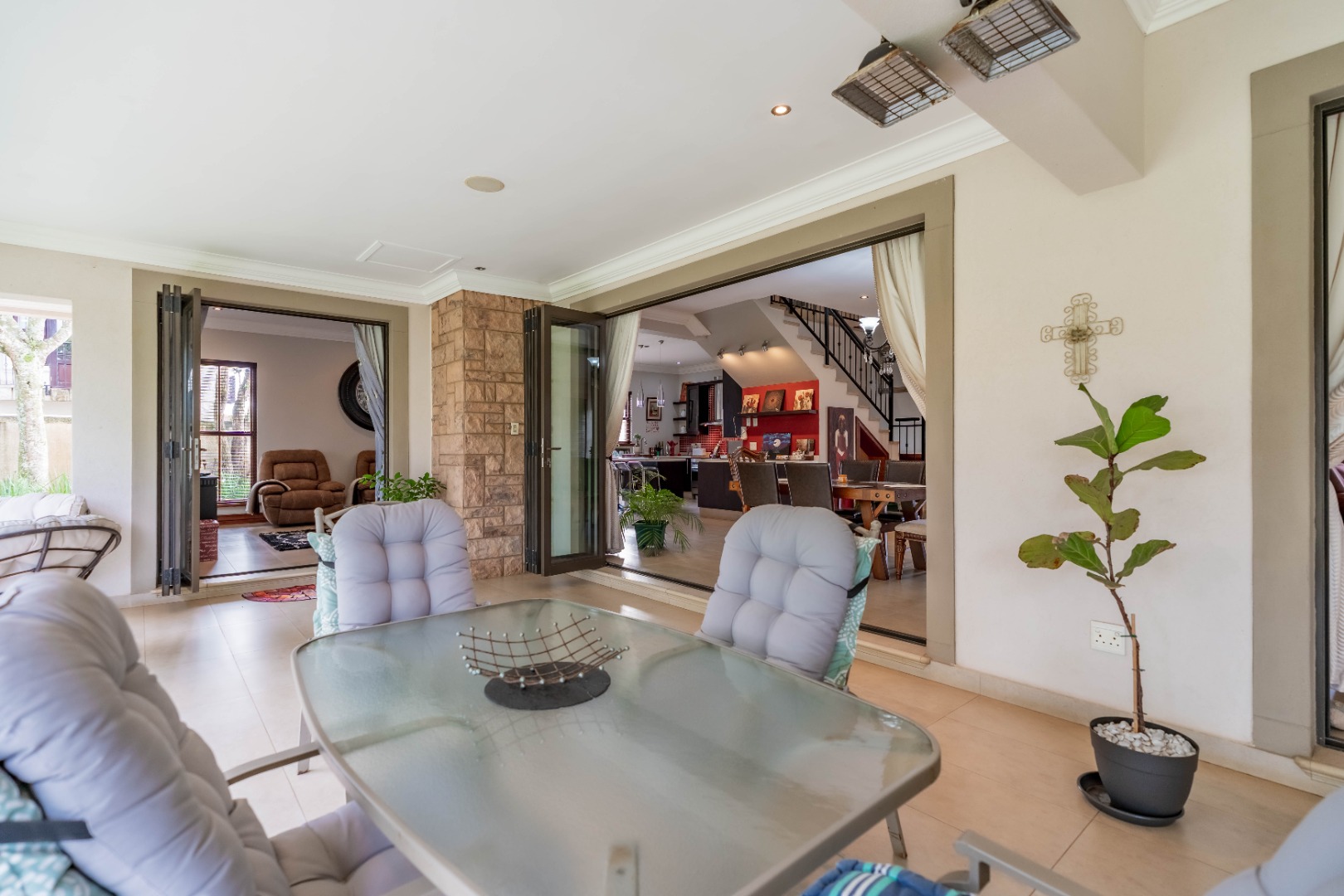 Stack doors open out onto a covered verandah with a built-in braai, overlooking a level garden and pool. It’s a usable outdoor space - easy for kids, easy for entertaining, and low maintenance.