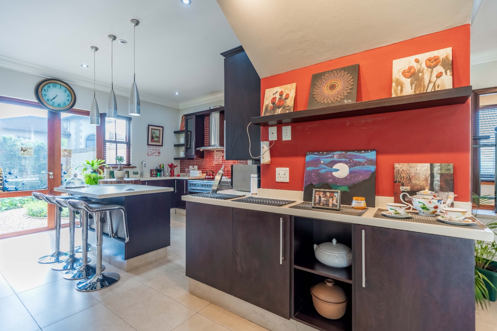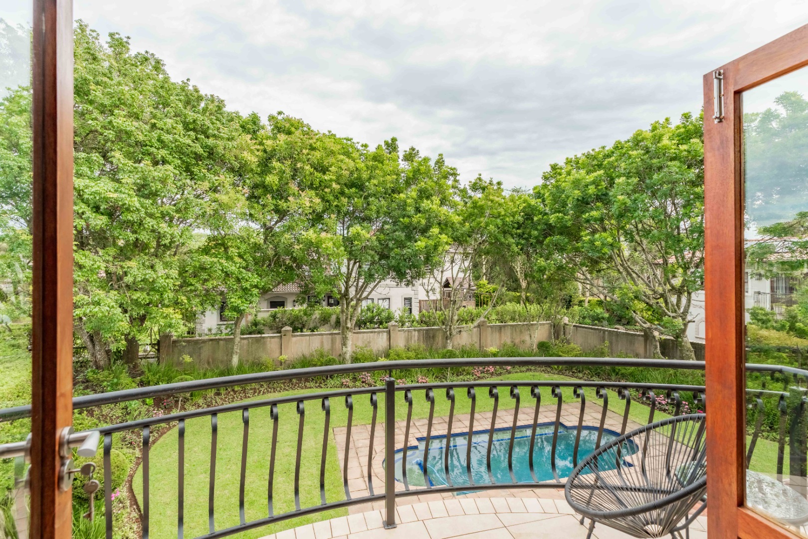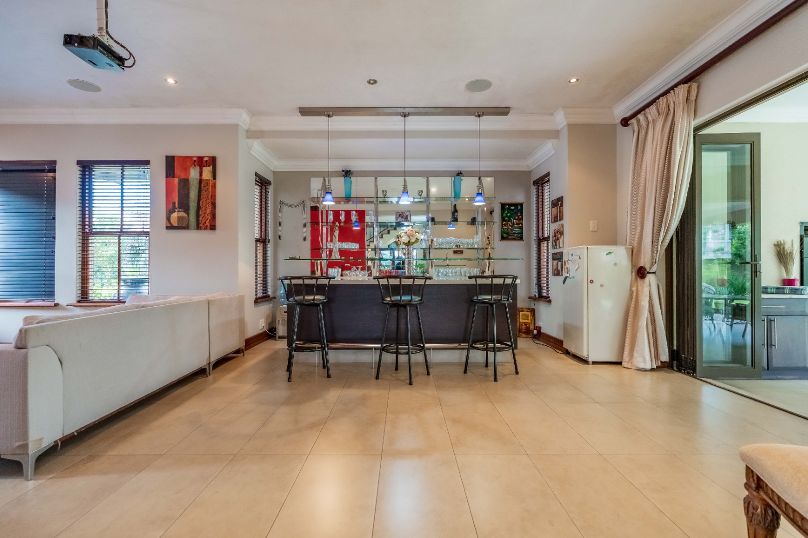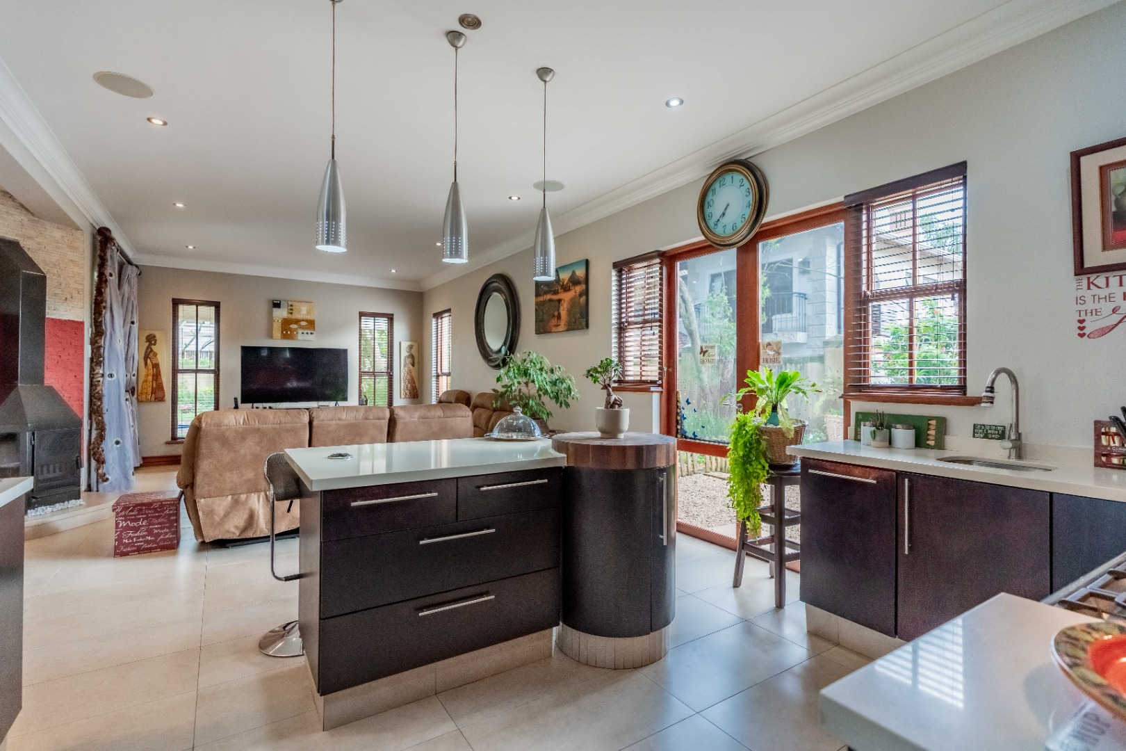 Stack doors open out onto a covered verandah with a built-in braai, overlooking a level garden and pool. It’s a usable outdoor space - easy for kids, easy for entertaining, and low maintenance.