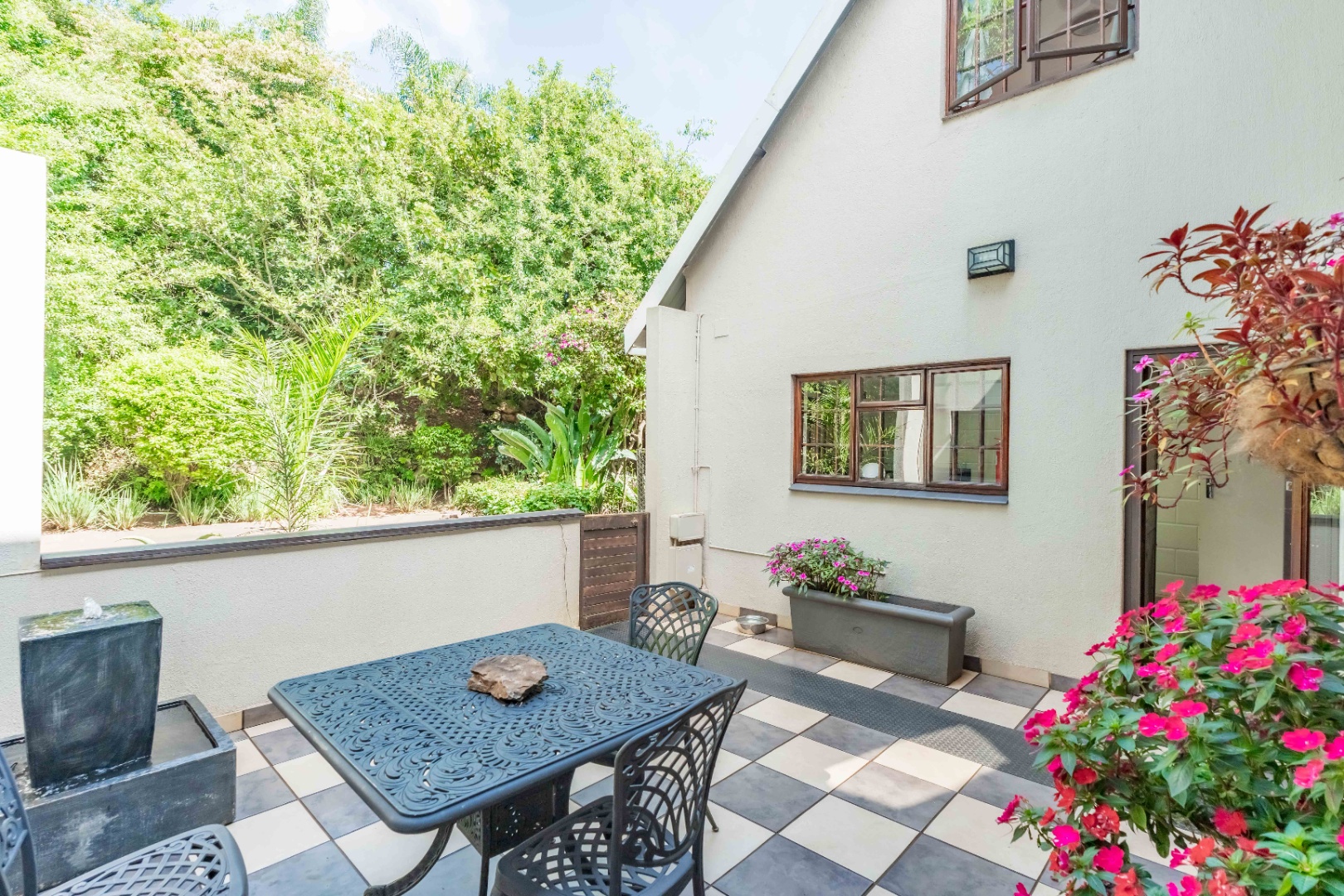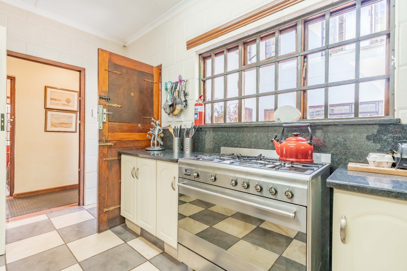 The kitchen is fitted with granite tops, a gas stove, scullery and opens onto a separate patio.