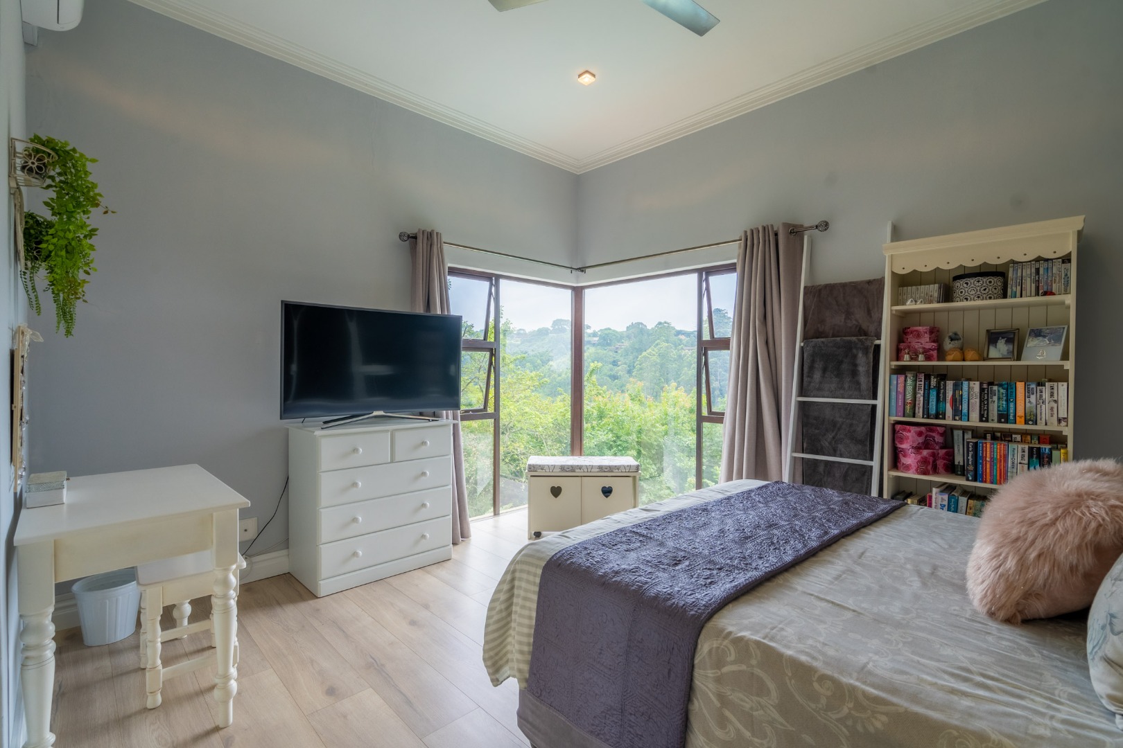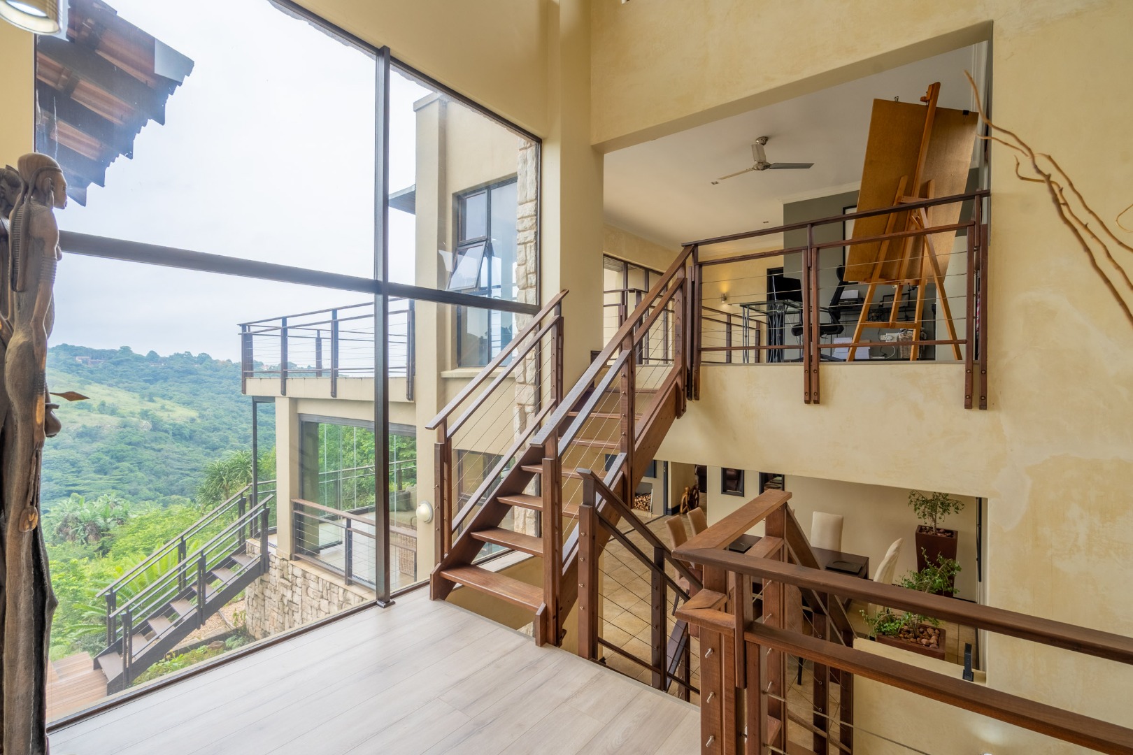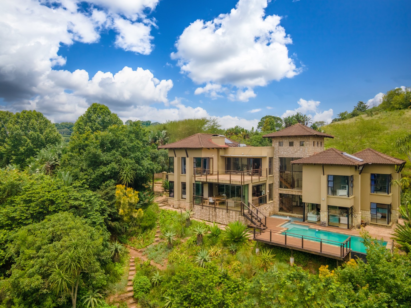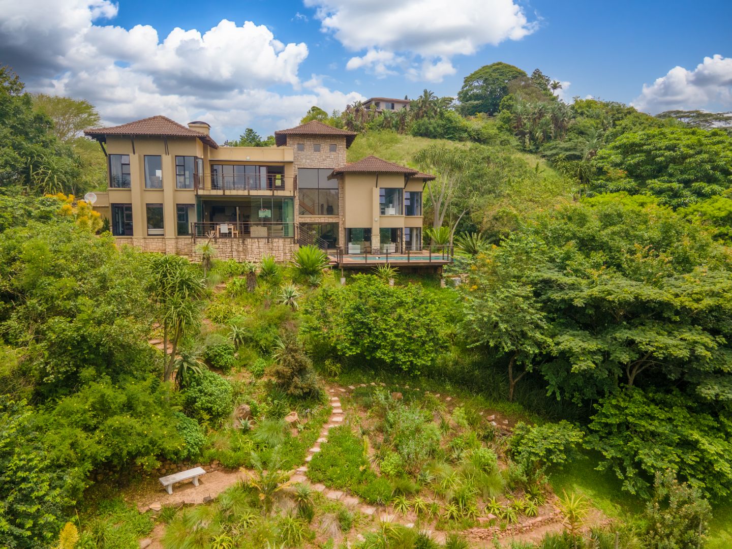 With elevated sweeping views into the Kloof gorge, the master en-suite bedroom is on the top level with private dressing room. Furthermore you will find 2 more bedrooms on the same level sharing a bathroom, plus a study.