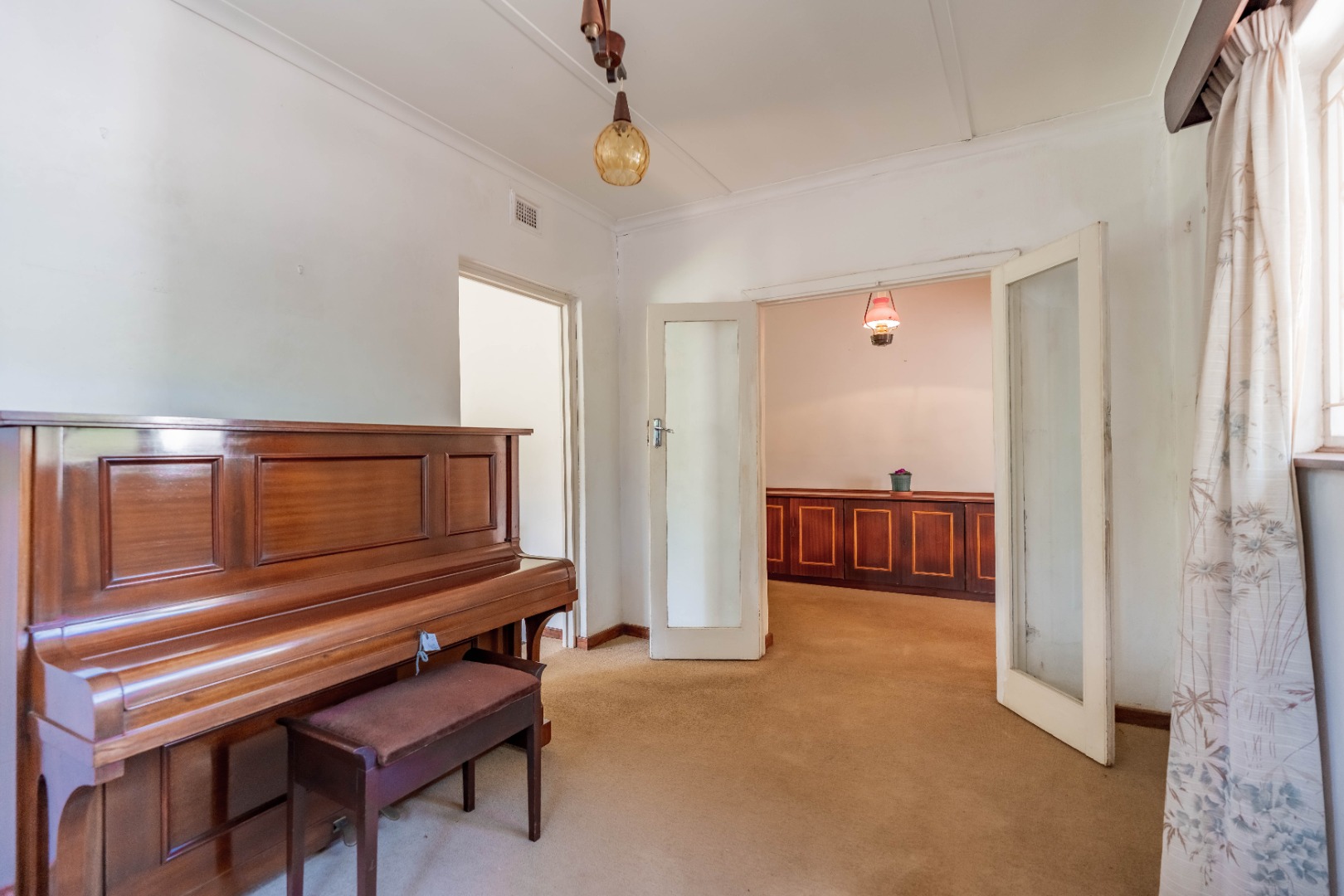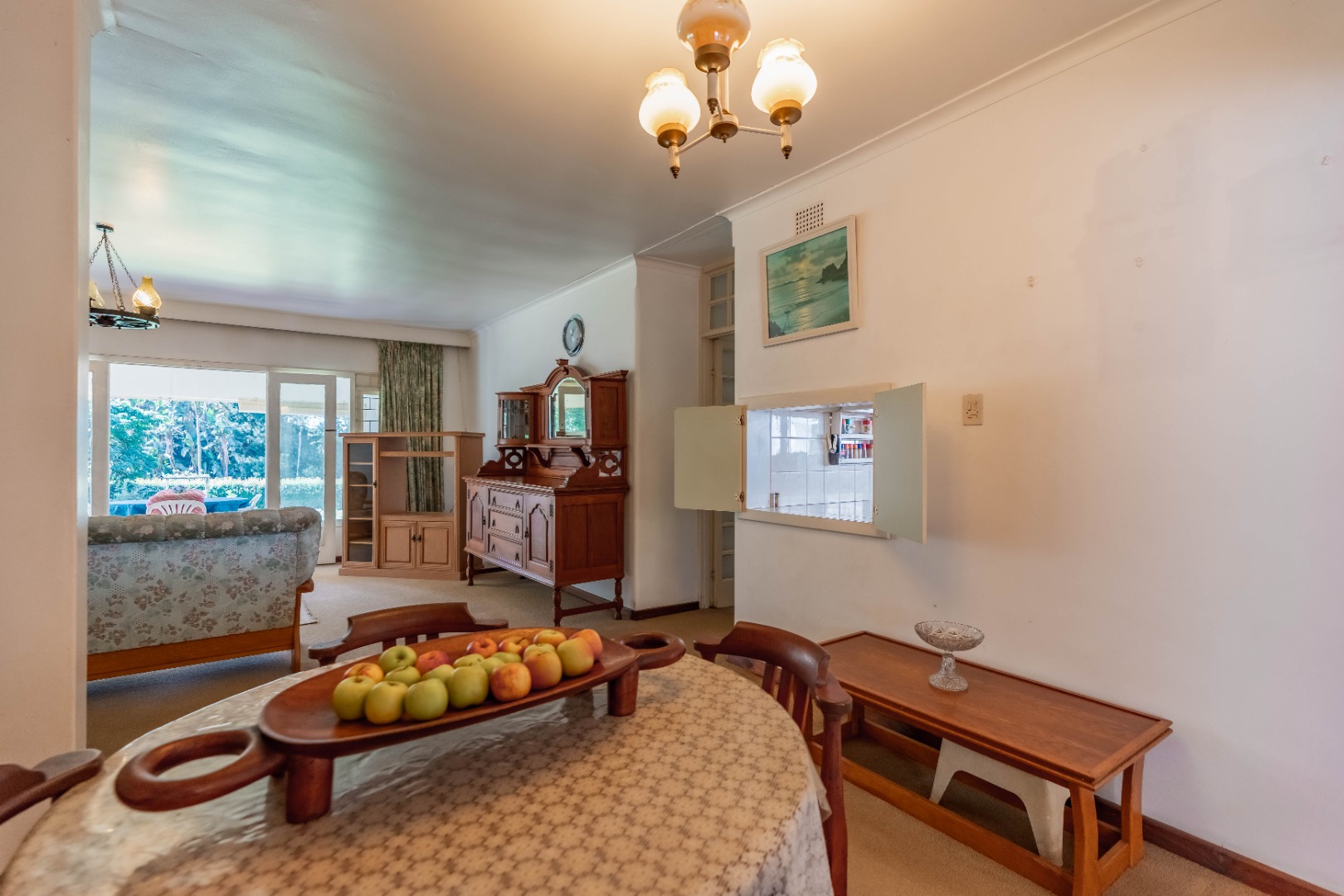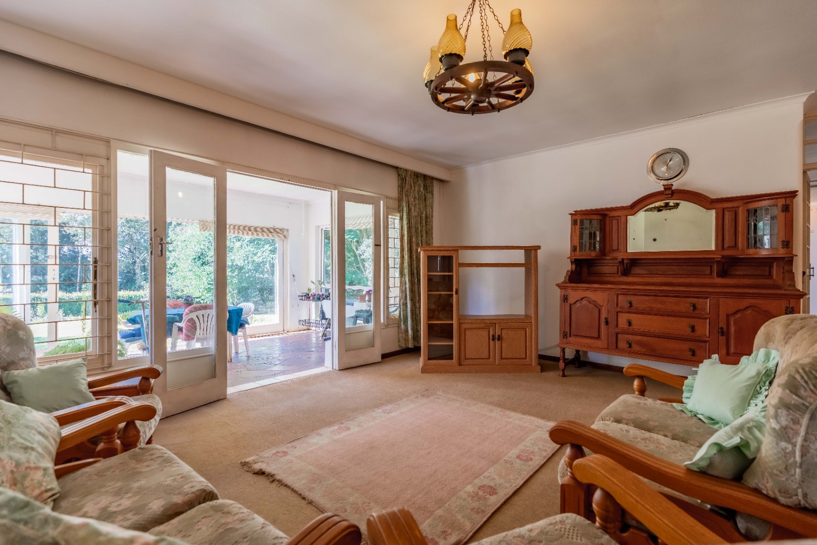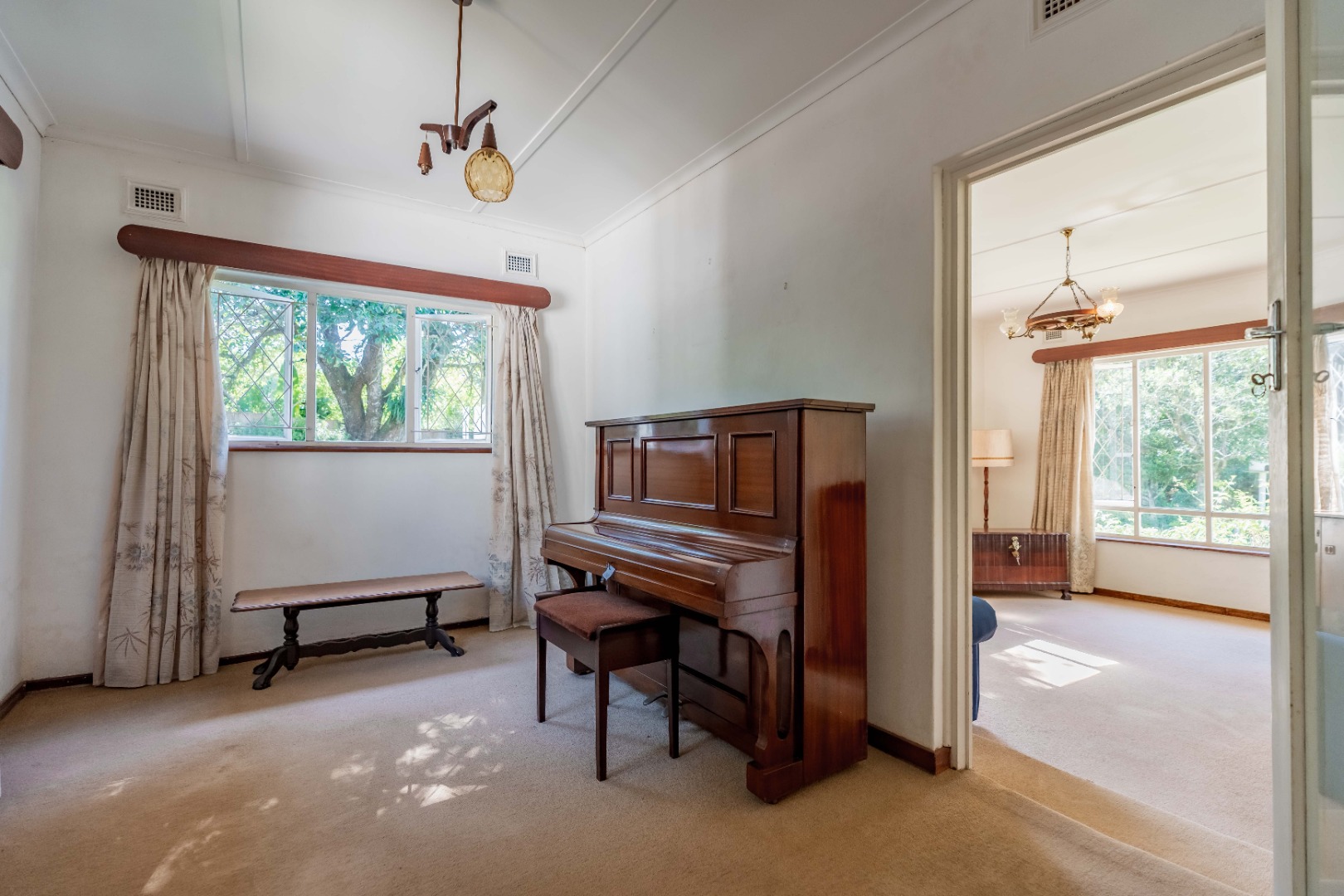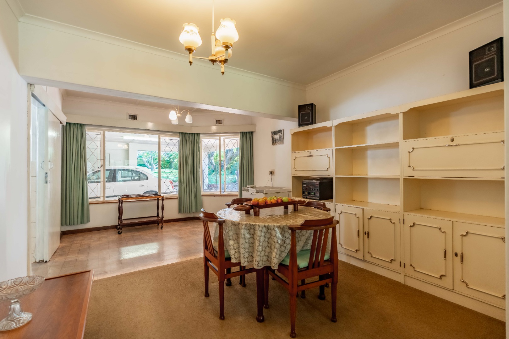 Generously proportioned, the residence features four well-sized bedrooms, including two en-suite, complemented by a family bathroom and separate toilet. A selection of living spaces include a TV lounge, music room, formal lounge with fireplace, and dining room. The formal lounge opens onto an enclosed patio, perfectly positioned to overlook the serene and picturesque front garden. A galley-style kitchen and separate laundry complete the home’s interior footprint.