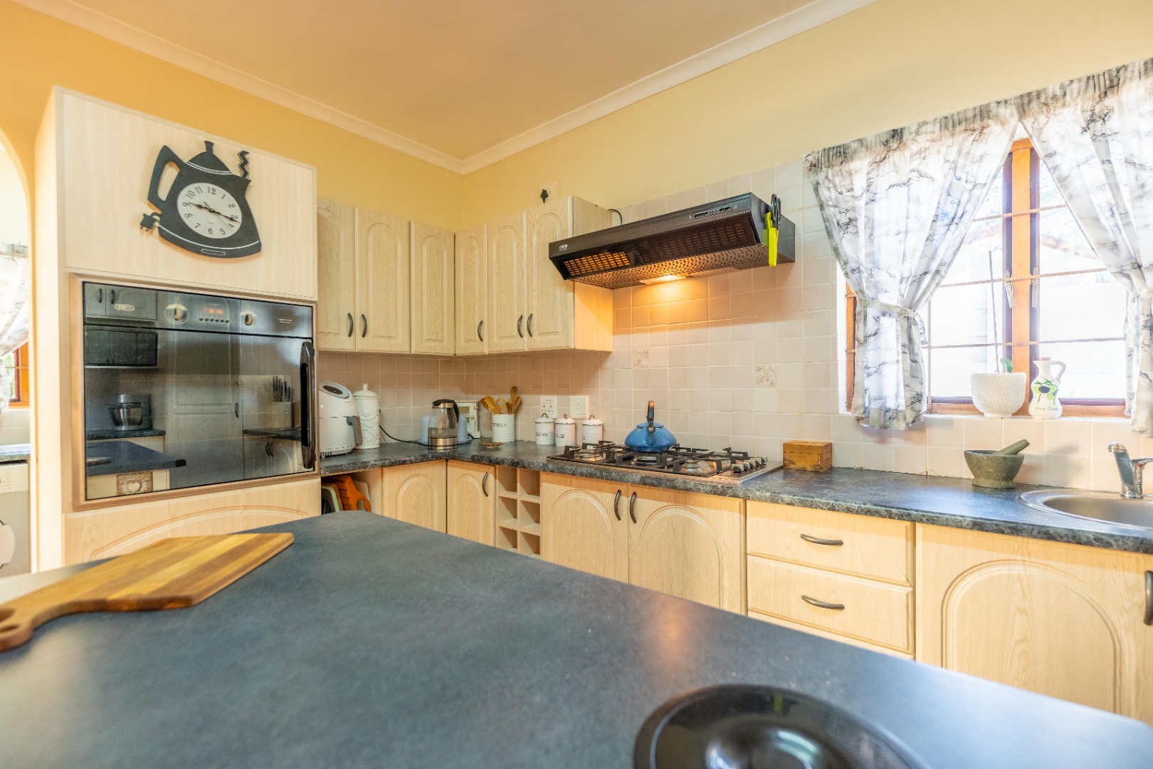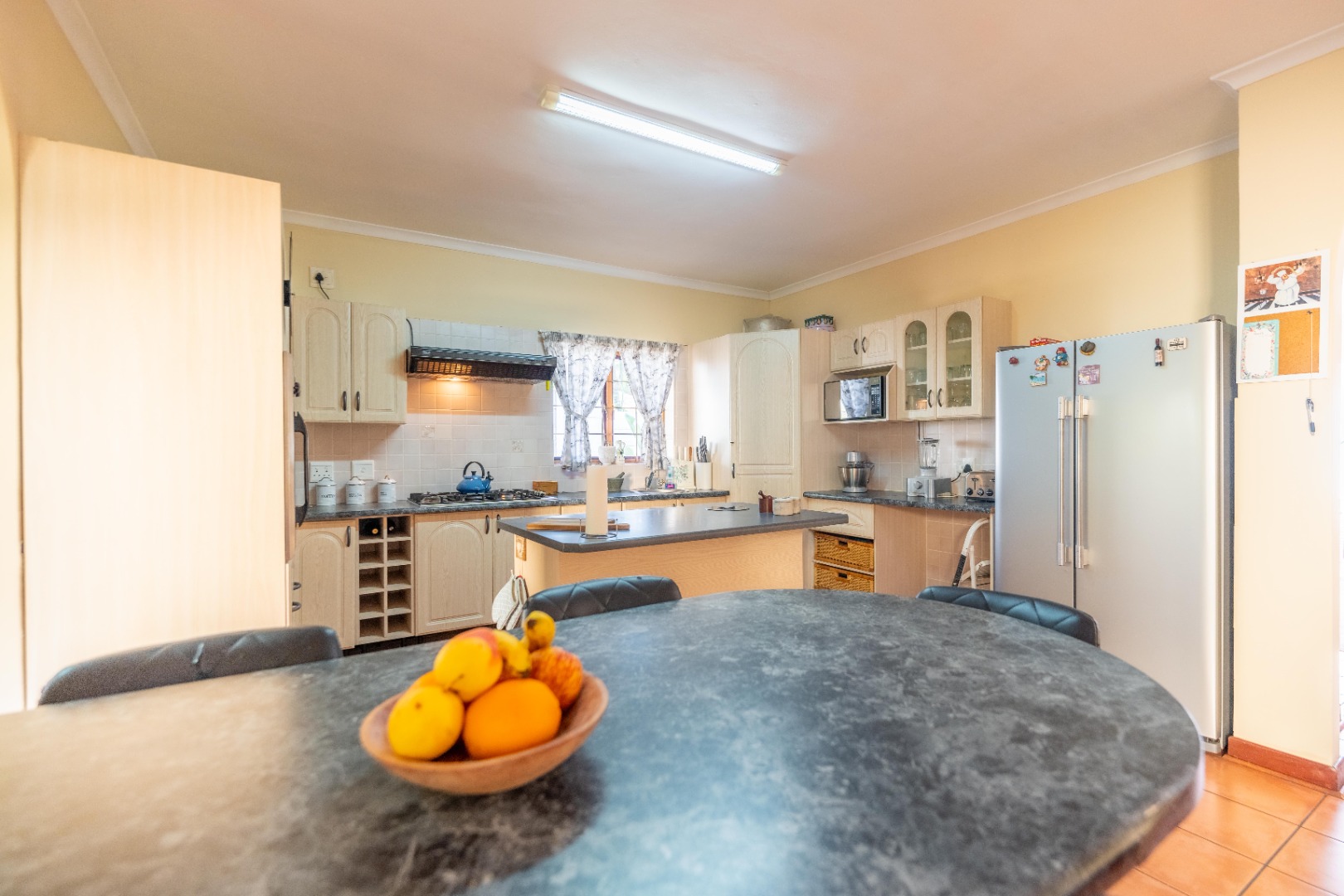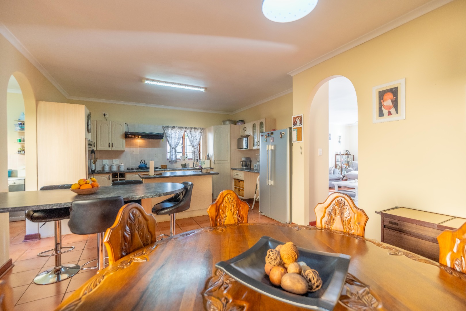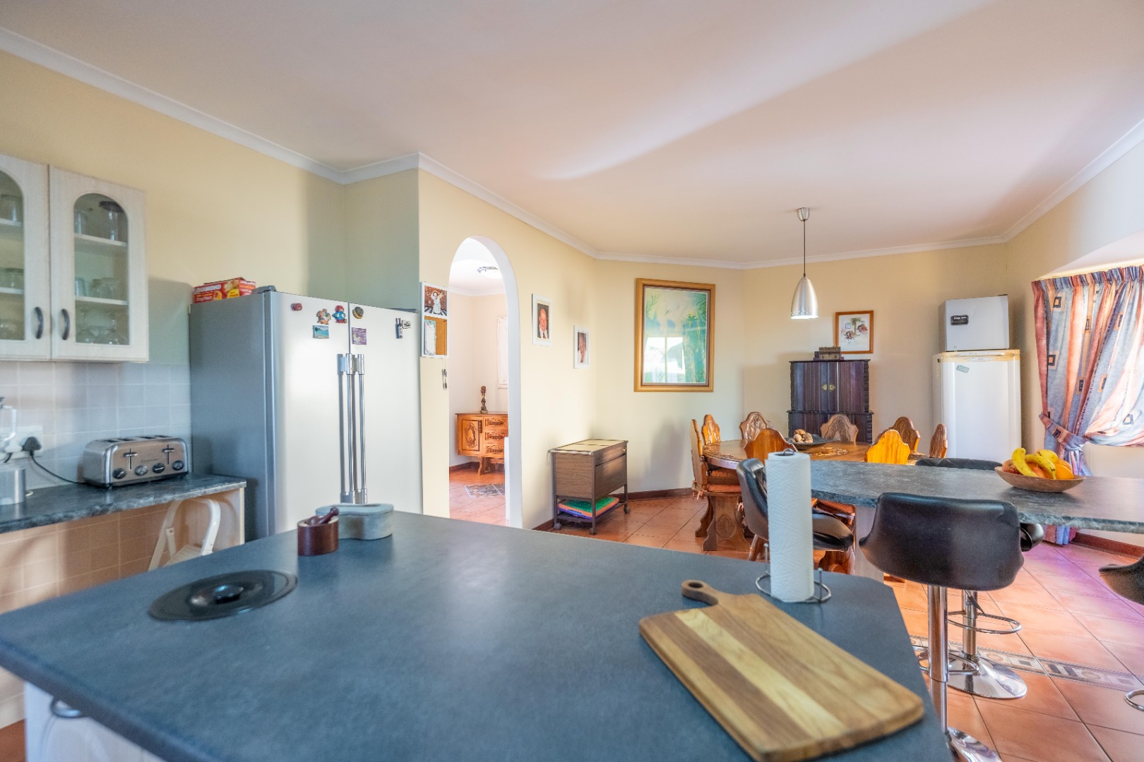 Open plan kitchen with lots of work space and cupboards plus spacious scullery for all the appliances. The dining room is open plan onto the kitchen.