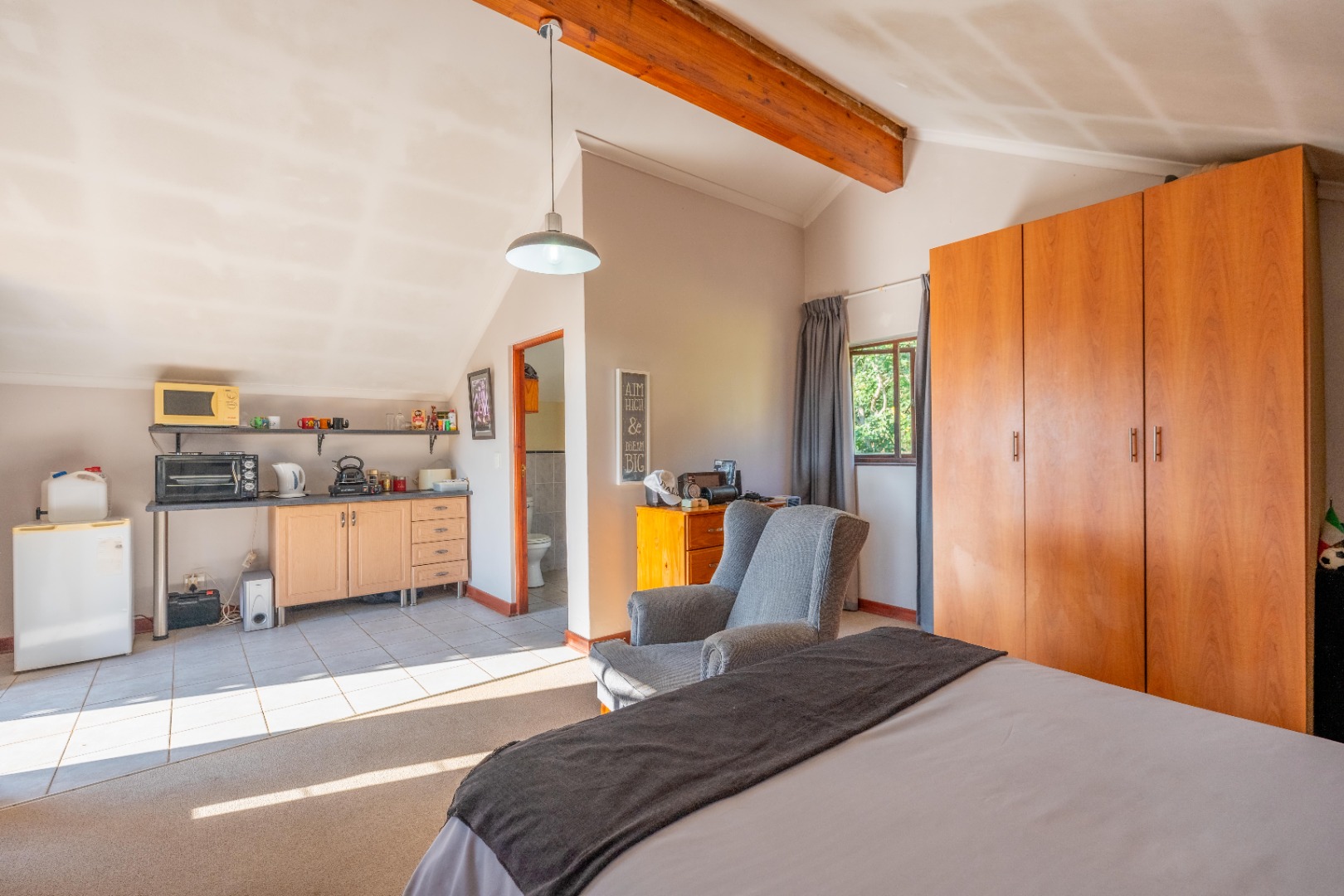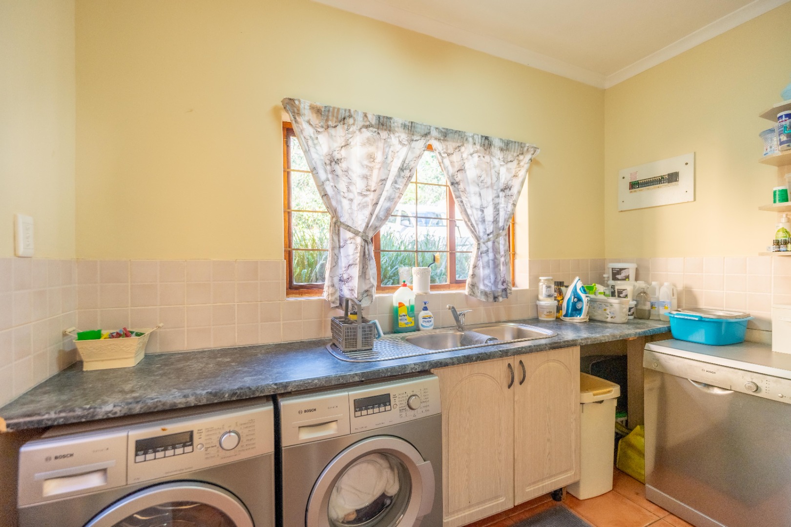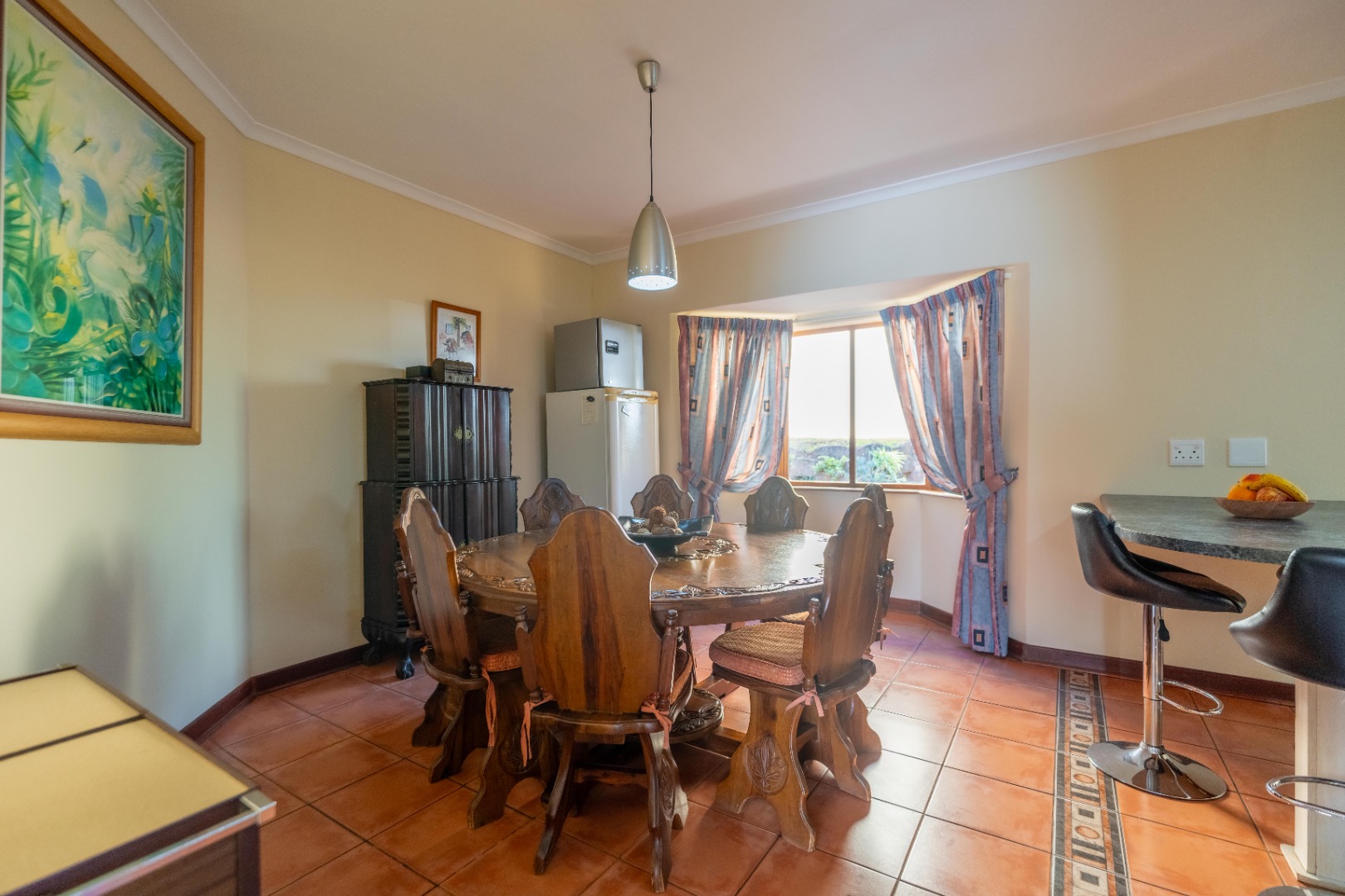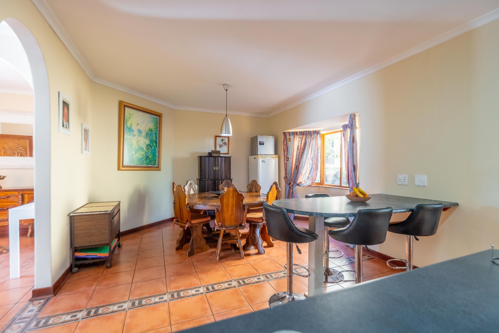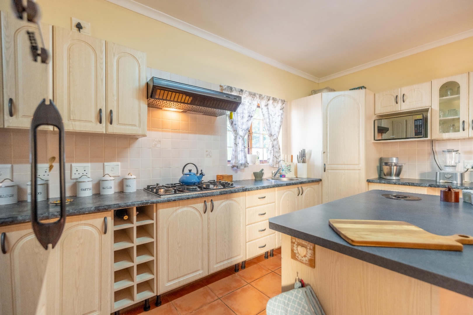 Open plan kitchen with lots of work space and cupboards plus spacious scullery for all the appliances. The dining room is open plan onto the kitchen.