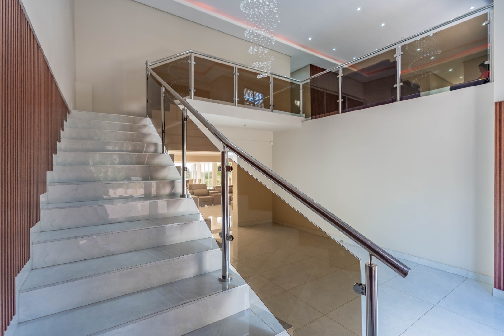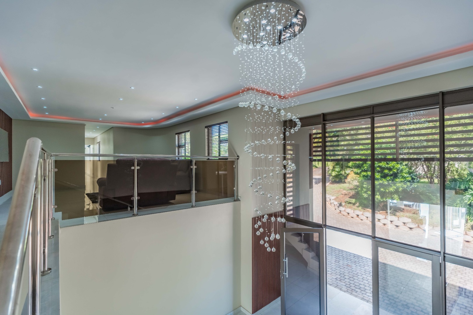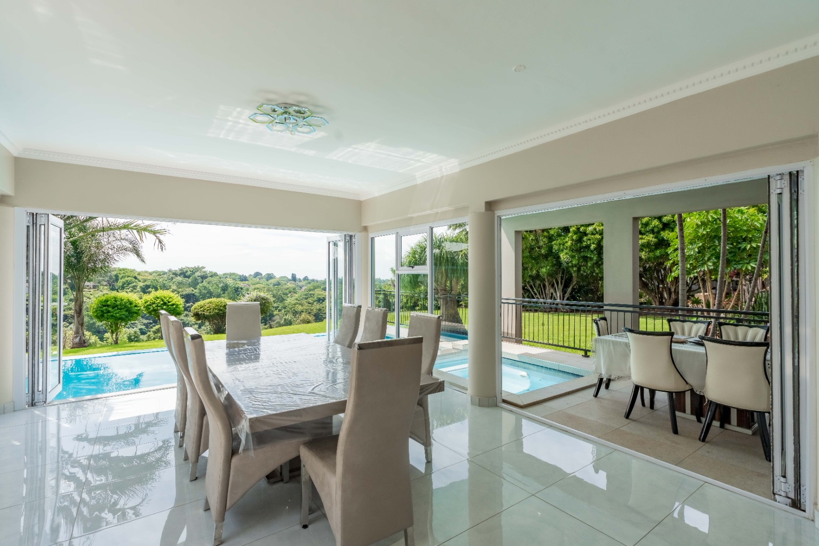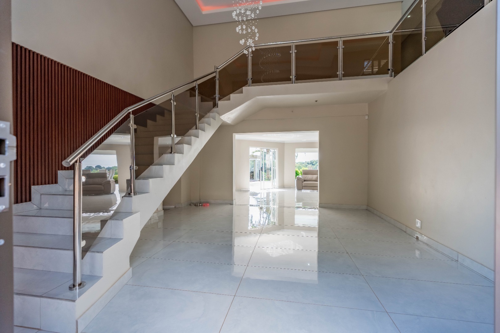 As you enter the home, you are welcomed by a stunning chandelier and impressive double-volume ceilings, creating a grand first impression. The main lounge and dining area flow seamlessly out onto a beautiful rim-flow pool, overlooking the lush garden and offering stunning nature views. The property also features a fantastic entertainment area, perfect for hosting family and friends.