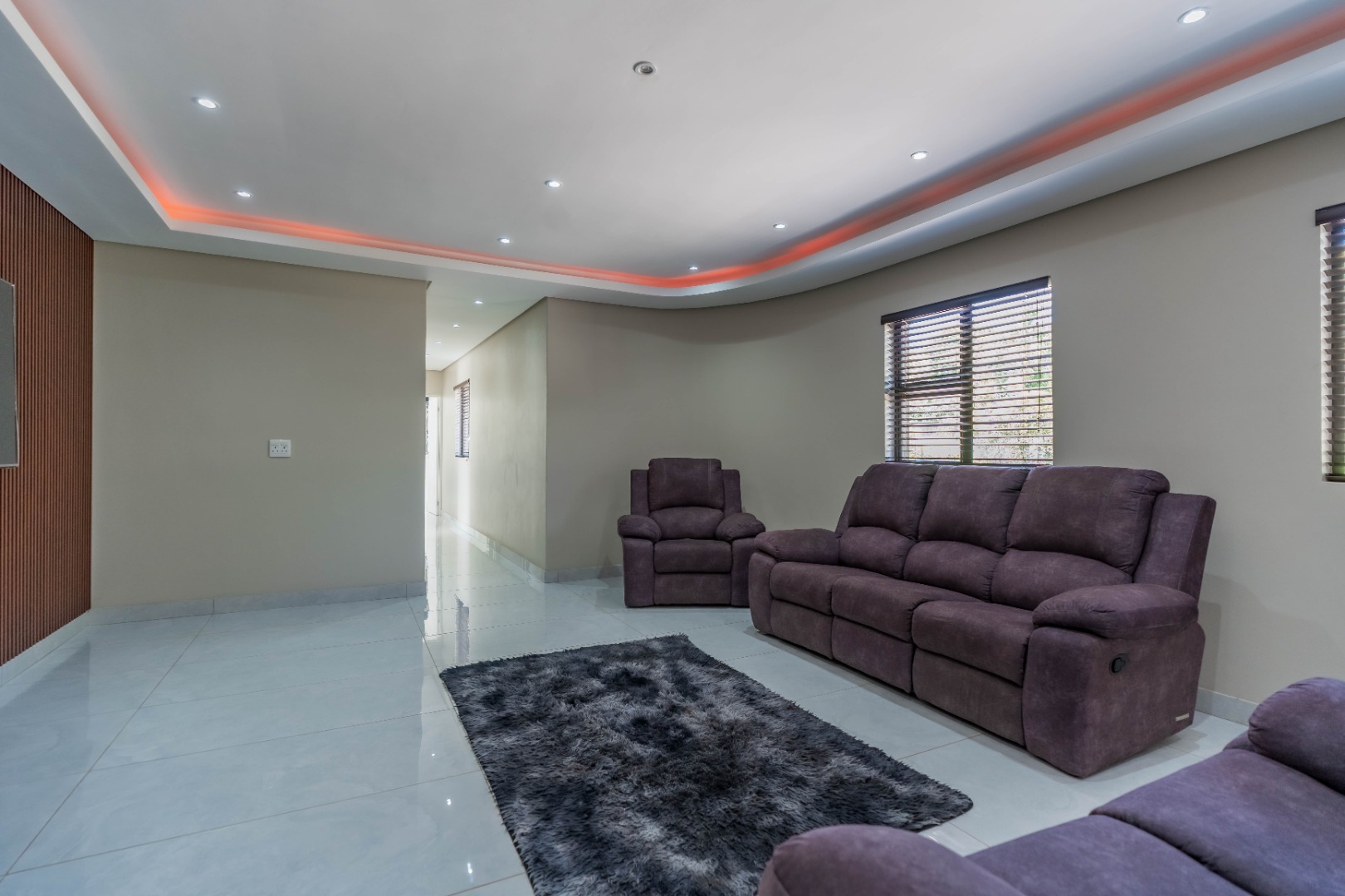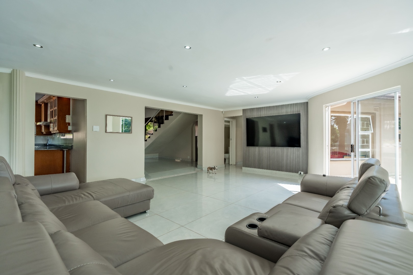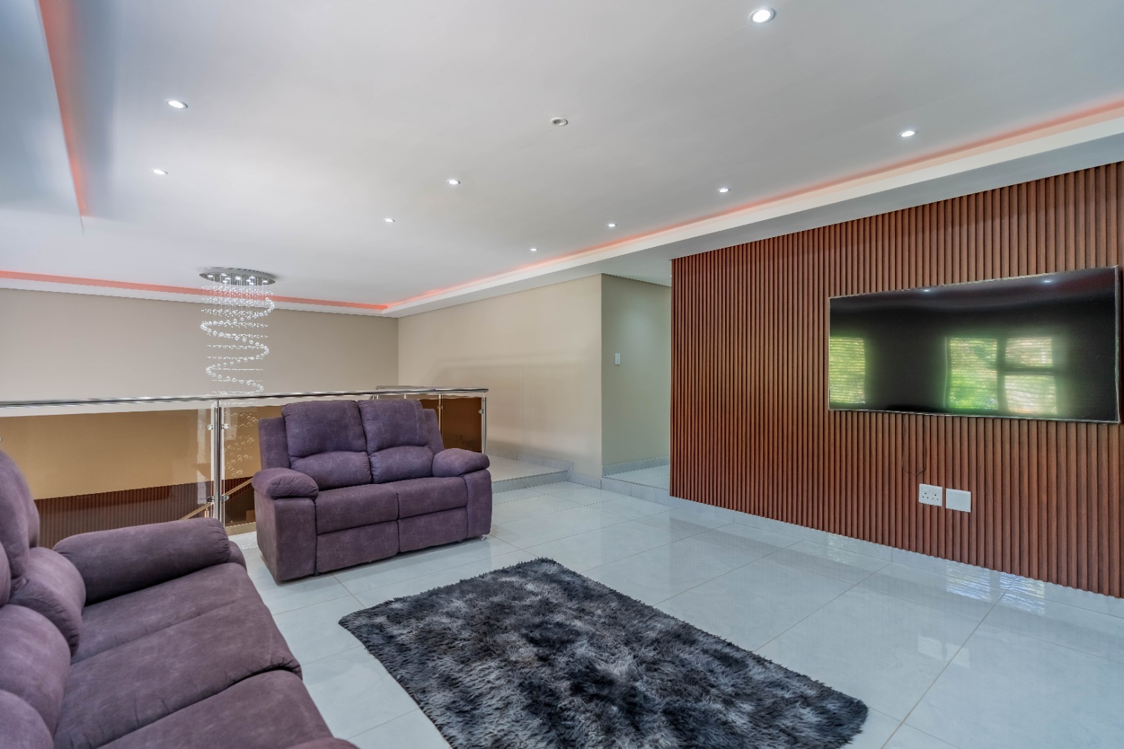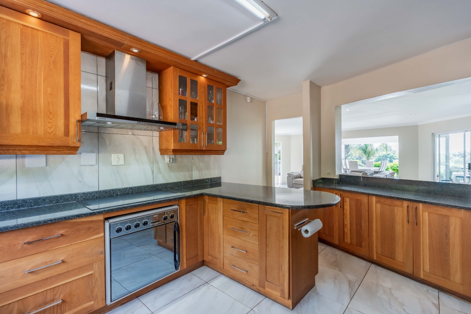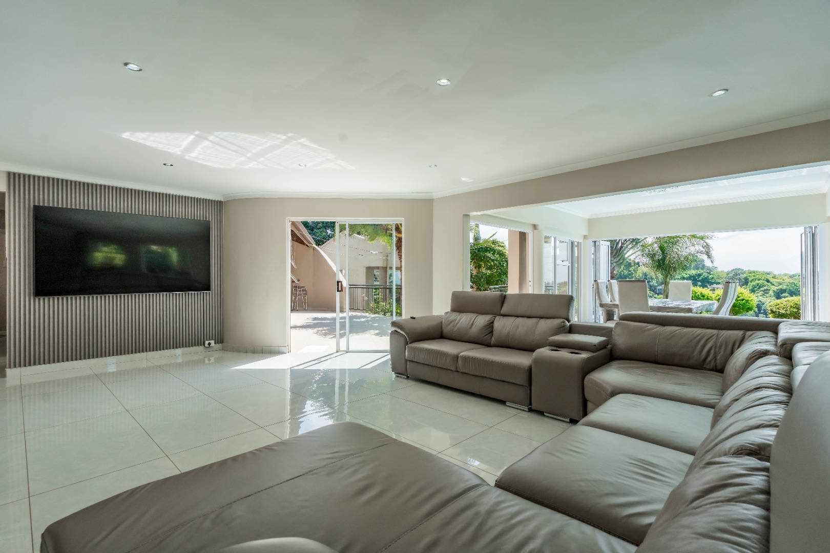 As you enter the home, you are welcomed by a stunning chandelier and impressive double-volume ceilings, creating a grand first impression. The main lounge and dining area flow seamlessly out onto a beautiful rim-flow pool, overlooking the lush garden and offering stunning nature views. The property also features a fantastic entertainment area, perfect for hosting family and friends.