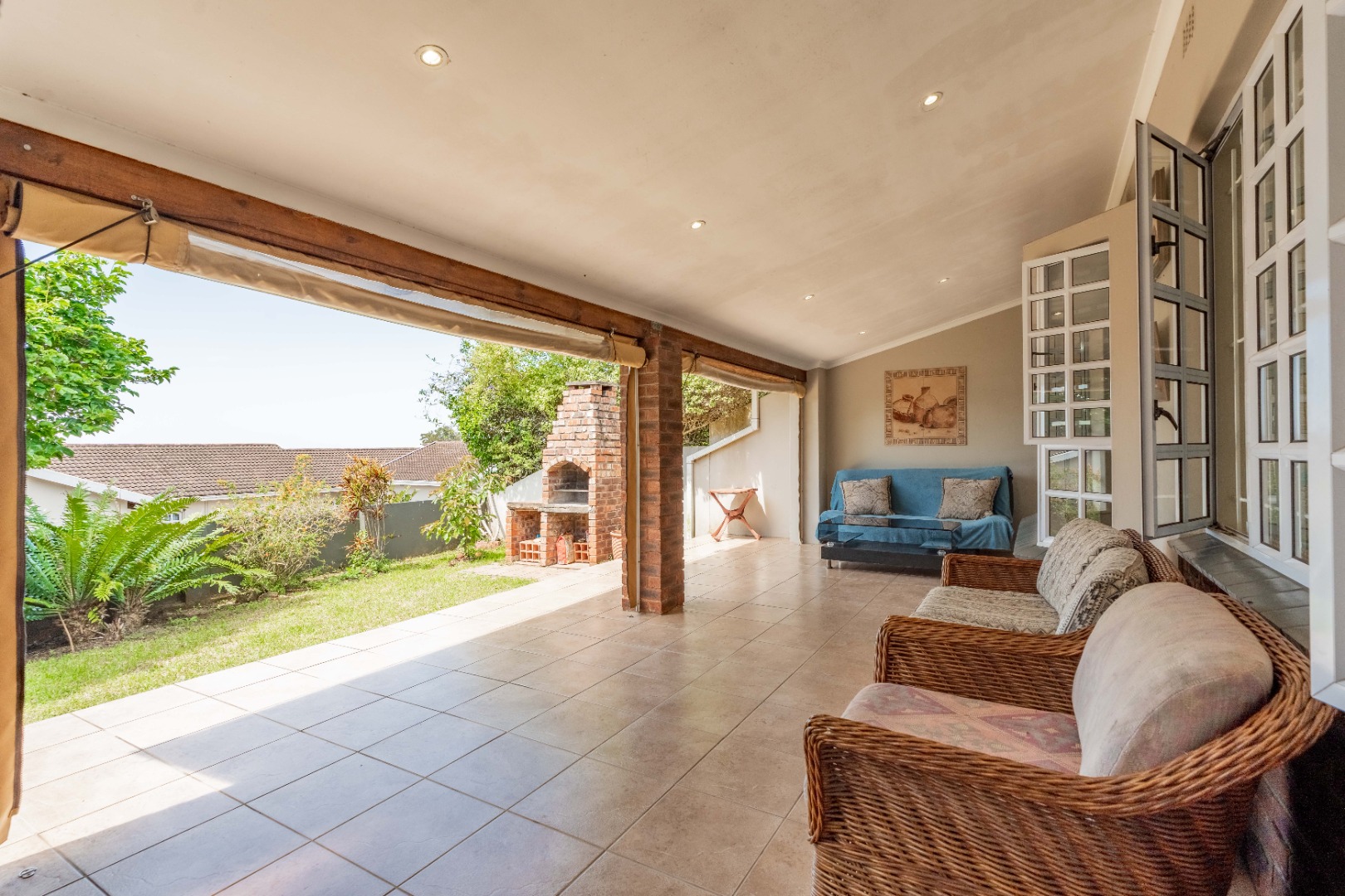 The living area opens onto a covered entertainment patio with a built-in braai and a private garden — perfect for relaxed family living. Down the passage are three generously sized bedrooms and two and a half bathrooms, including a main en-suite.