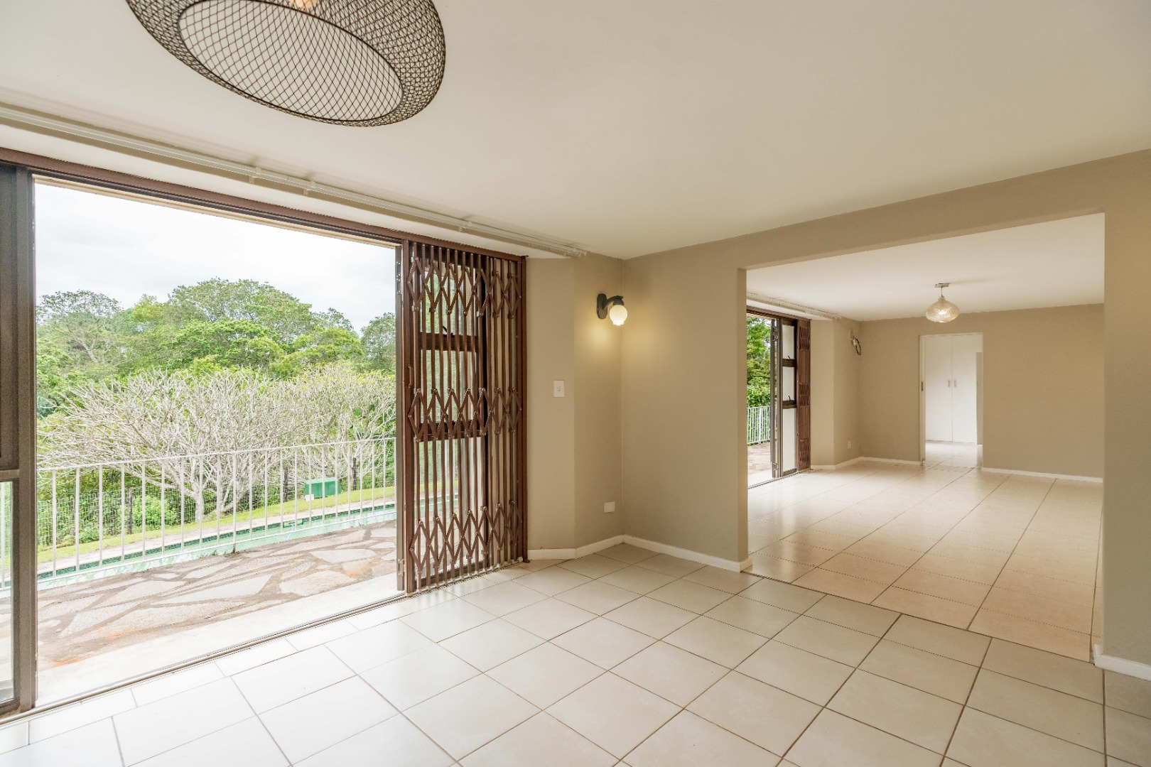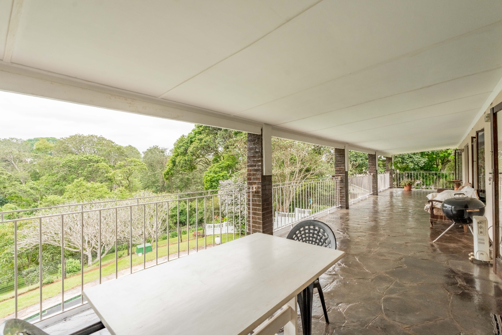 The Entertainer's View : The full-length patio offers serene, elevated views over the grounds and the swimming pool below, a beautiful backdrop for family life.