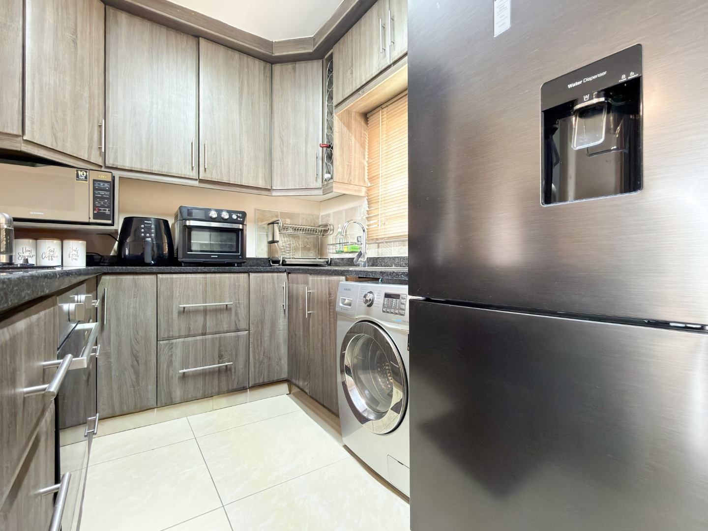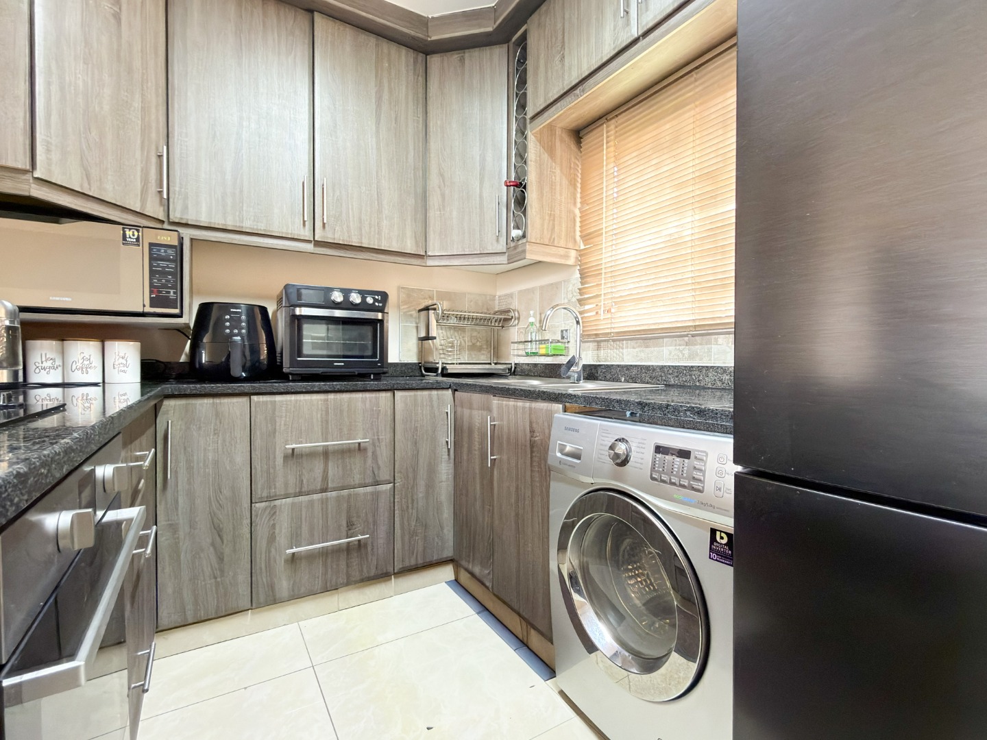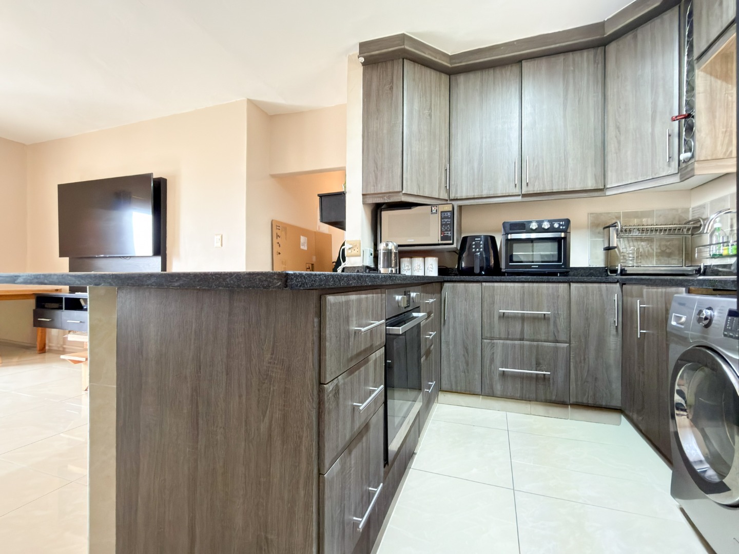 This property welcomes you with a beautifully renovated open-plan kitchen, complete with sleek granite countertops, built-in cupboards, a built-in oven, and a hob.