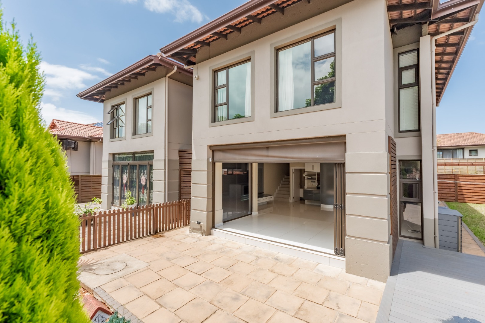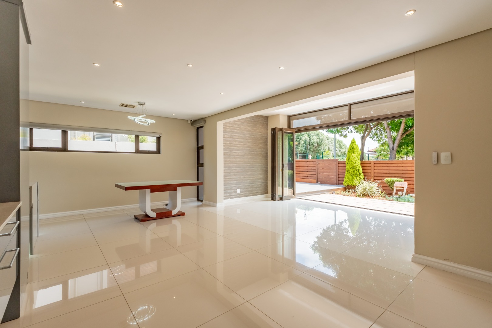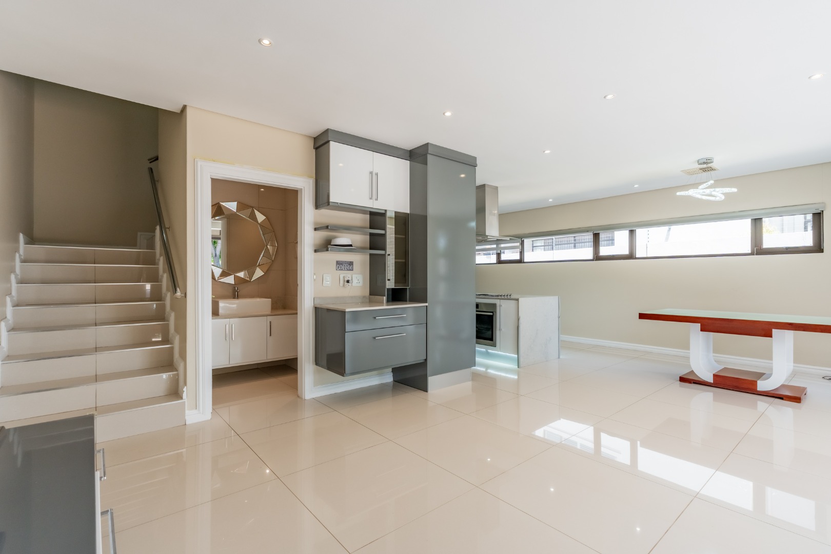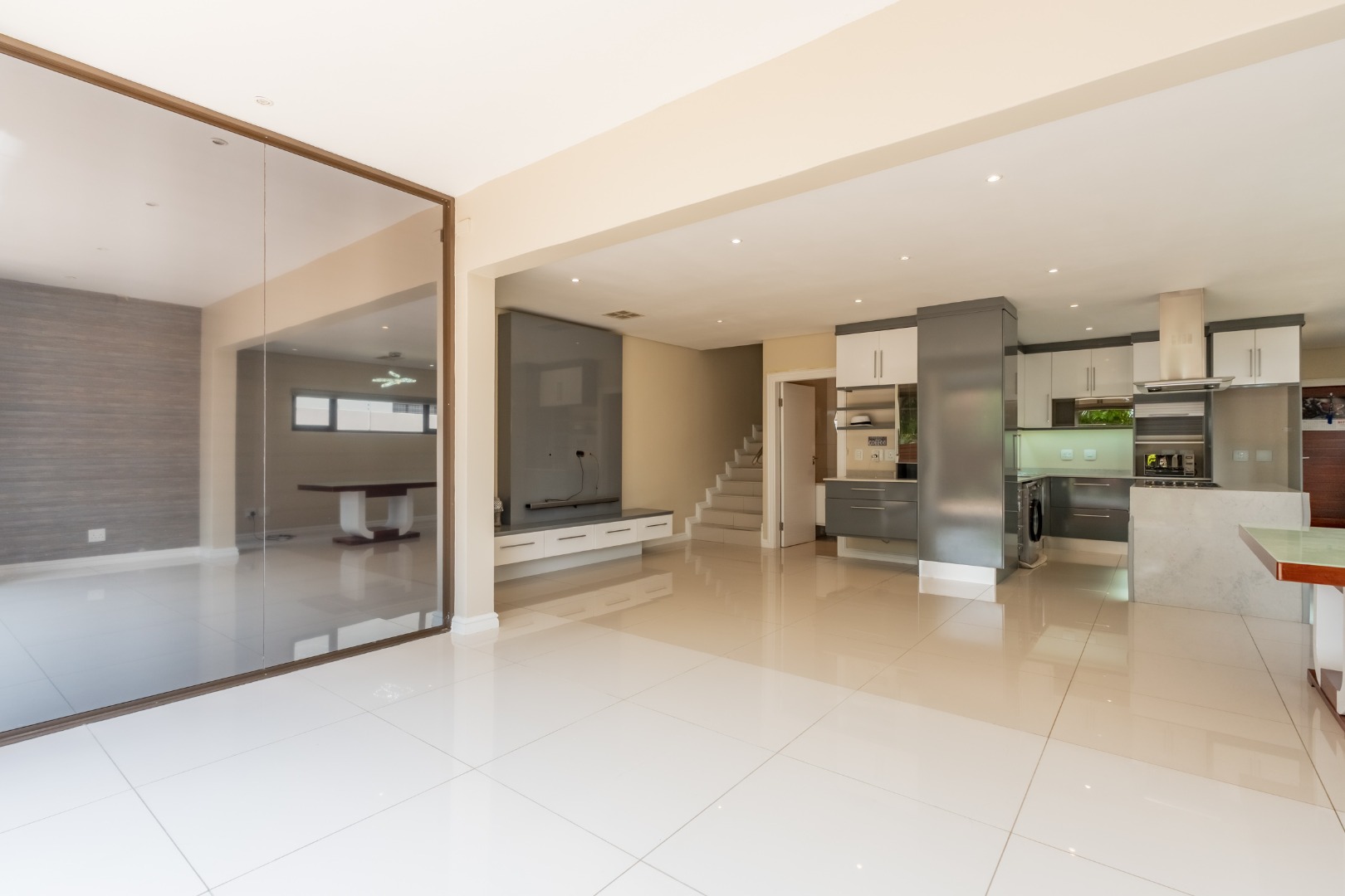 The downstairs floor plan is a seamless integration between the kitchen, lounge and dining room extending into an enclosed patio with stack doors opening up onto a large private garden with built in braai. The perfect space to entertain friends and family.