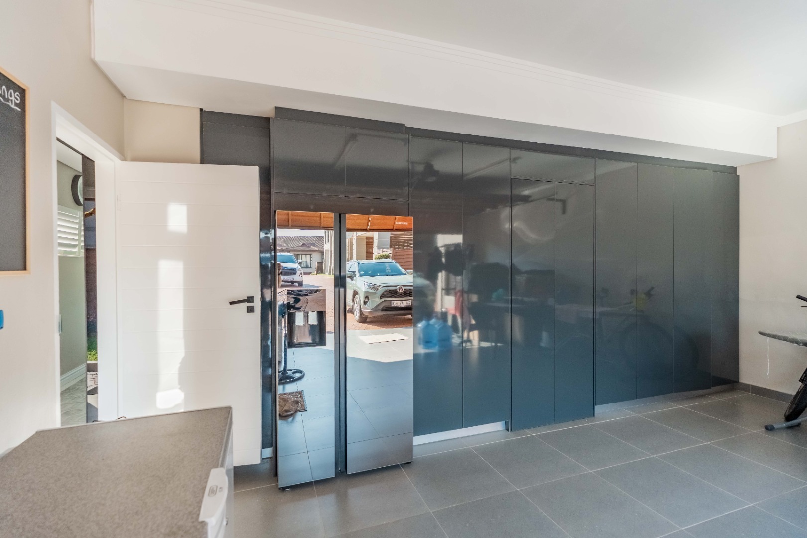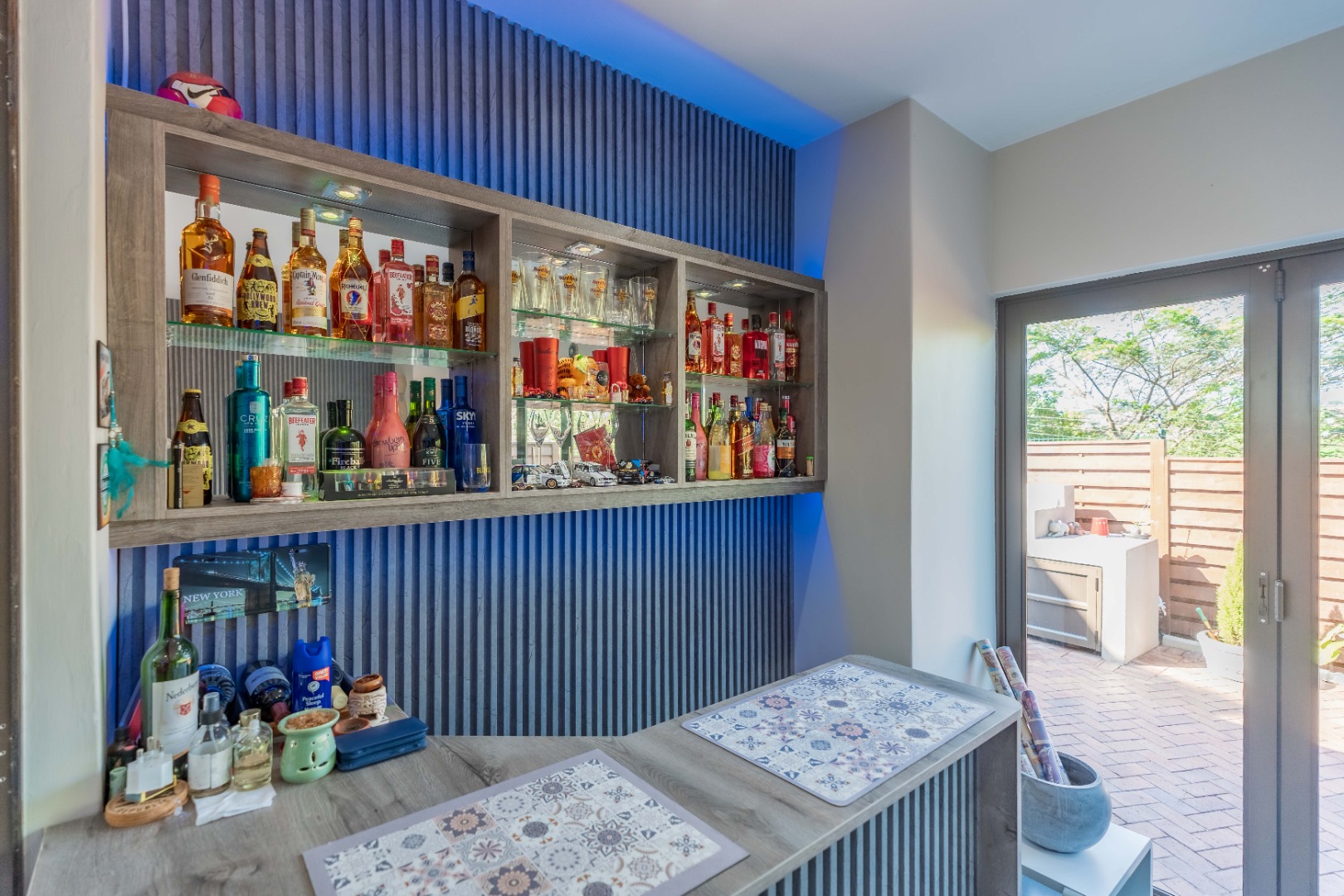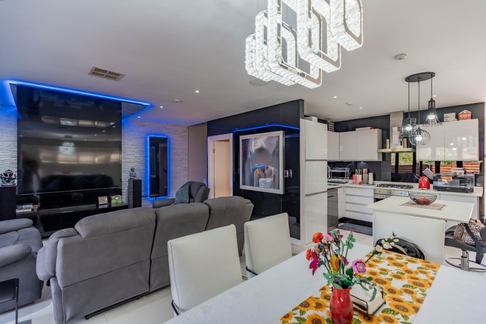 The double garage offers direct access into the home, leading into a spacious open-plan layout. The kitchen is fully fitted and includes a breakfast nook, flowing effortlessly into the dining and lounge areas, and out onto a covered patio with automated curtains and blinds and a built in bar, ideal for easy entertaining.