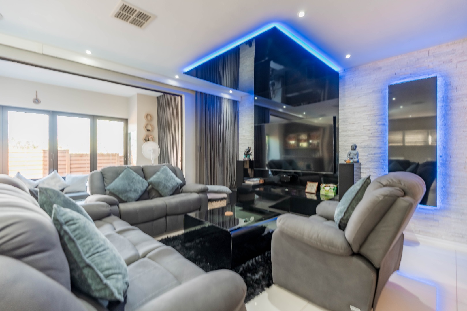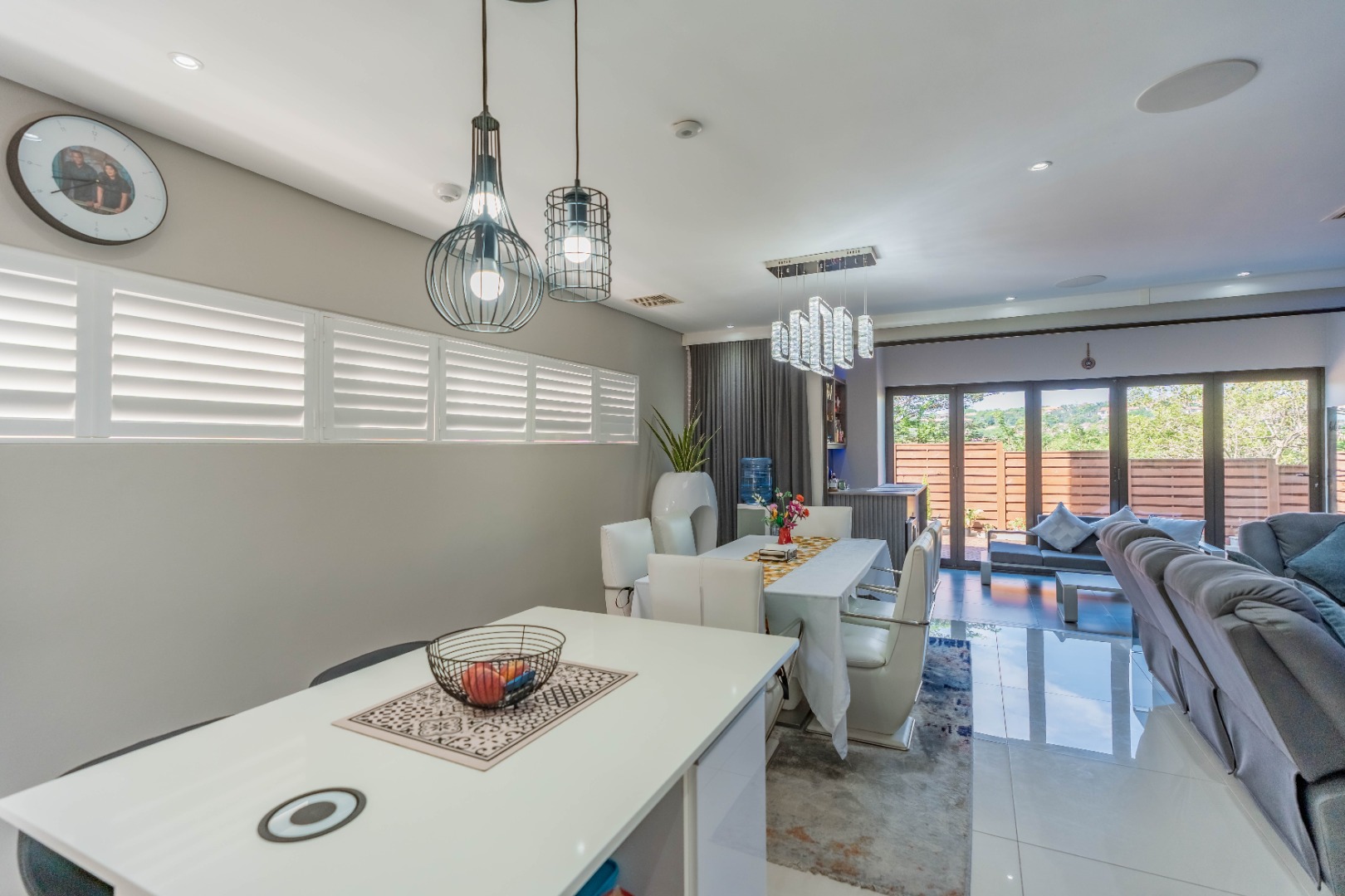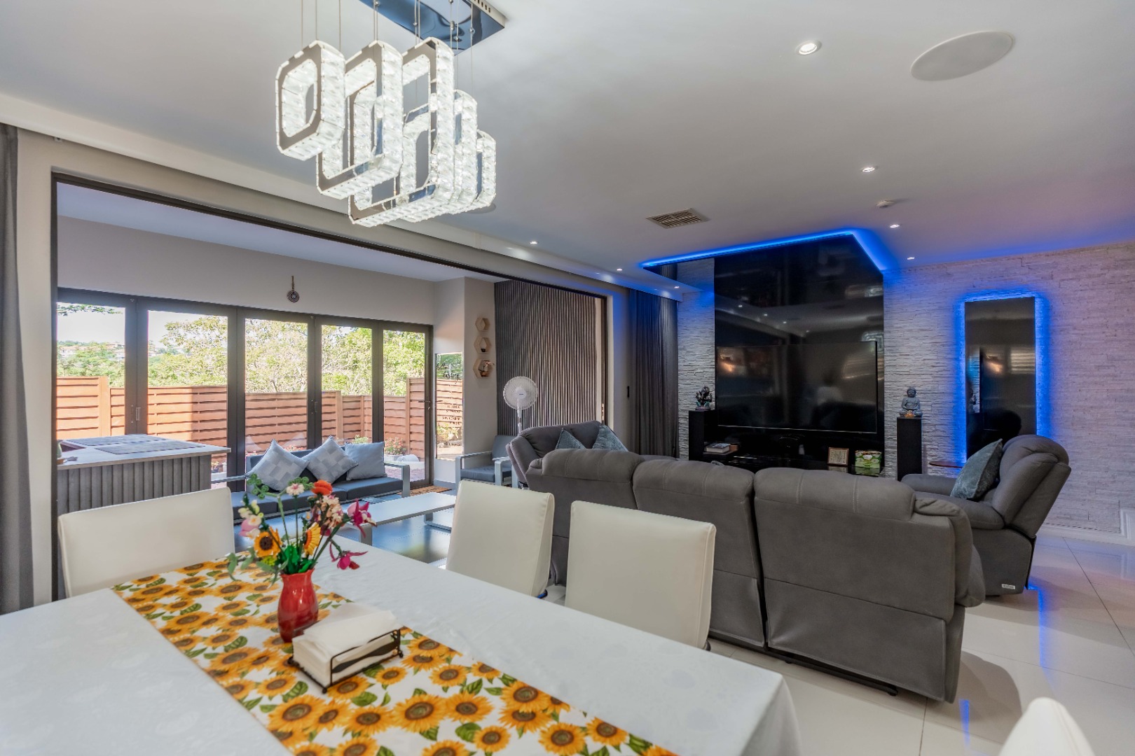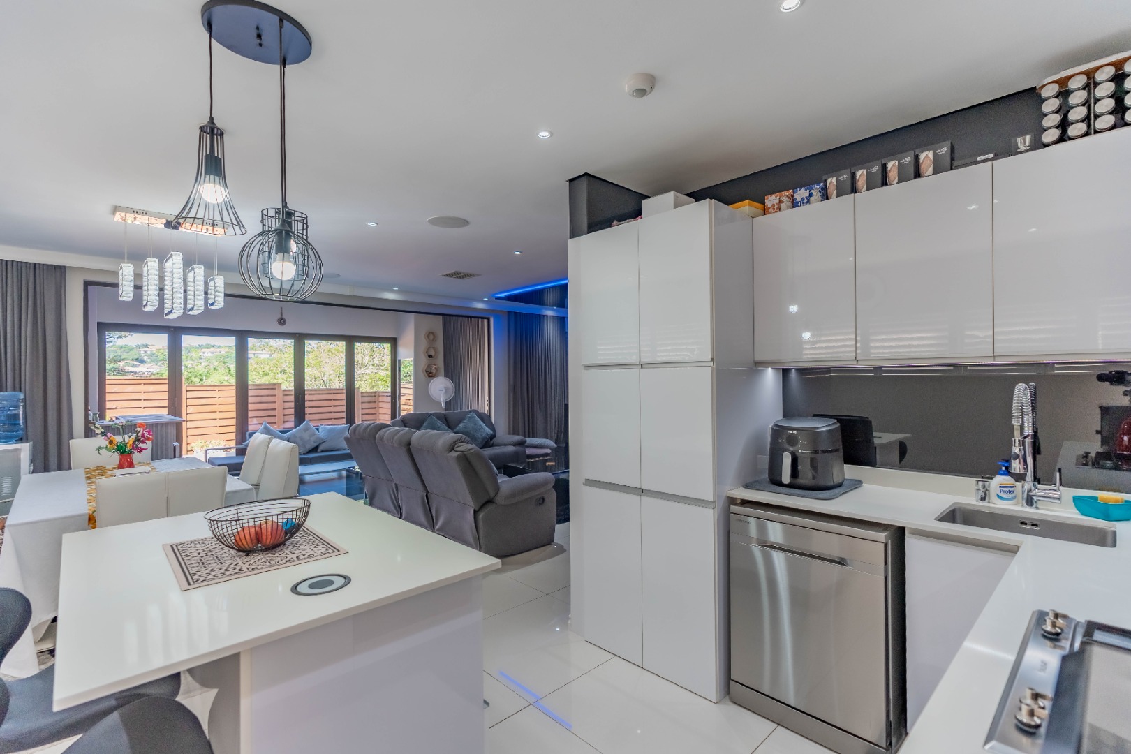 The double garage offers direct access into the home, leading into a spacious open-plan layout. The kitchen is fully fitted and includes a breakfast nook, flowing effortlessly into the dining and lounge areas, and out onto a covered patio with automated curtains and blinds and a built in bar, ideal for easy entertaining.