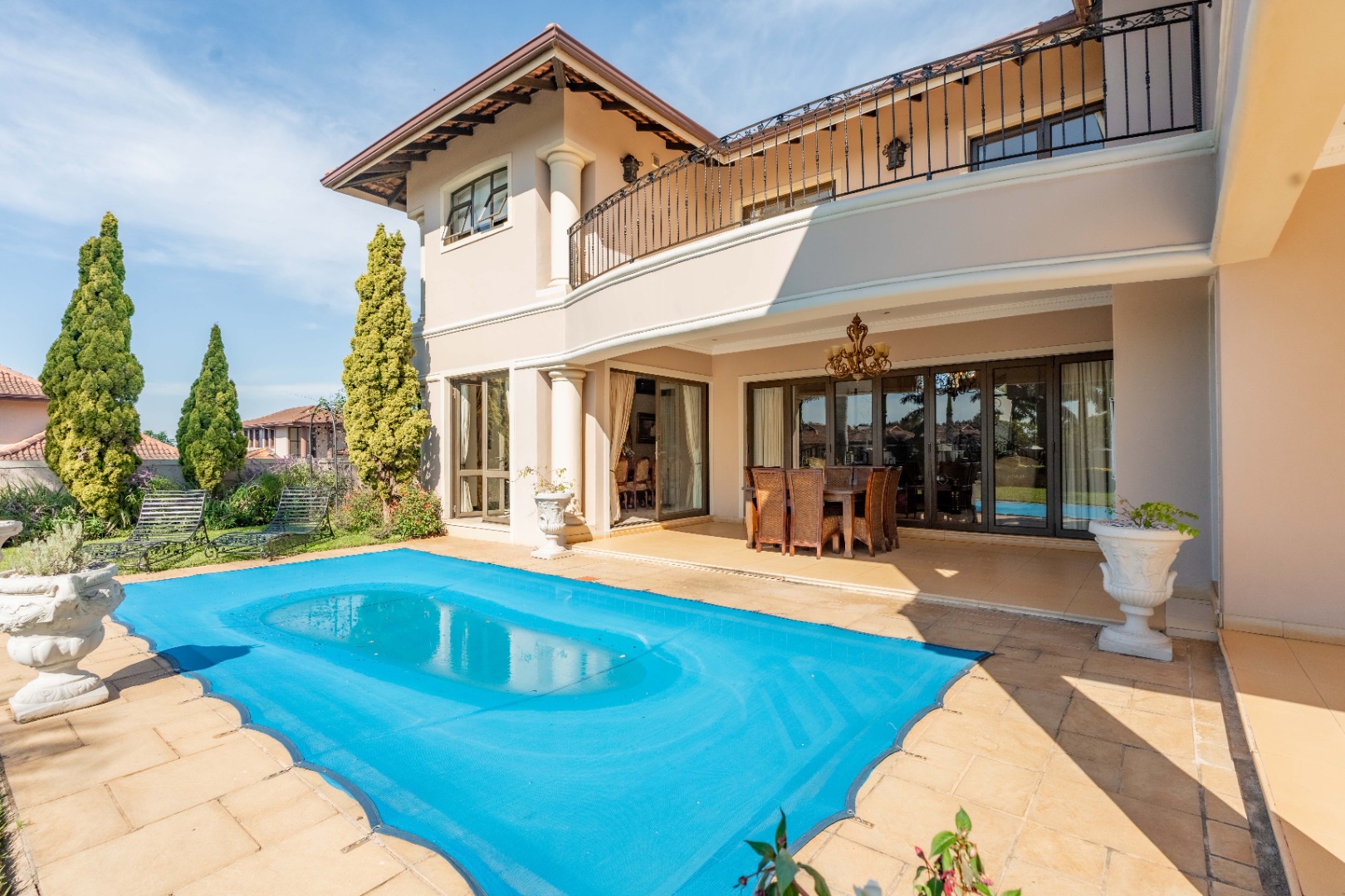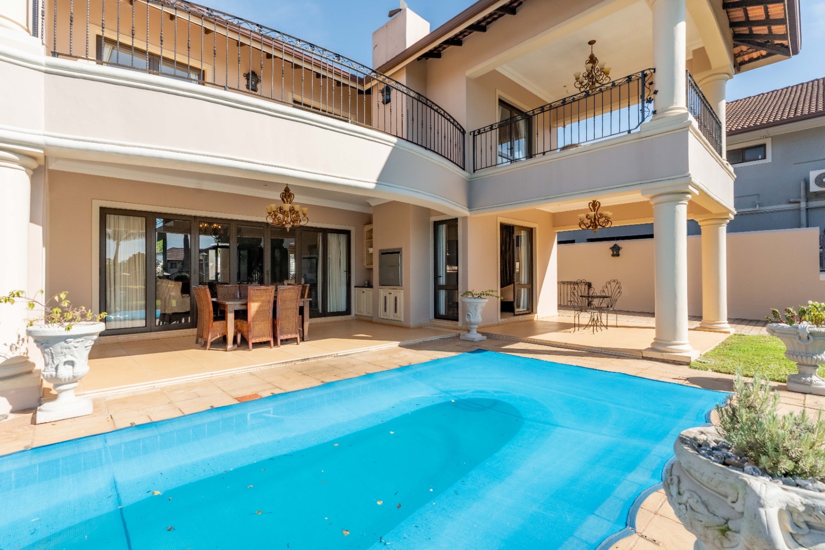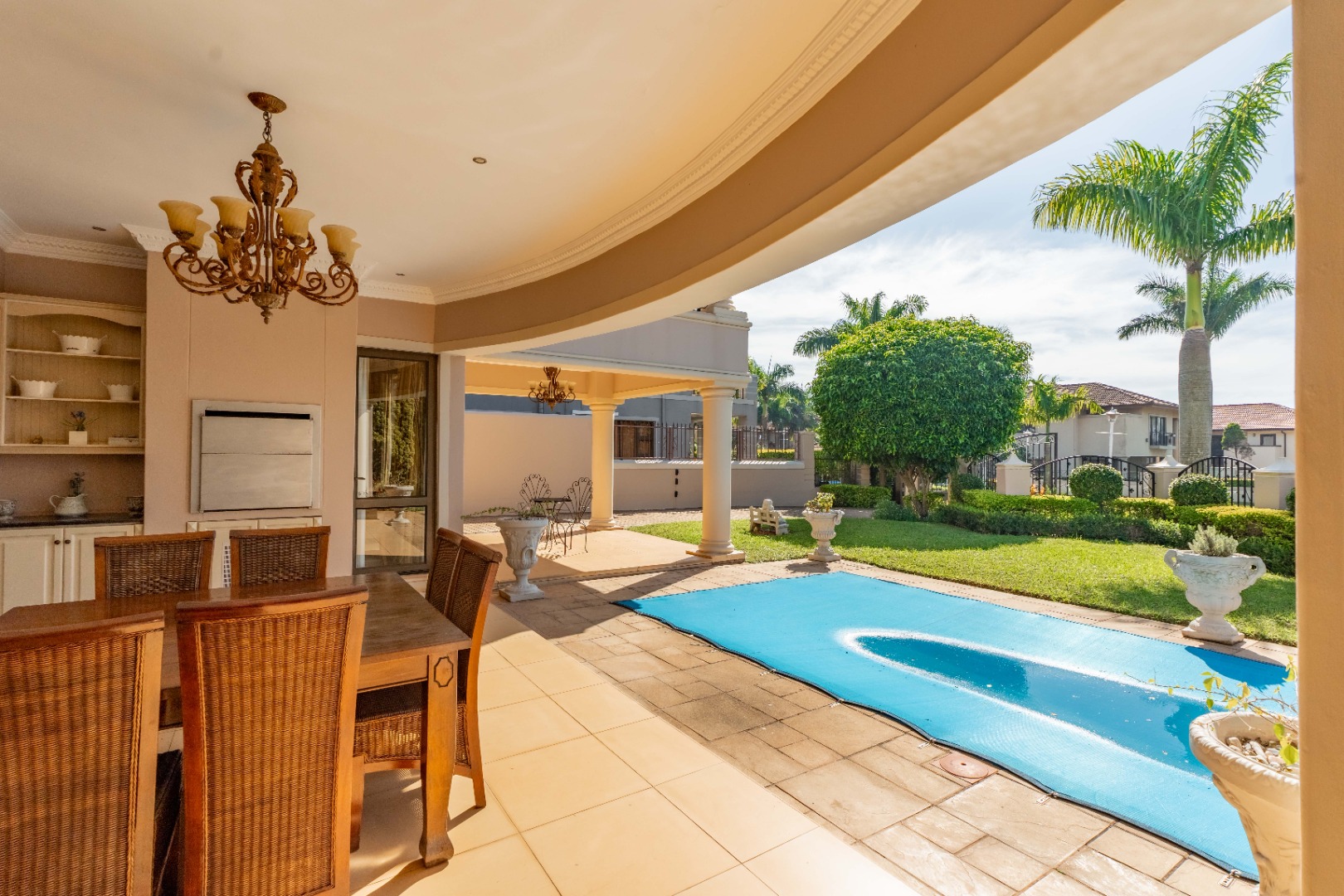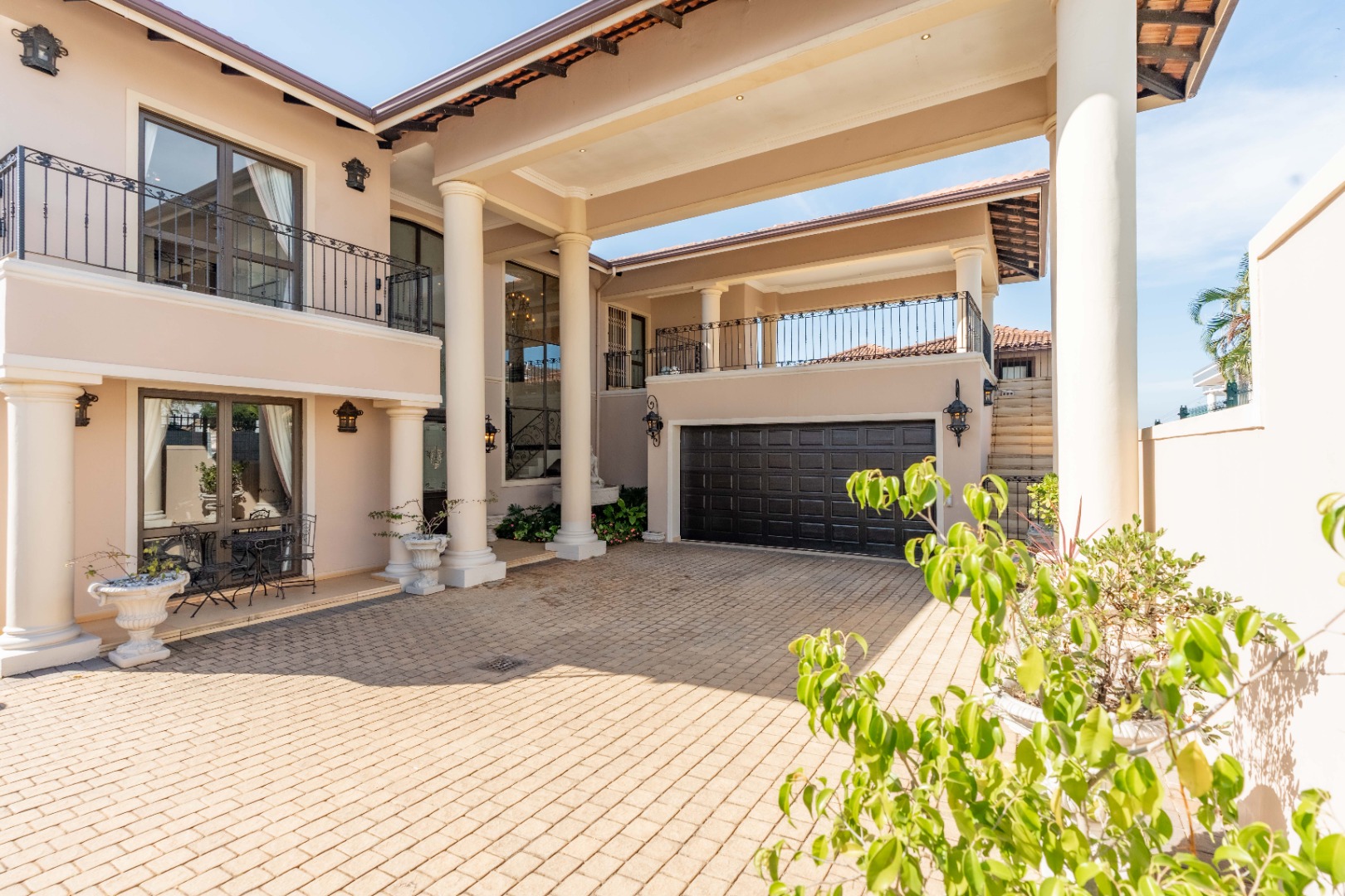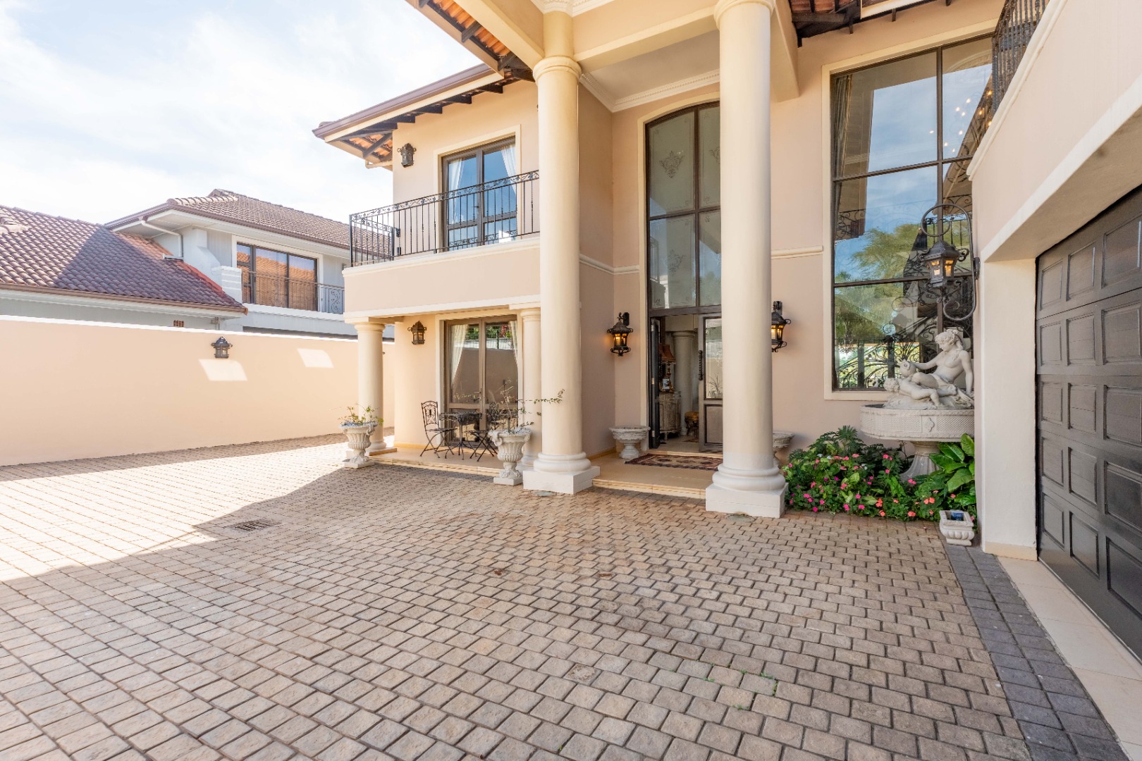 A double garage accommodates two vehicles, with additional space for up to six cars, ensuring convenience for residents and guests alike. Situated within a secure estate, this home is a rare fusion of Tuscan elegance and modern coastal living, offering a unique opportunity to own a piece of timeless beauty in one of Durban's most sought after locales.