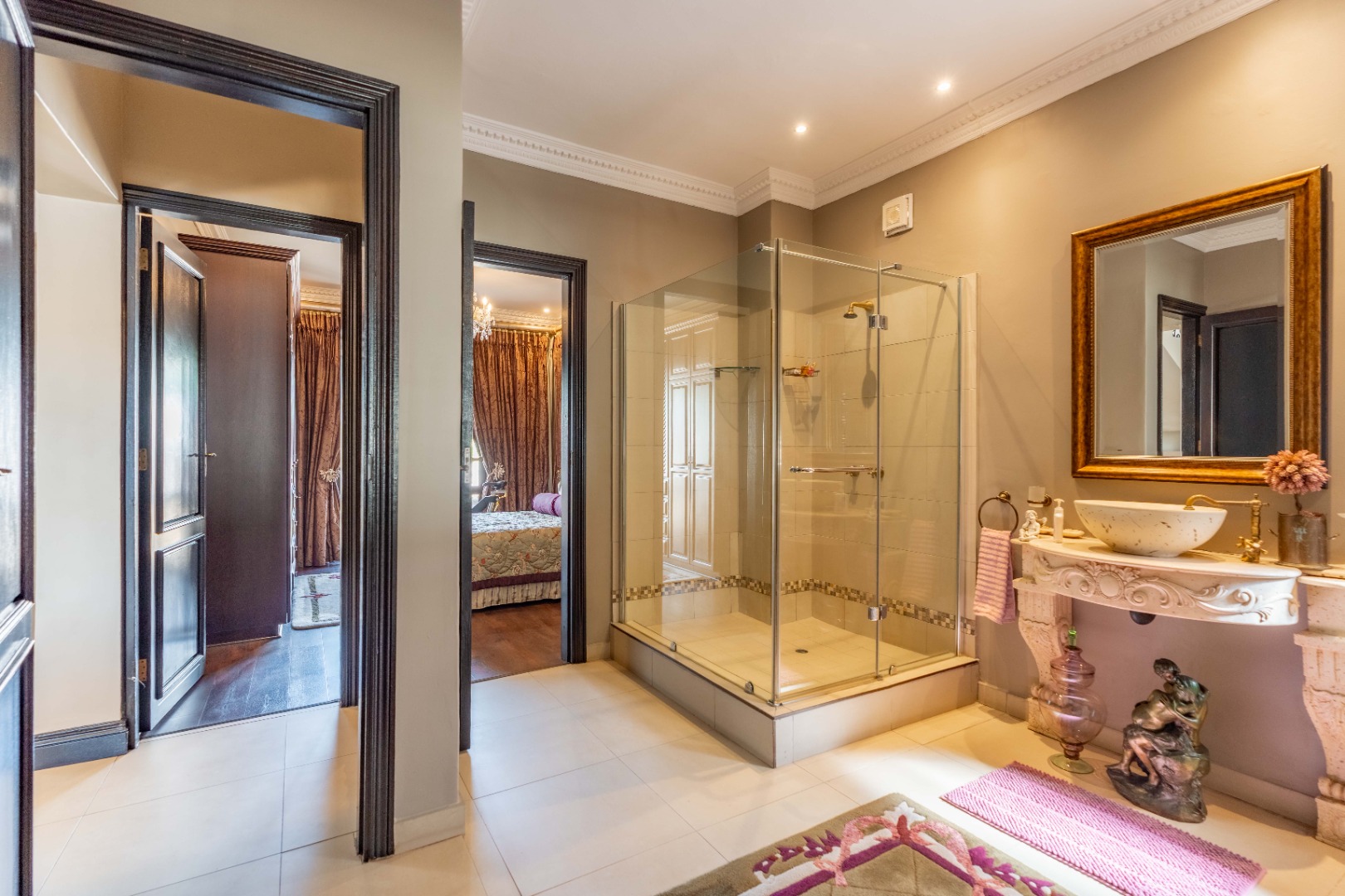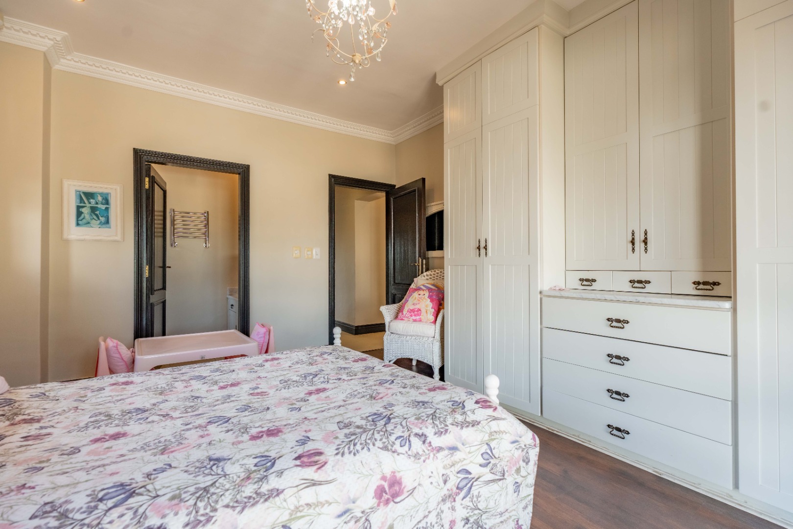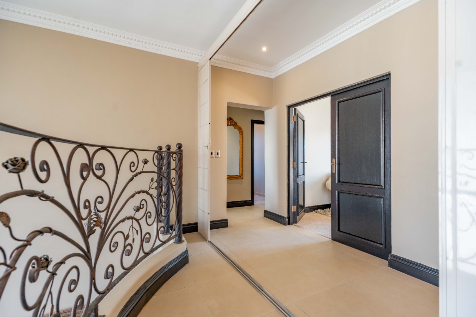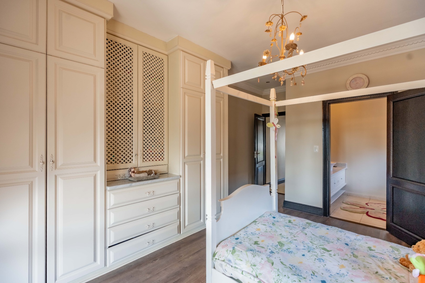 The downstairs floor plan is completed by a 4th ensuite bedroom, with the spacious upstairs featuring 3 bedrooms, each with ensuite bathrooms, providing a peaceful retreat. The main bedroom is generous in size with a private lounge and walk-in closet.