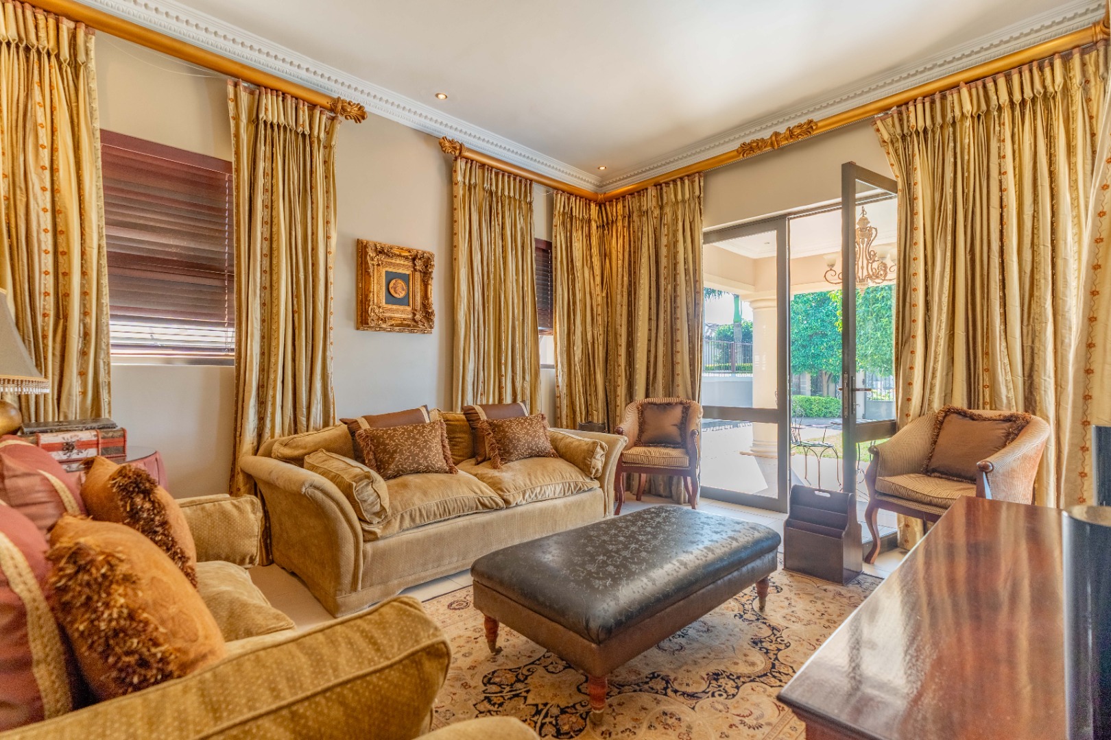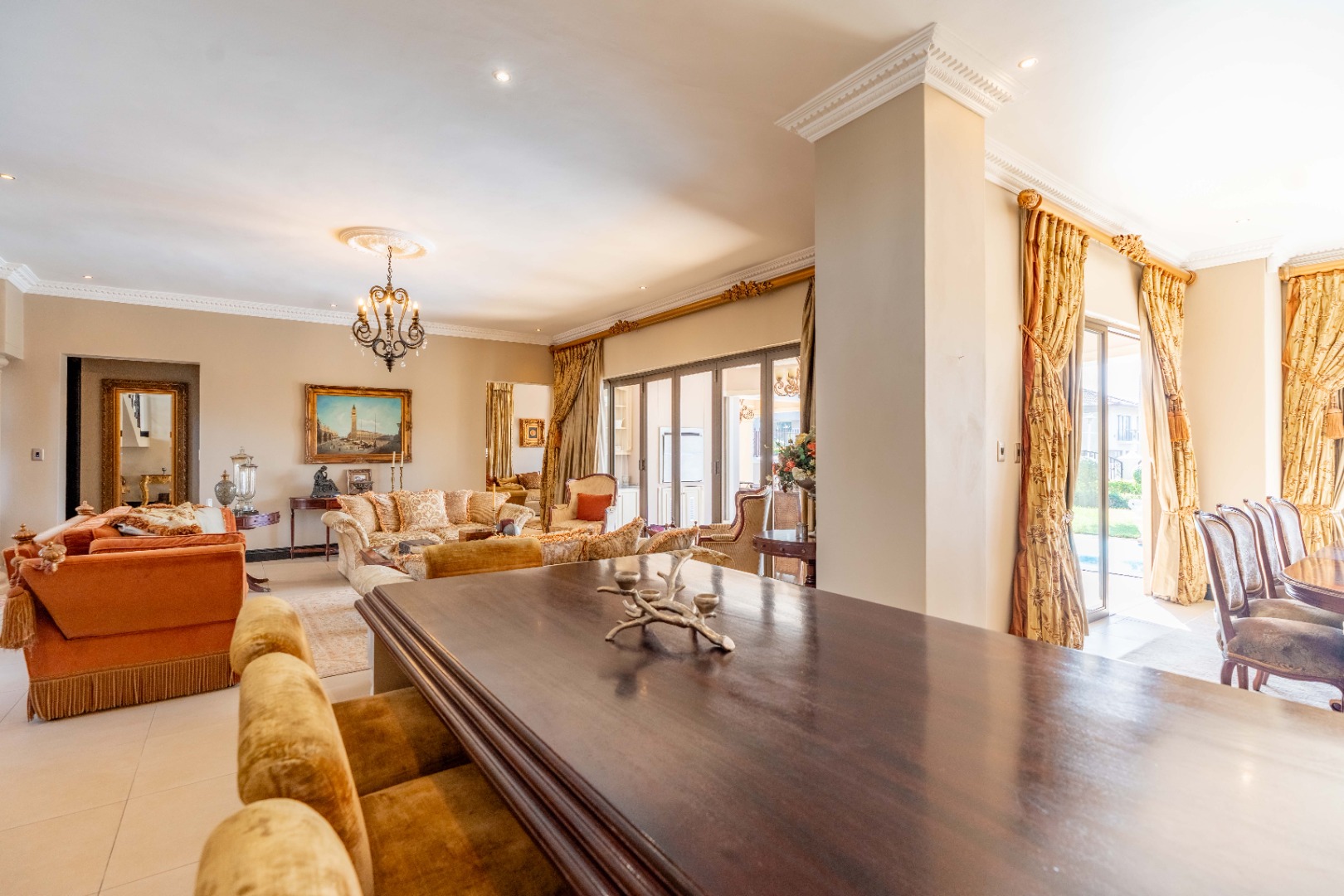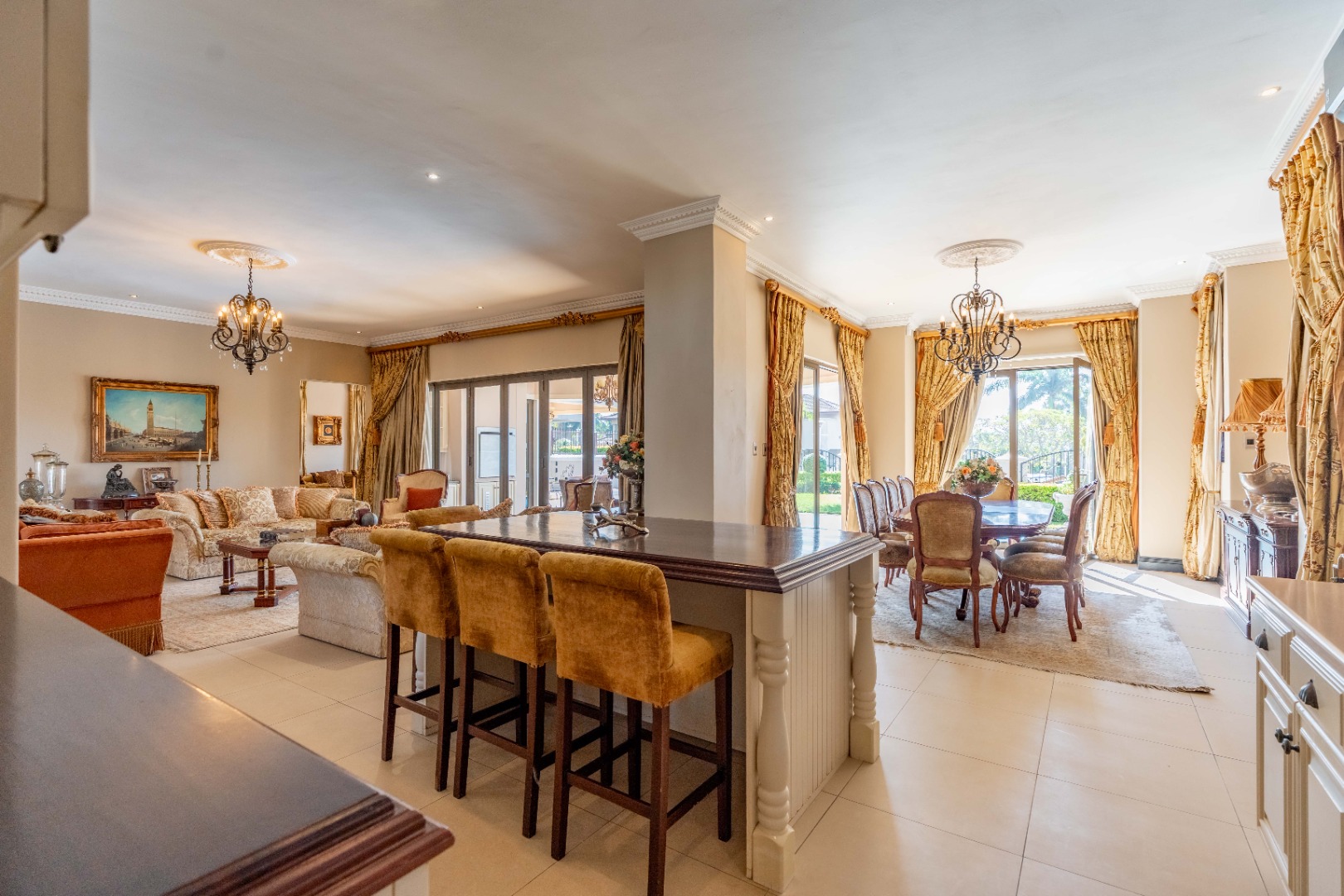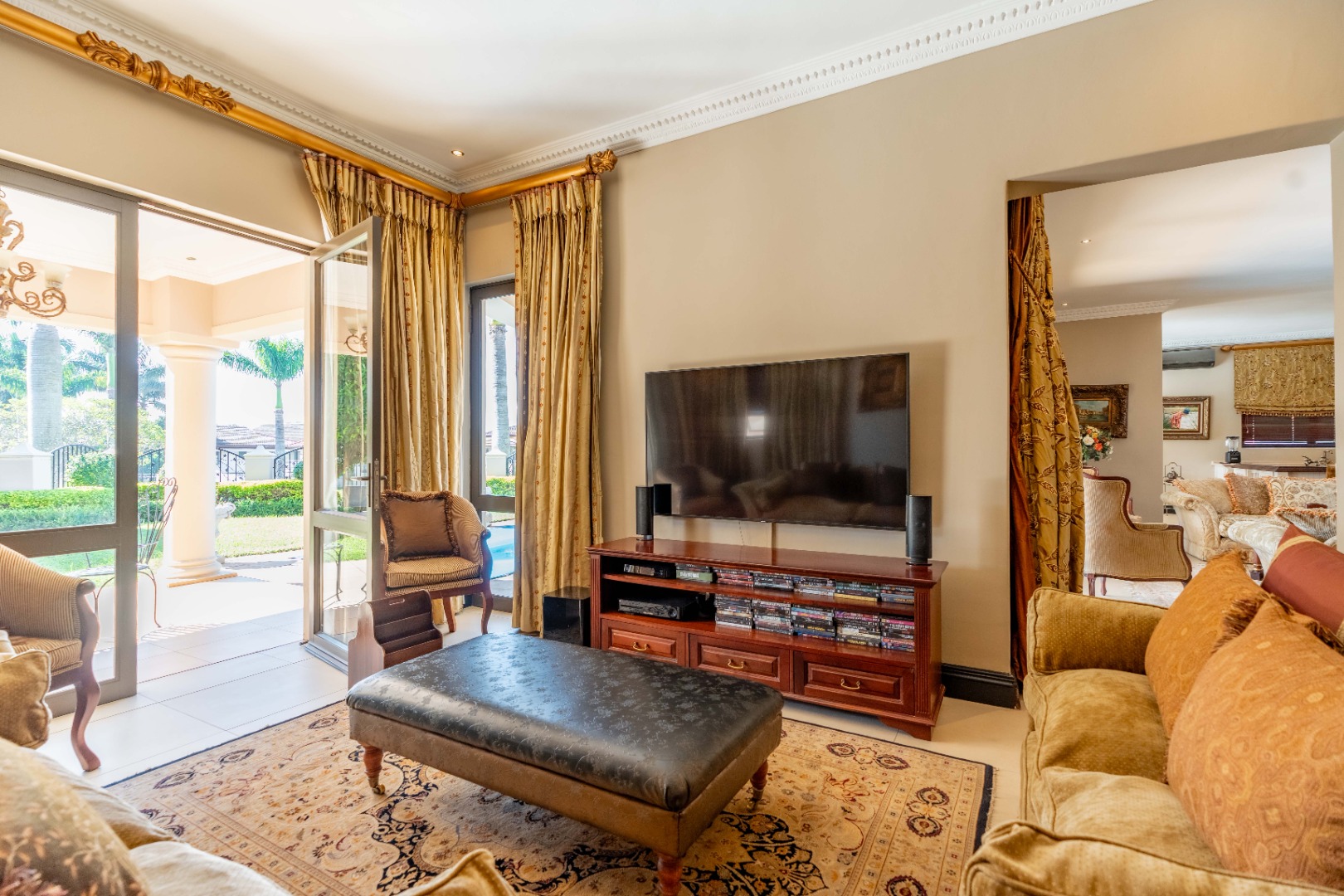 Step through the grand entrance into an expansive open plan living area where a light filled lounge and dining room seamlessly flows towards a gourmet kitchen beautifully finished with high-end fittings and a separate scullery, the heart of the home. Beyond lies a sparkling pool, framed by a manicured garden. A dedicated TV room offers a cozy escape for relaxed family time.