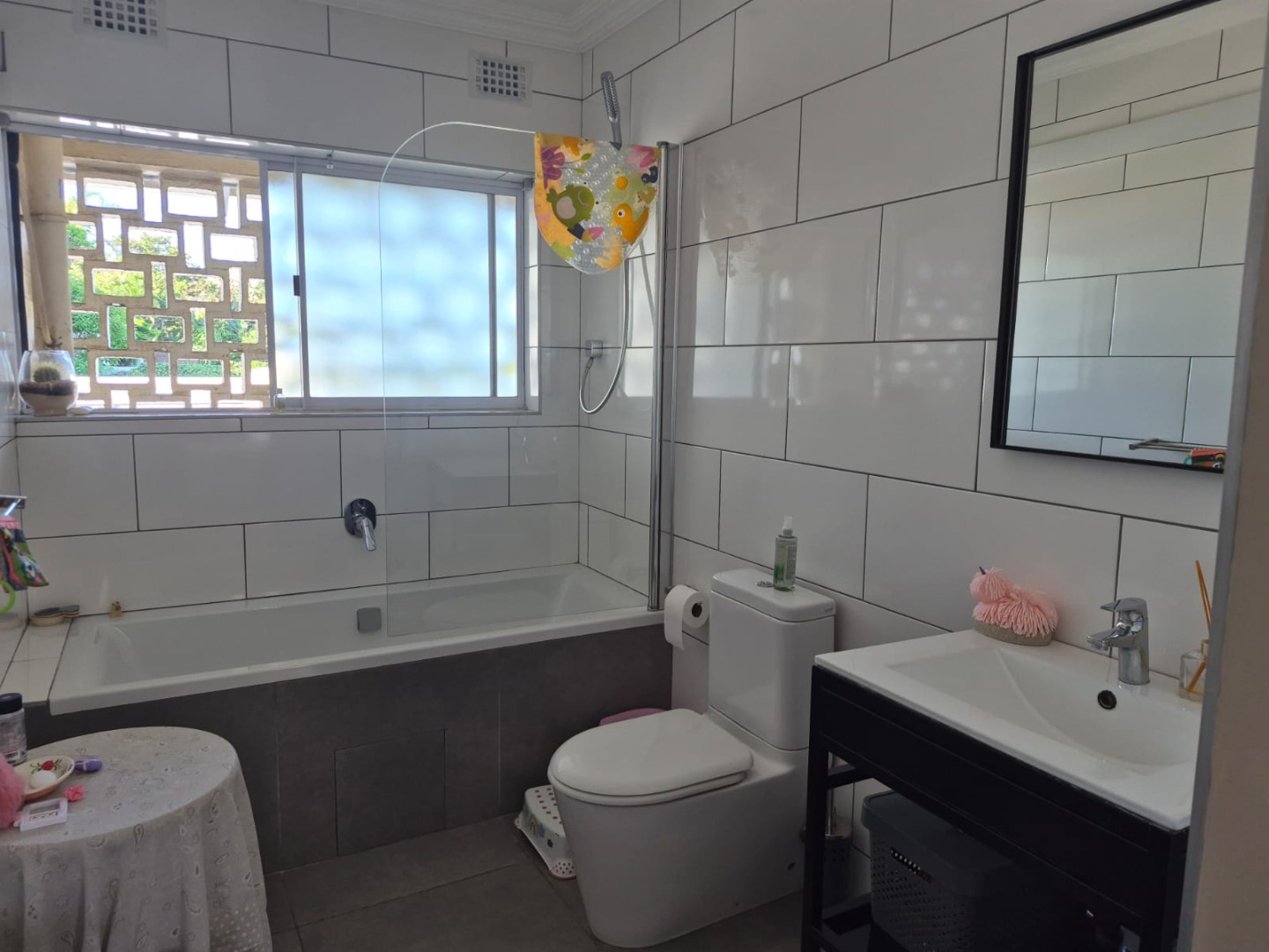 Upstairs, you will find three well-sized bedrooms along with a linen cupboard in the hallway. The spacious main bedroom includes ample built-in cupboard space, an airconditioning unit and a newly renovated en-suite bathroom, complete with a bath and shower combination and contemporary sanitary ware. The family bathroom services the remaining two bedrooms.