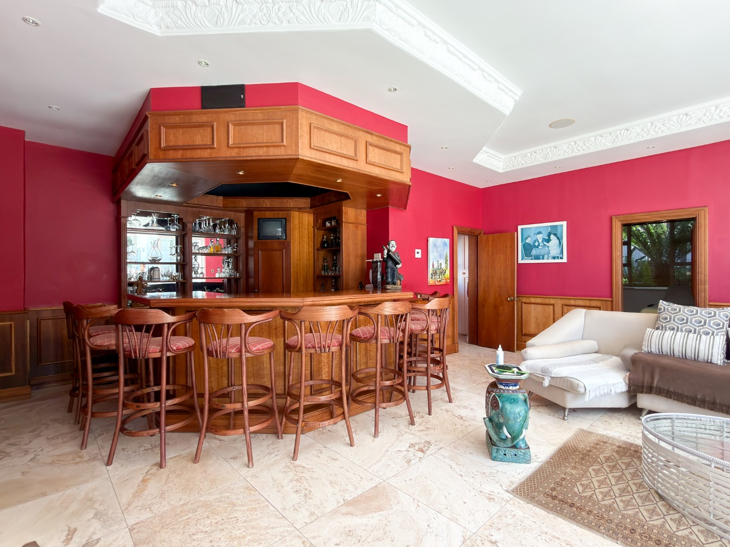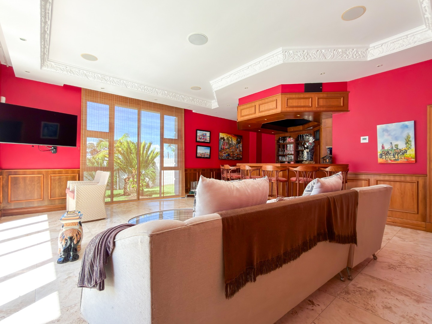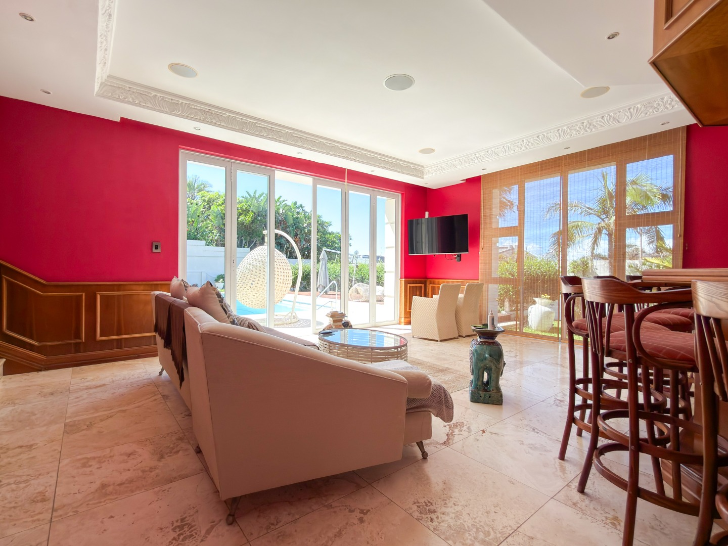 Designed with total relaxation and wellbeing in mind, the residence includes a suite of luxury features such as a fully equipped gym and a dedicated jacuzzi room. A private bar opens into the living areas, while marble finishes extend from the main living spaces to the pool surround, unifying the indoor and outdoor entertainment zones for a seamless lifestyle experience.