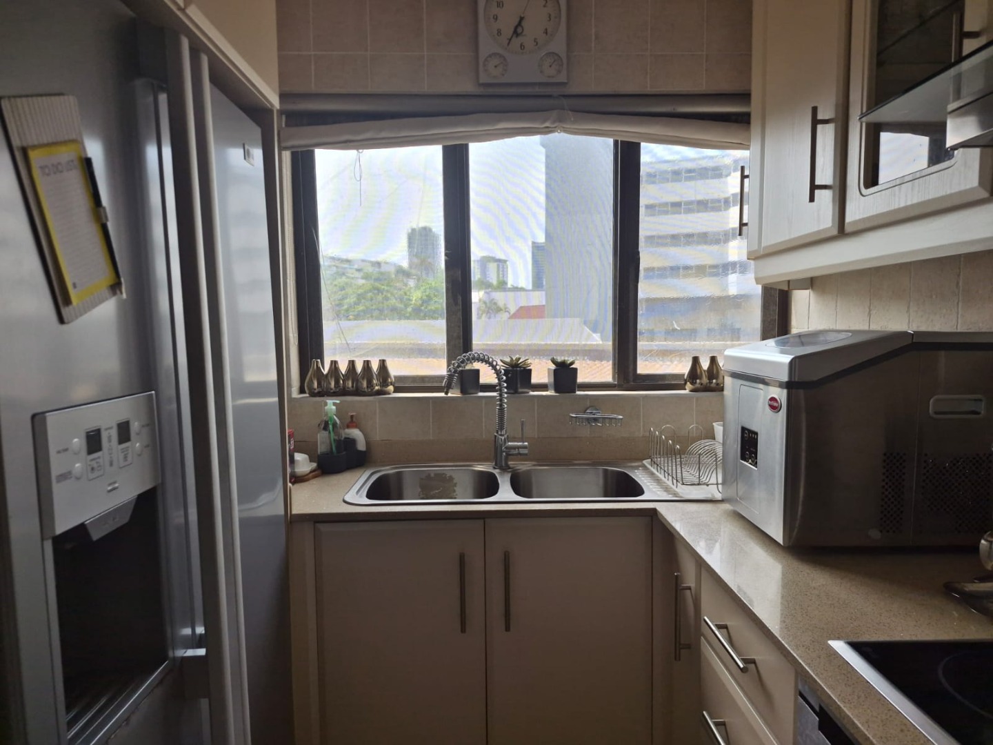 The kitchen is tastefully designed with elegant built-in cupboards, granite countertops, and plumbing for two appliances, making it both functional and stylish. The open-plan living area flows seamlessly onto an enclosed balcony, effectively extending the living space while showcasing breathtaking views of the ocean and the sparkling pool area.