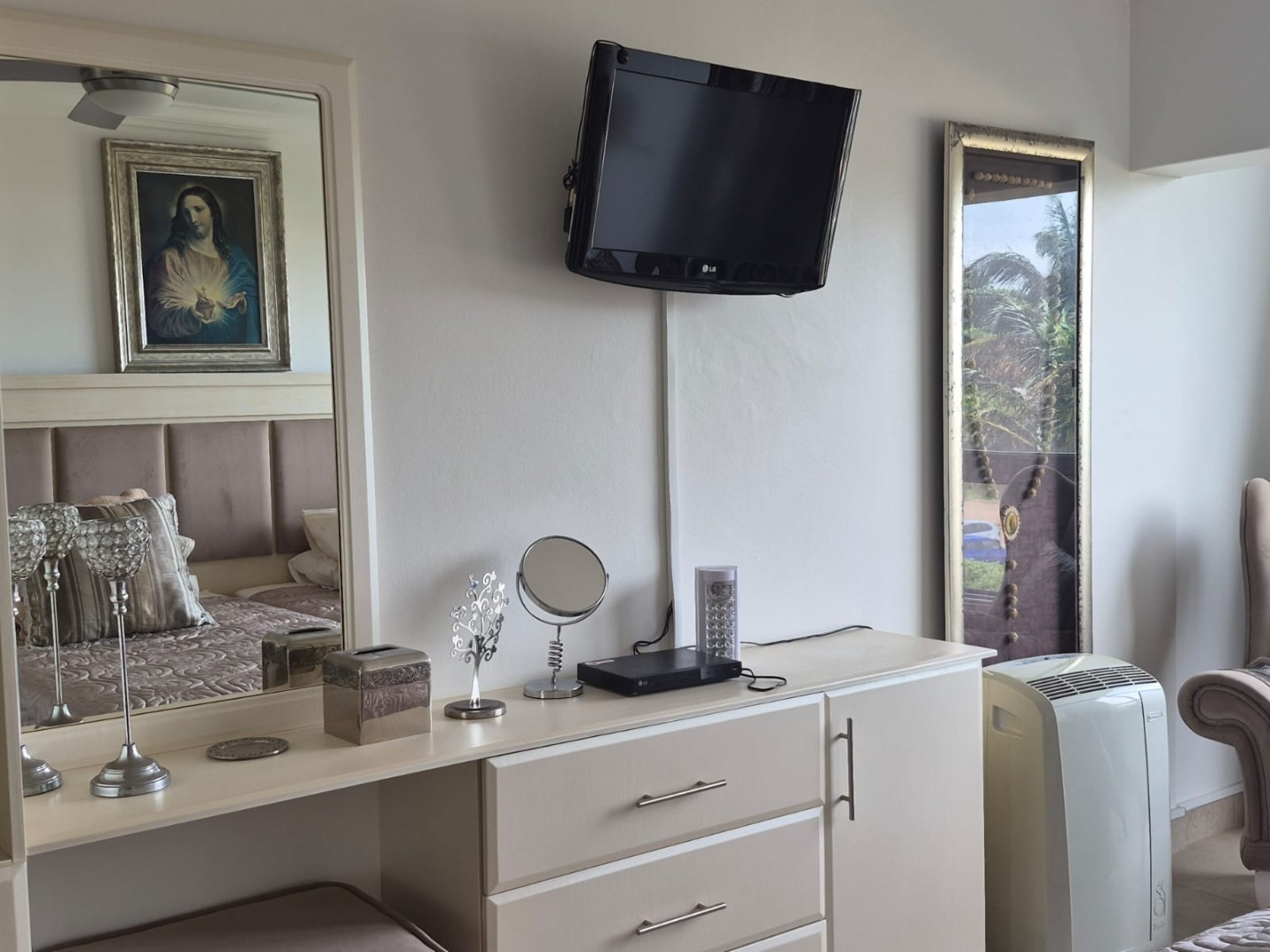 This well-maintained unit boasts two spacious bedrooms, both fitted with ample built-in cupboards. The main bedroom features a modern en-suite bathroom with a shower, while a well-appointed family bathroom services the second bedroom.