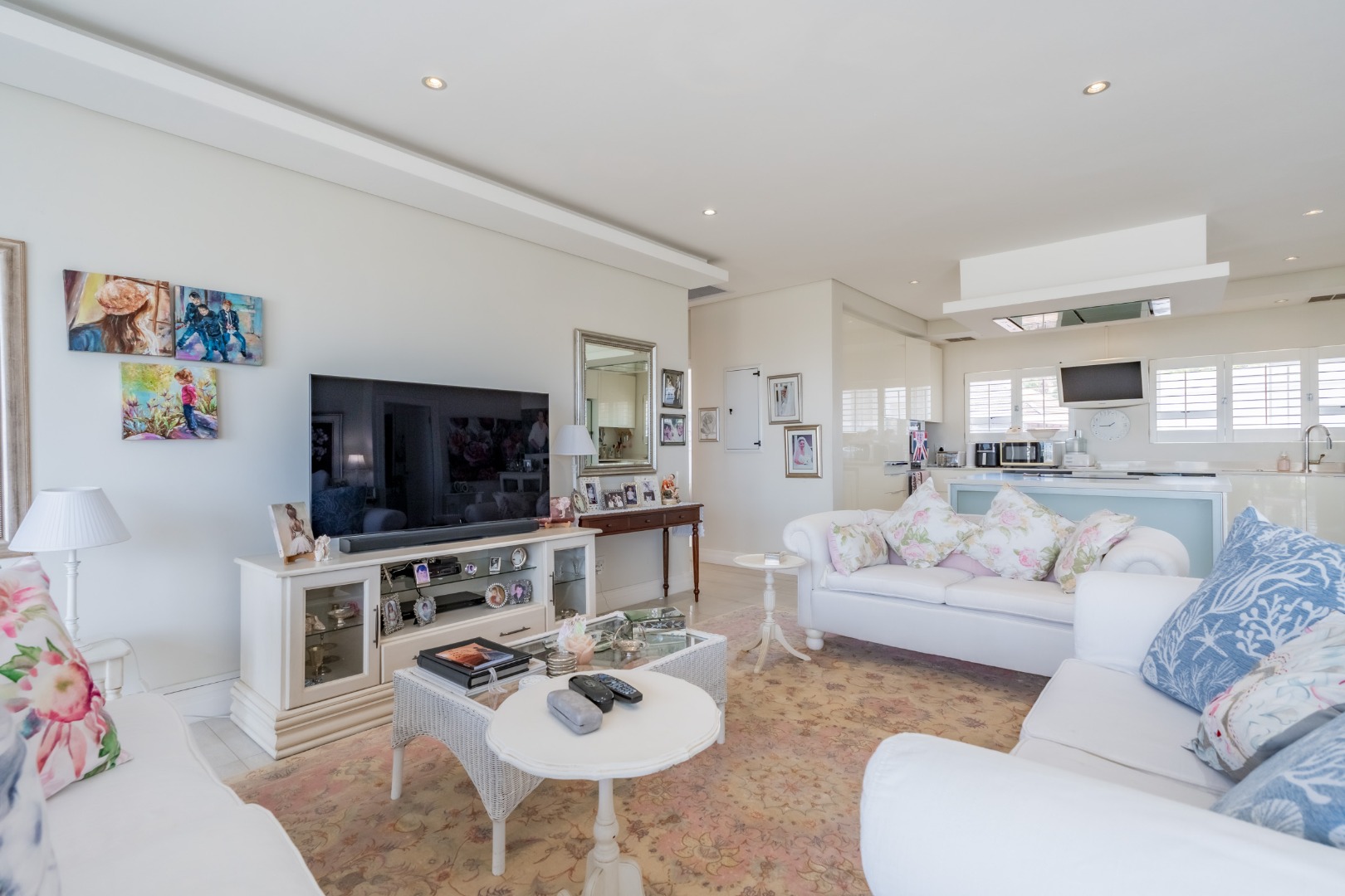 The expansive open-plan lounge and dining area flows effortlessly into a modern white kitchen featuring a centre island and premium Miele appliances ideal for both everyday living and elegant entertaining.