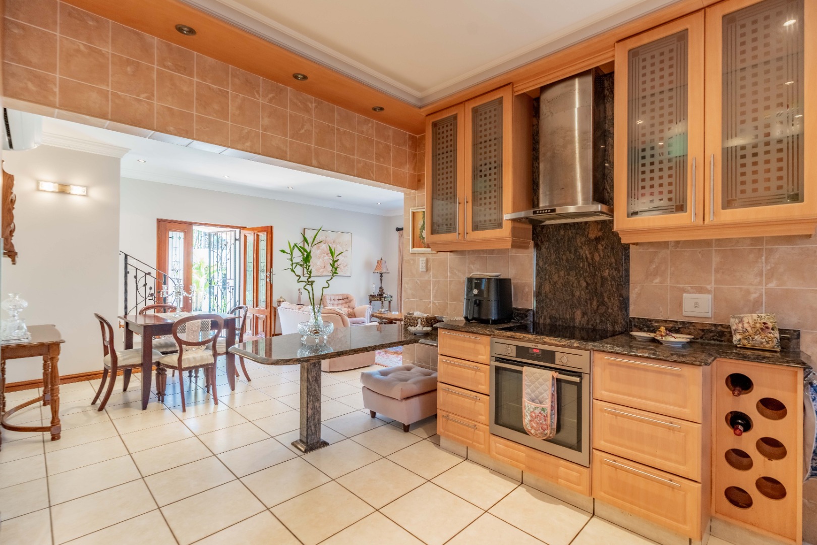 The chef's kitchen, fitted with top of the range appliances, opens directly onto the patio-ideal for effortless entertaining. A spacious guest suite with ensuite bathroom and sliding doors to the pool is located on the lower level, along with a guest cloakroom.