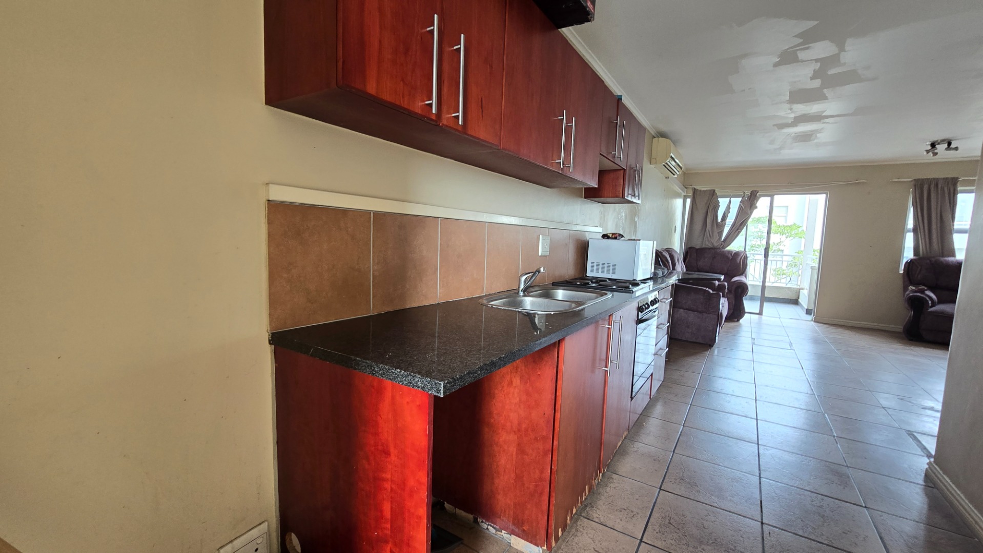 Walk into the apartment to spacious gally style kitchen with granite counter tops ,with breakfast nook , double basin sink and plumbed for washing machine, under counter oven with stove. Leading on from the kitchen you will enter a spacious open plan lounge , dinning room.