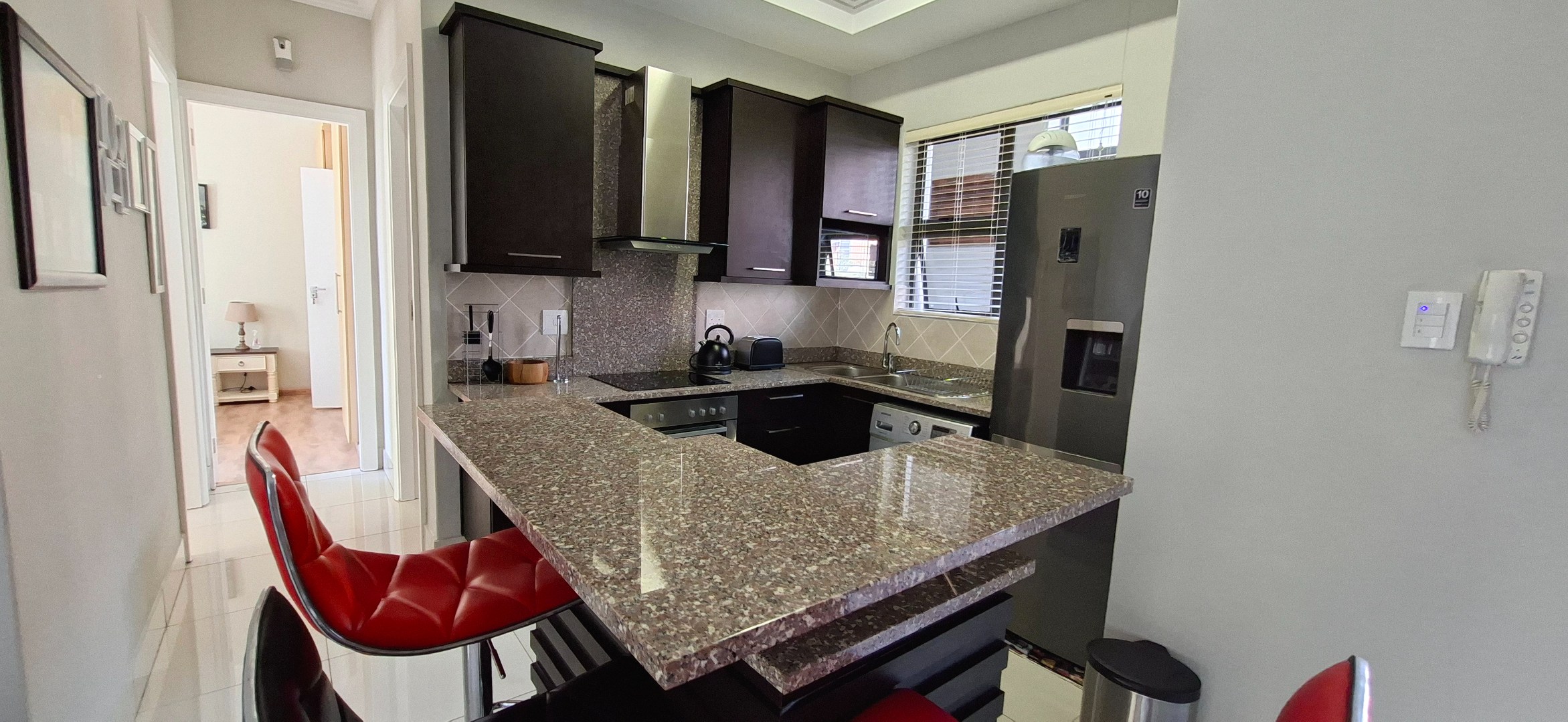The spacious main bedroom features a private en-suite and opens onto its own patio, creating a peaceful retreat to start and end your day. The modern open-plan kitchen, finished with sleek granite countertops, flows seamlessly into the lounge, where sliding doors lead out to a generous patio — the ideal space to relax, entertain, and soak in the stunning ocean views.