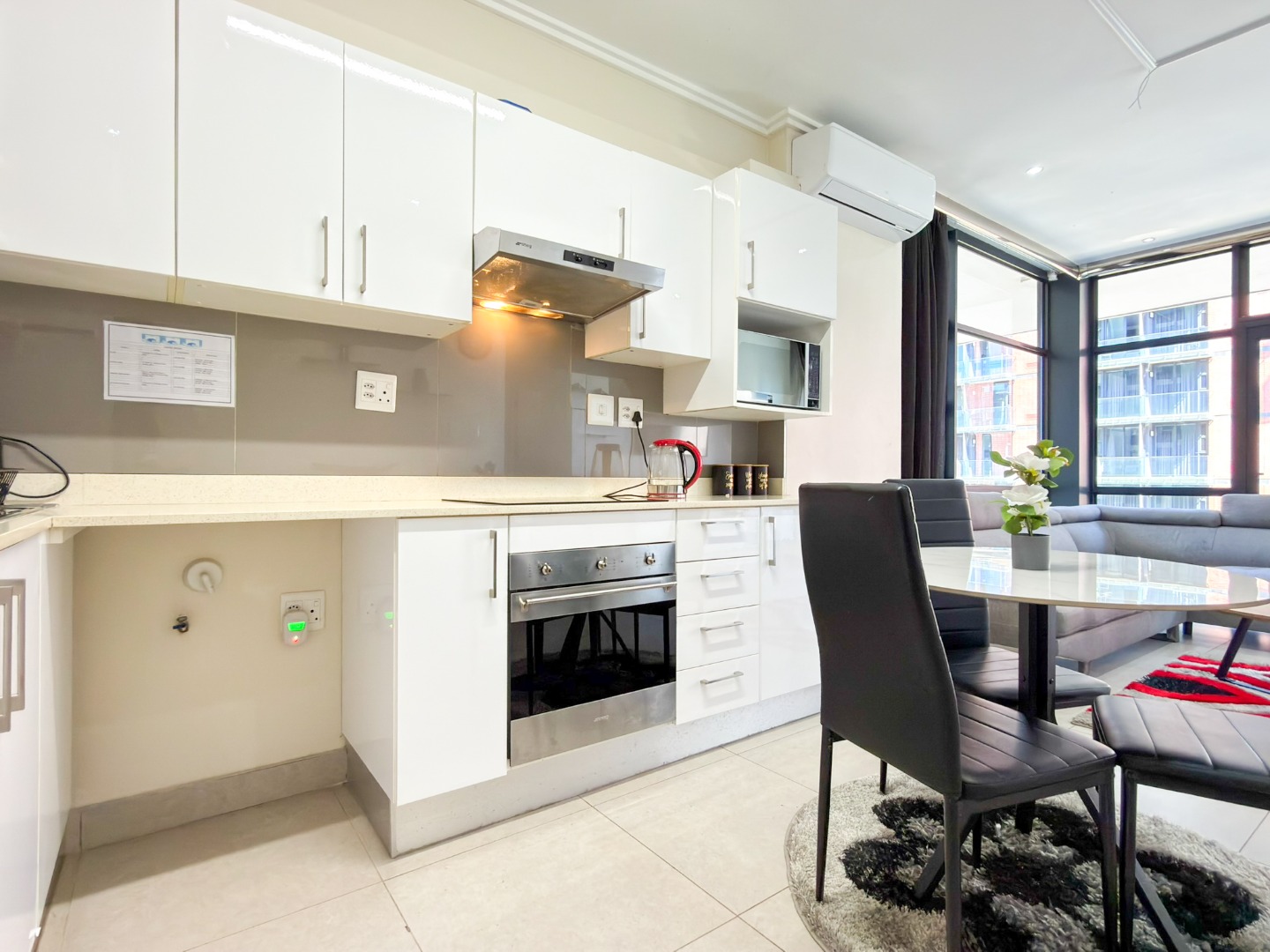 The apartment comprises two spacious bedrooms, each featuring its own beautifully appointed en-suite bathroom. A sleek, modern open-plan kitchen flows seamlessly into the lounge area, which opens onto a wraparound balcony overlooking Umhlanga Rocks. An enclosed glass patio/sunroom adds further versatility to the living space. Enjoy breathtaking 90-degree ocean views from both the lounge and one of the bedrooms.