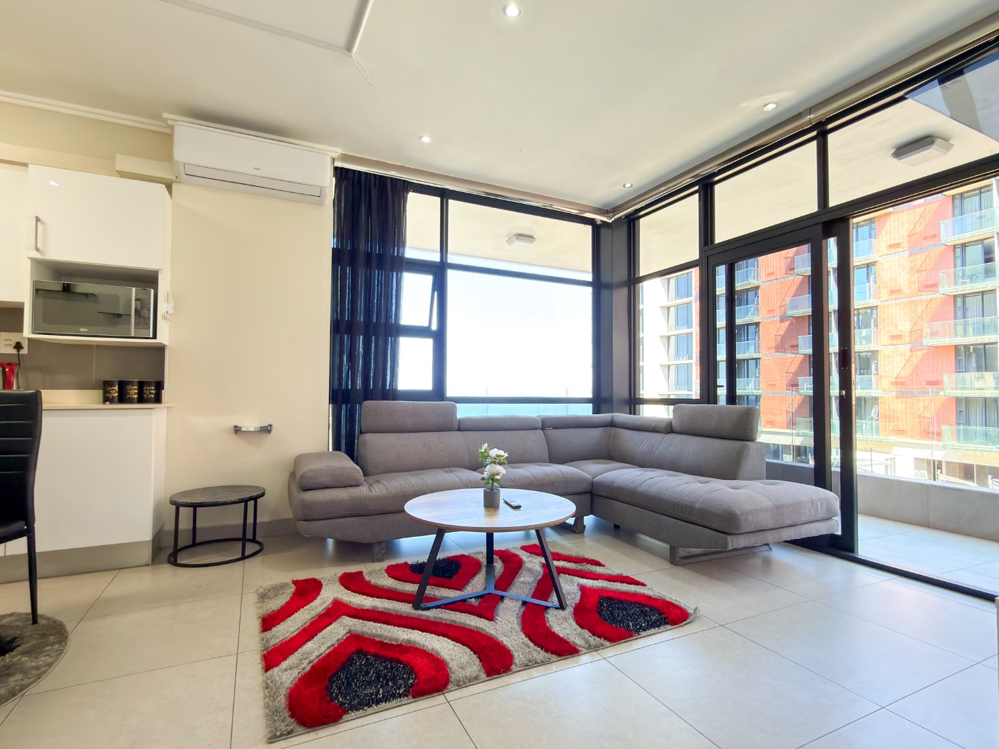 The apartment comprises two spacious bedrooms, each featuring its own beautifully appointed en-suite bathroom. A sleek, modern open-plan kitchen flows seamlessly into the lounge area, which opens onto a wraparound balcony overlooking Umhlanga Rocks. An enclosed glass patio/sunroom adds further versatility to the living space. Enjoy breathtaking 90-degree ocean views from both the lounge and one of the bedrooms.