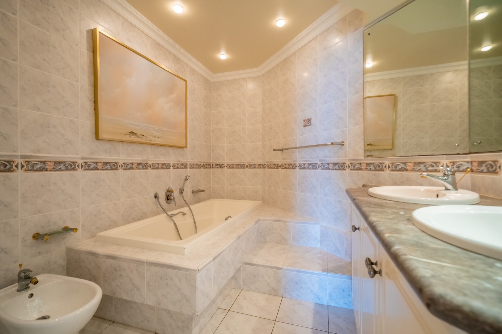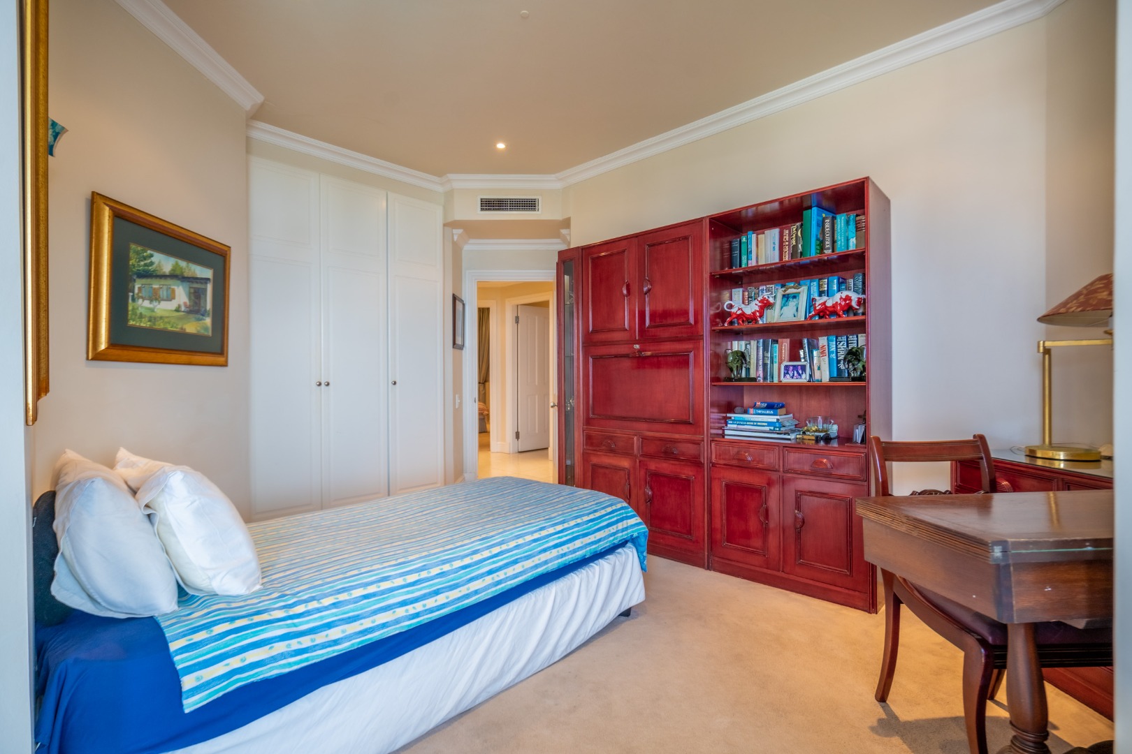 Spanning 160 square metres, the interior boasts an open-plan design, seamlessly connecting living spaces. Elegant tiled flooring and sophisticated crown moulding enhance the aesthetic, while built-in ceiling air conditioning ensures year-round comfort. The residence features a dedicated dining room, a spacious lounge ideal for a family TV room, and a stylish built-in bar, perfect for sophisticated entertaining. Three generously proportioned bedrooms provide serene retreats, complemented by two and a half luxurious bathrooms, including a private en-suite for ultimate indulgence and a convenient guest toilet.