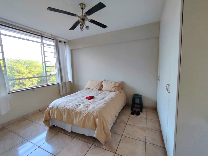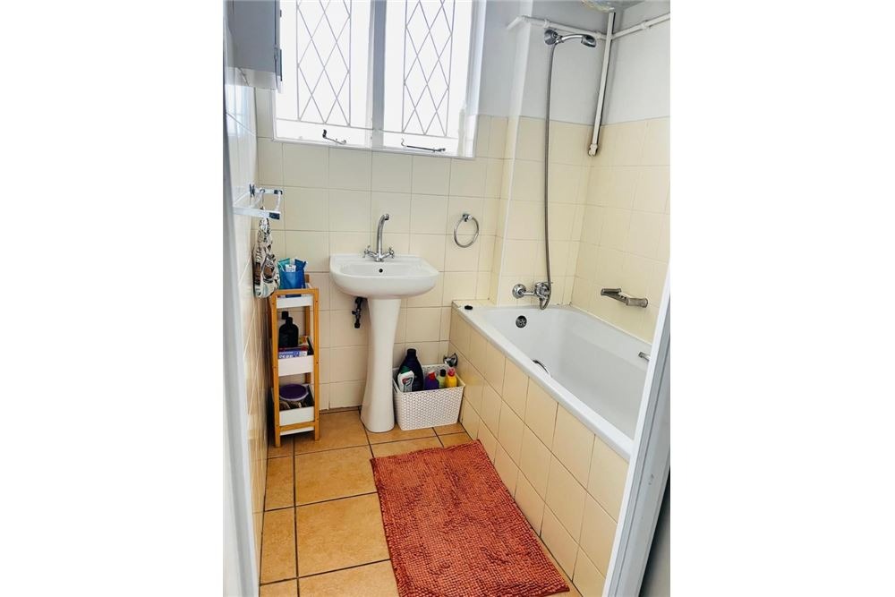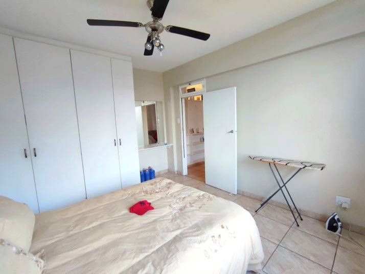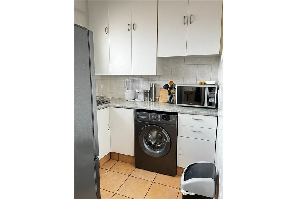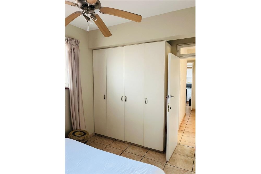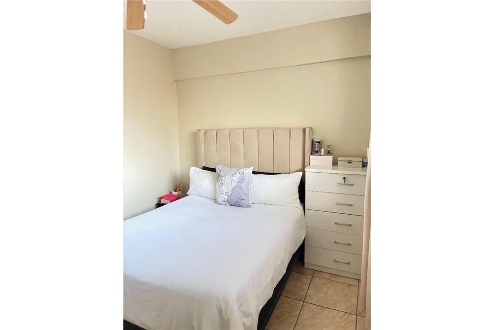Both bedrooms are fitted with ceiling fans and built-in cupboards. The lounge is bathed in natural light, creating a welcoming atmosphere. The bathroom, featuring a bathtub with an integrated shower and tiled surfaces, is functional and easy to maintain. This apartment is ideal for professionals or small families seeking a lock-up-and-go lifestyle in a secure environment.