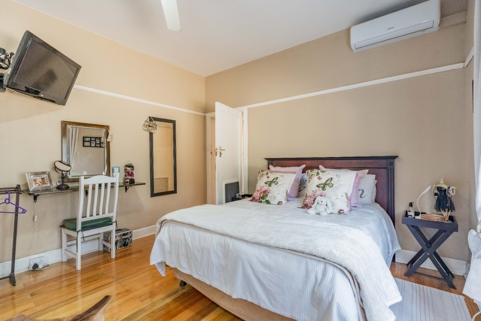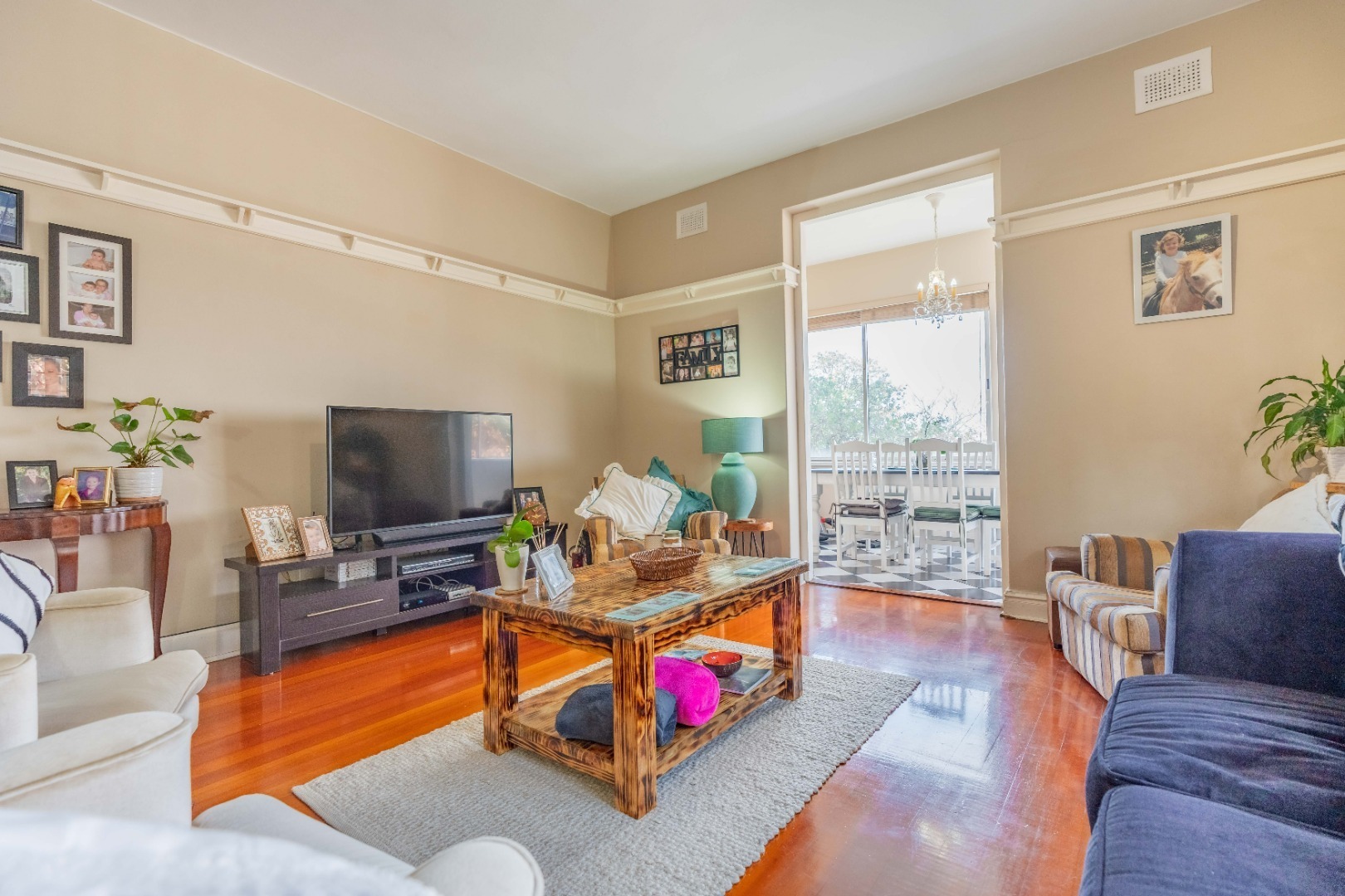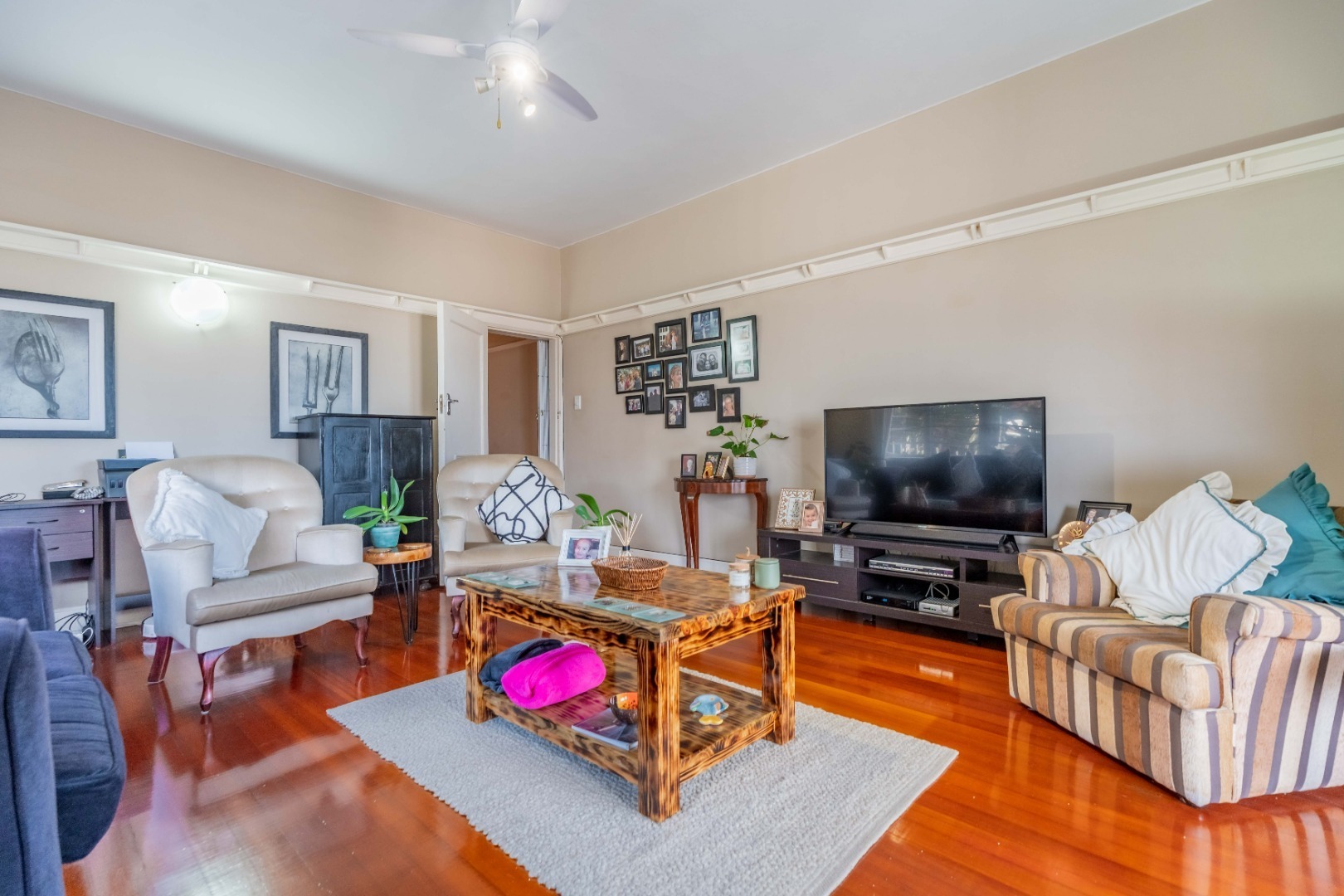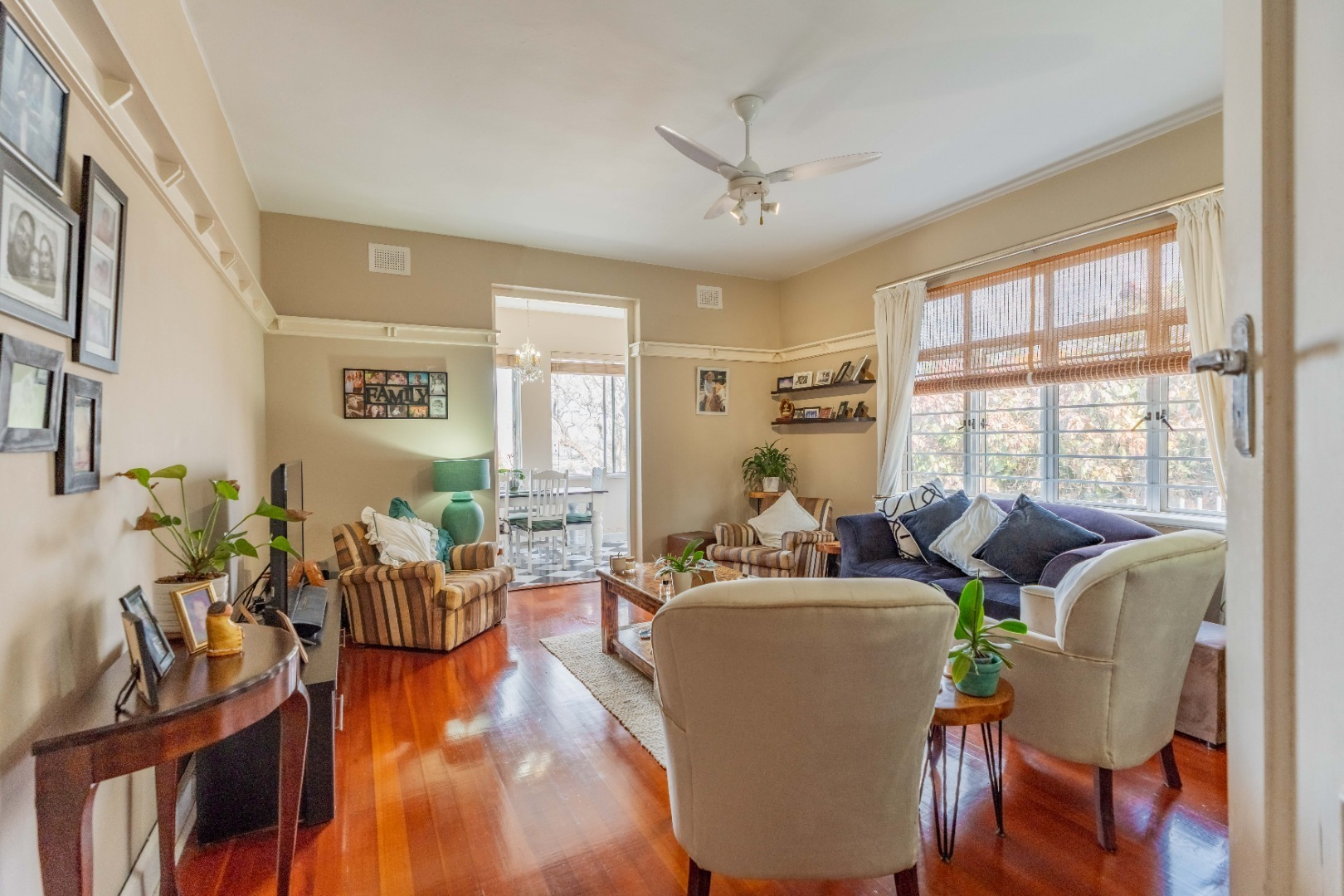 Step into a spacious, sun-filled lounge that flows seamlessly into the dining area, where you can enjoy stadium and slight sea views. The apartment features two generously sized bedrooms with built-in cupboards and immaculate wooden flooring throughout, adding warmth and character.