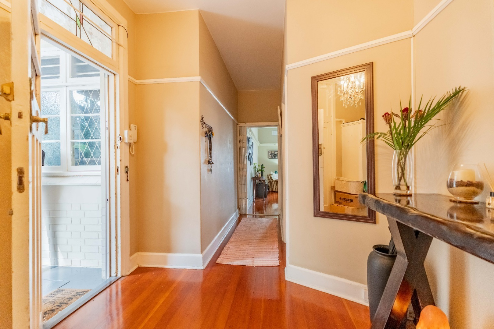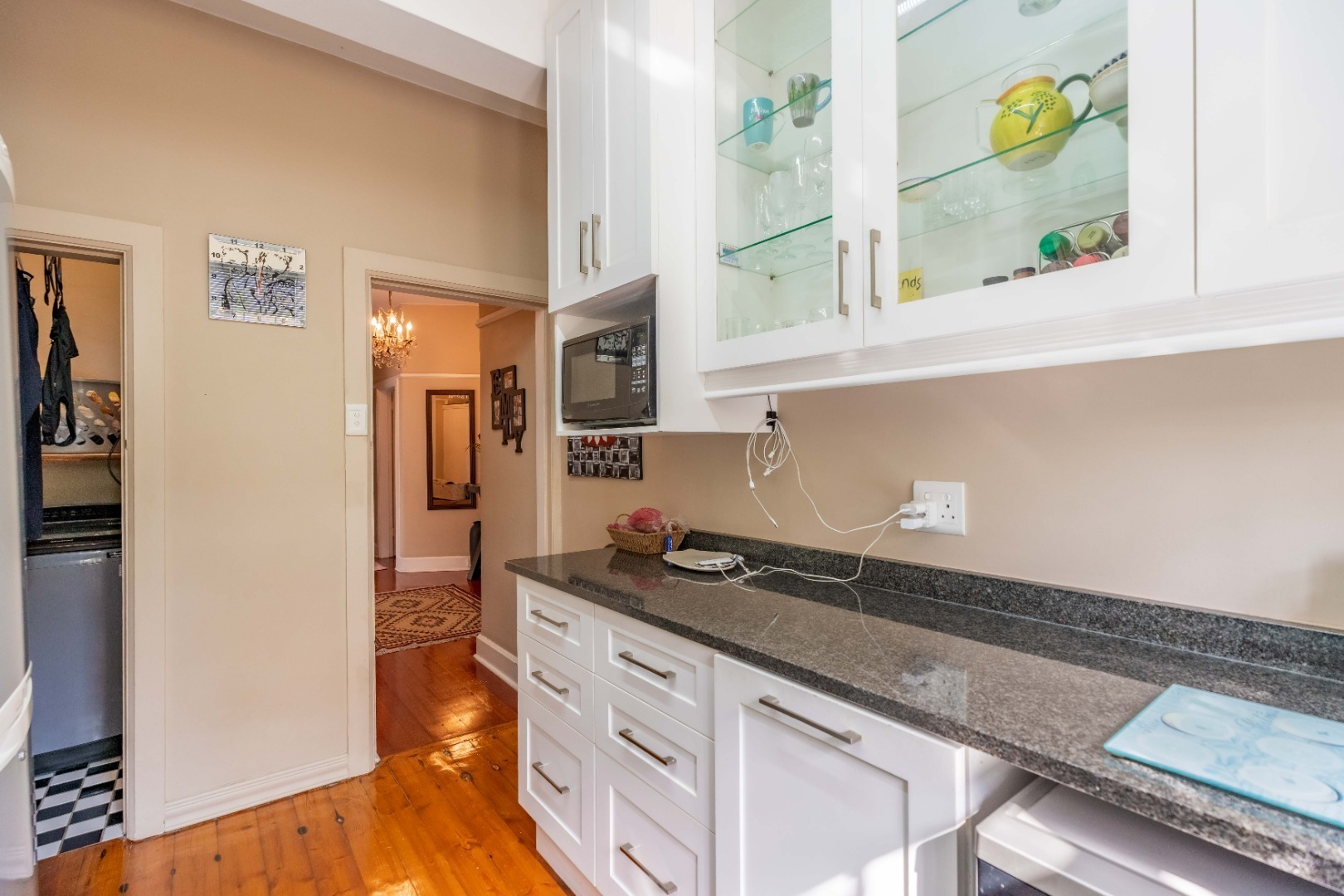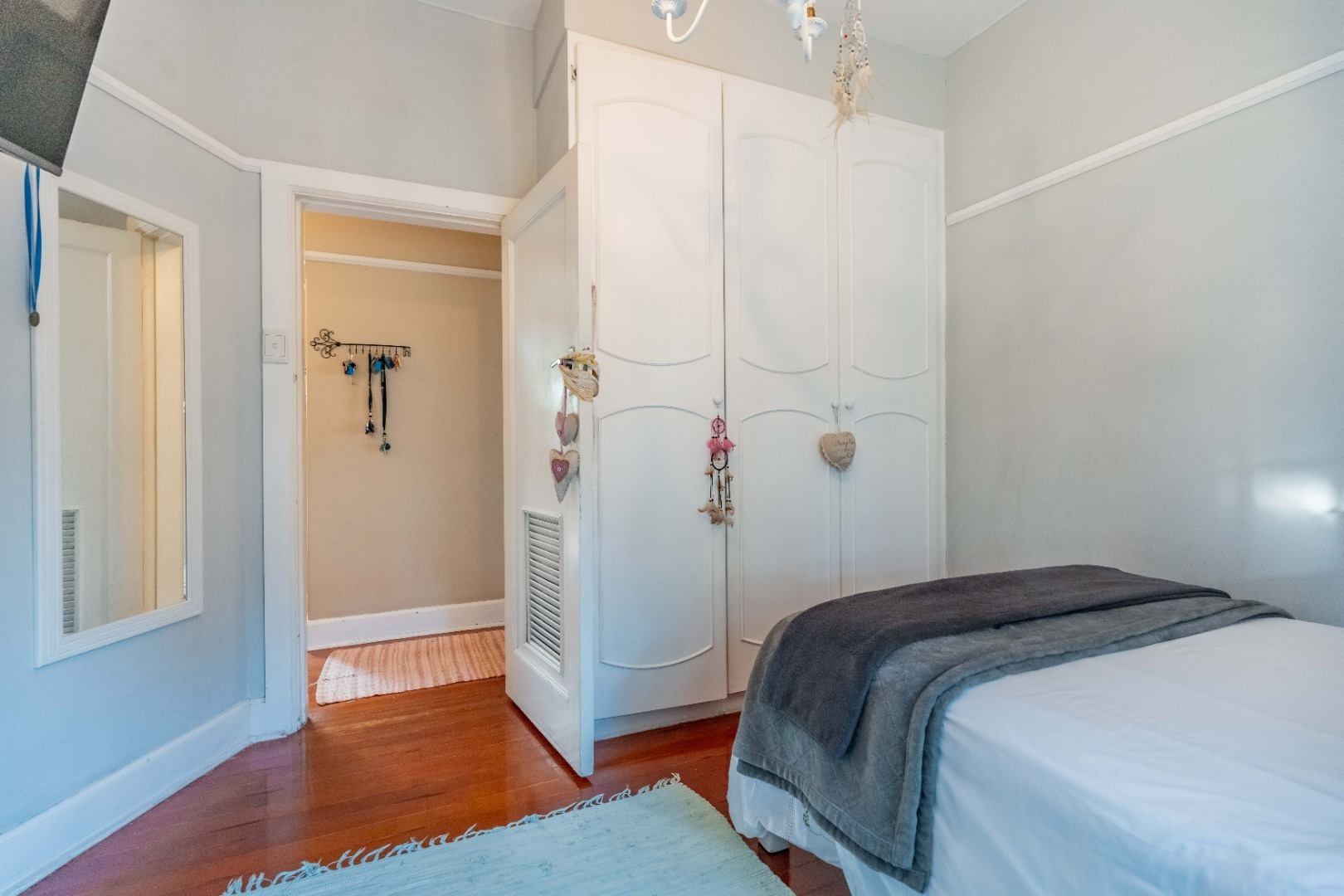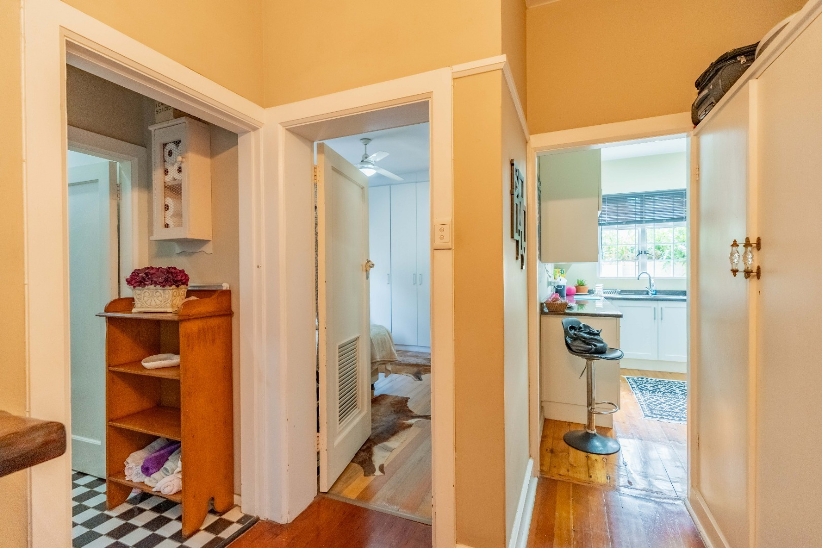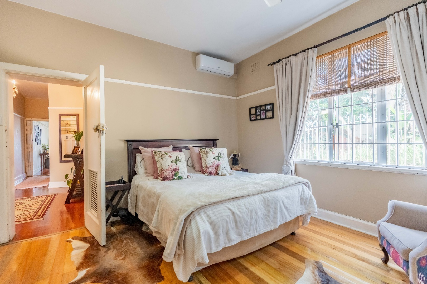Step into a spacious, sun-filled lounge that flows seamlessly into the dining area, where you can enjoy stadium and slight sea views. The apartment features two generously sized bedrooms with built-in cupboards and immaculate wooden flooring throughout, adding warmth and character.