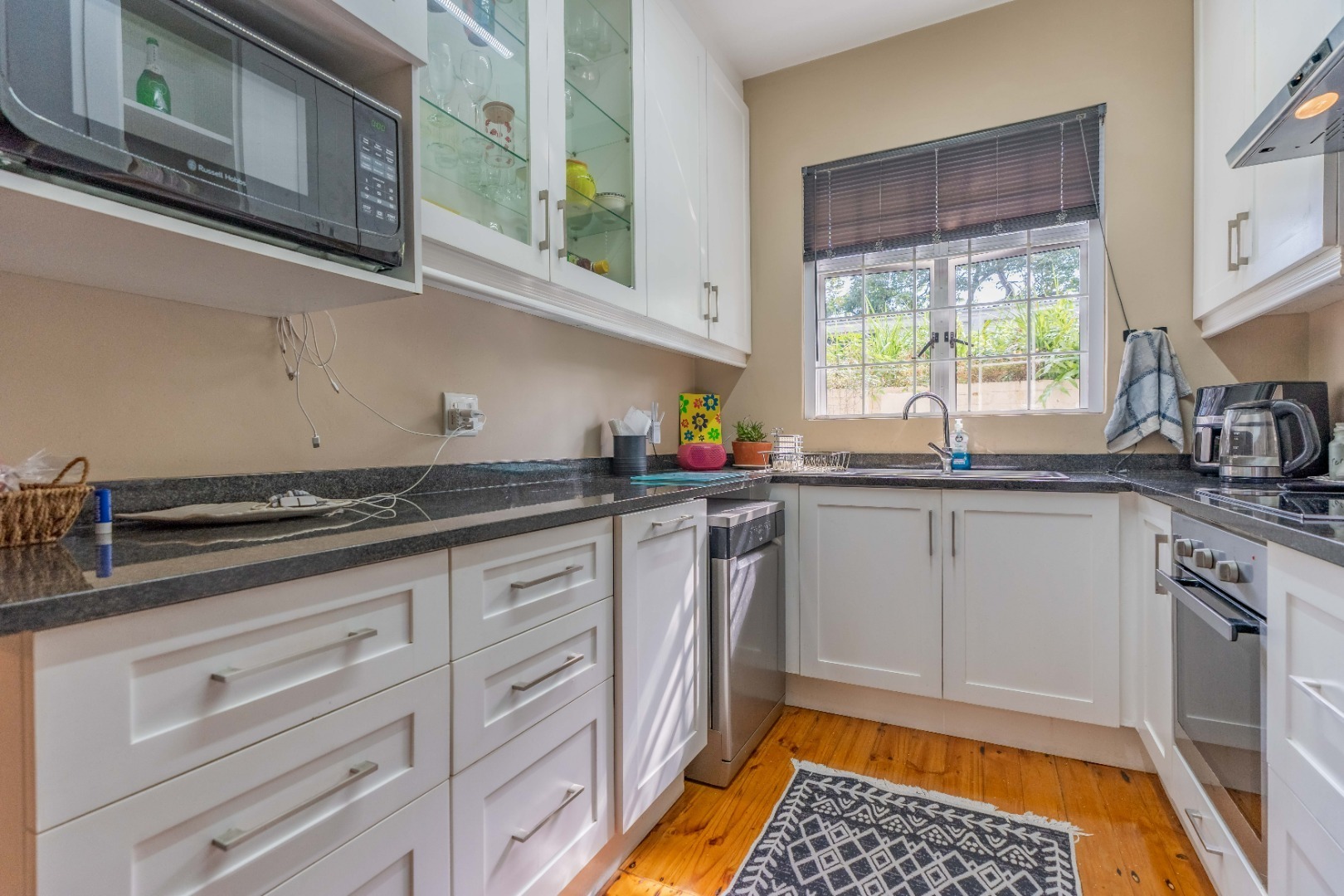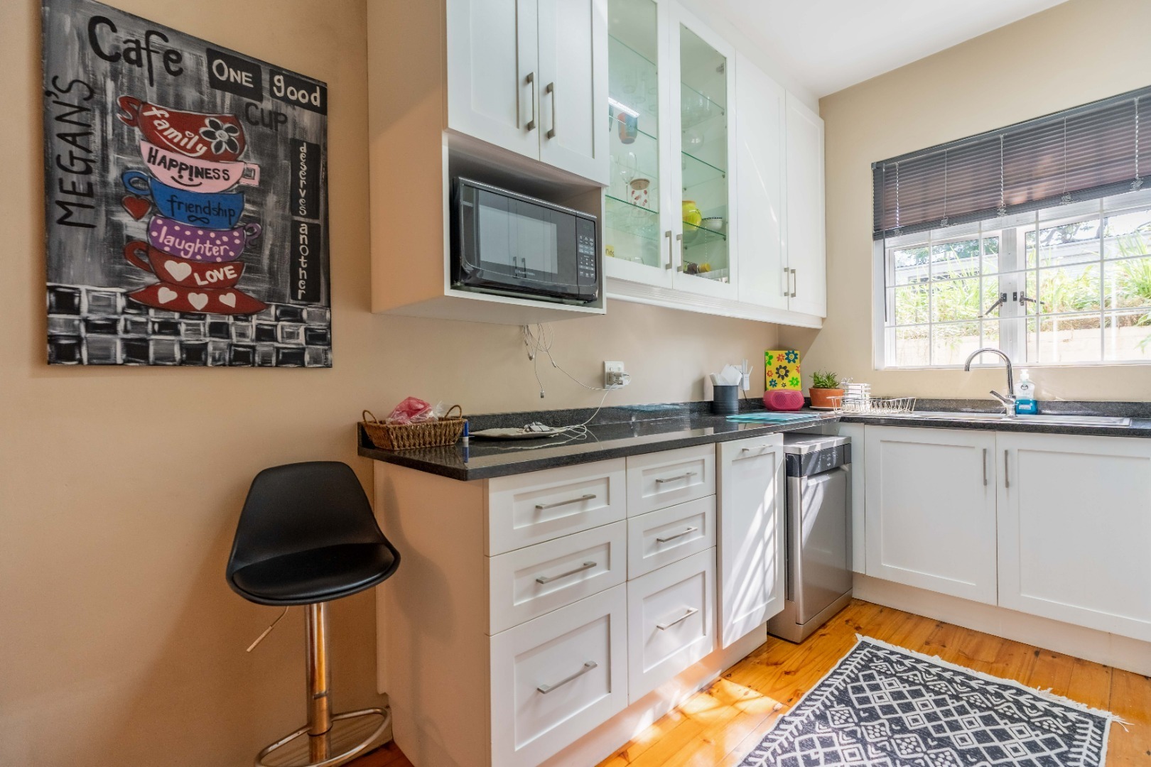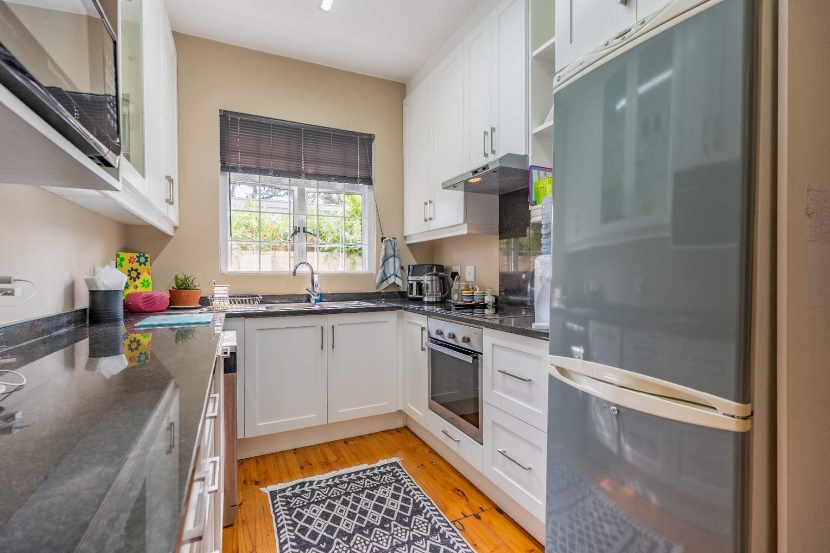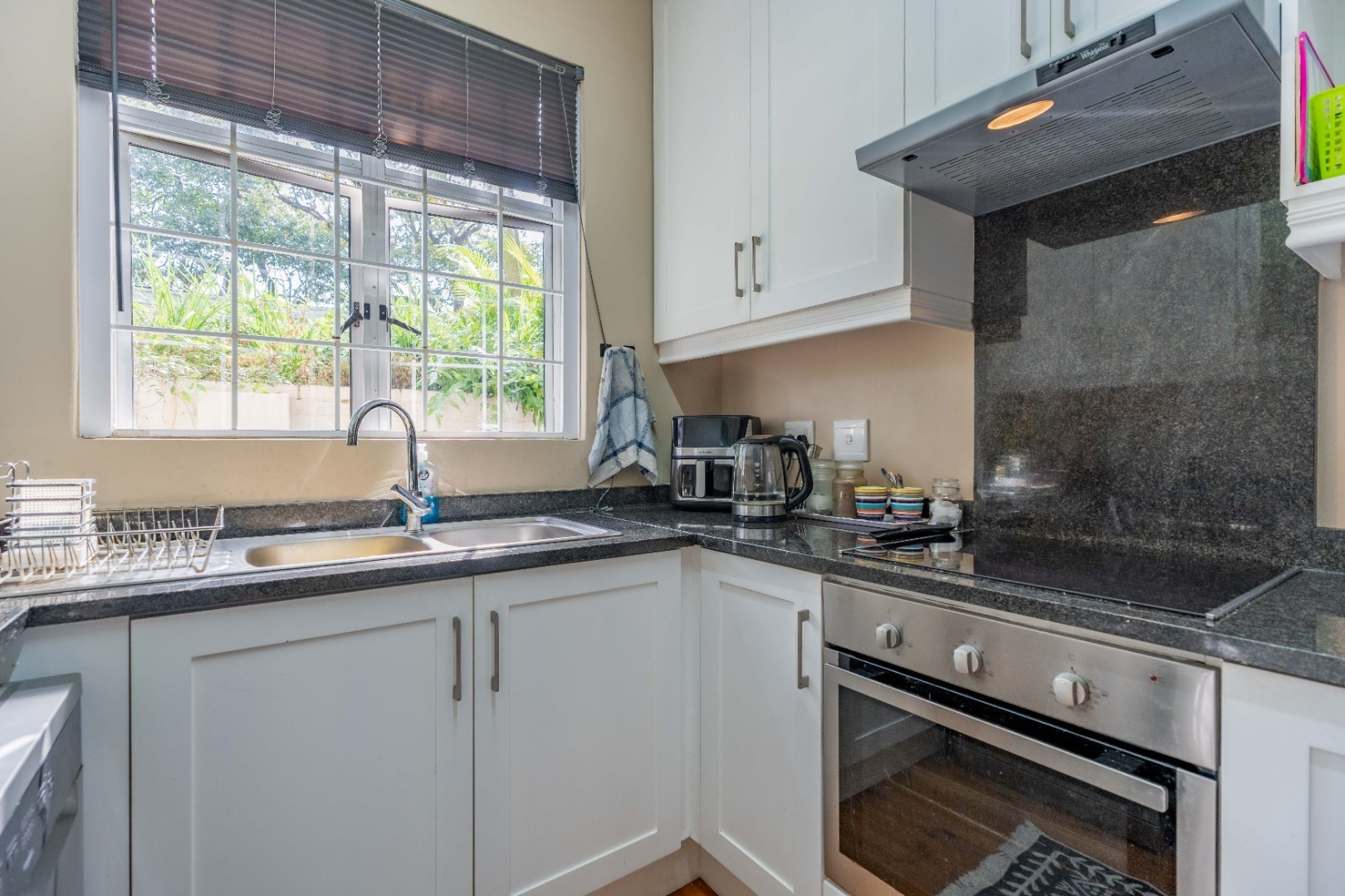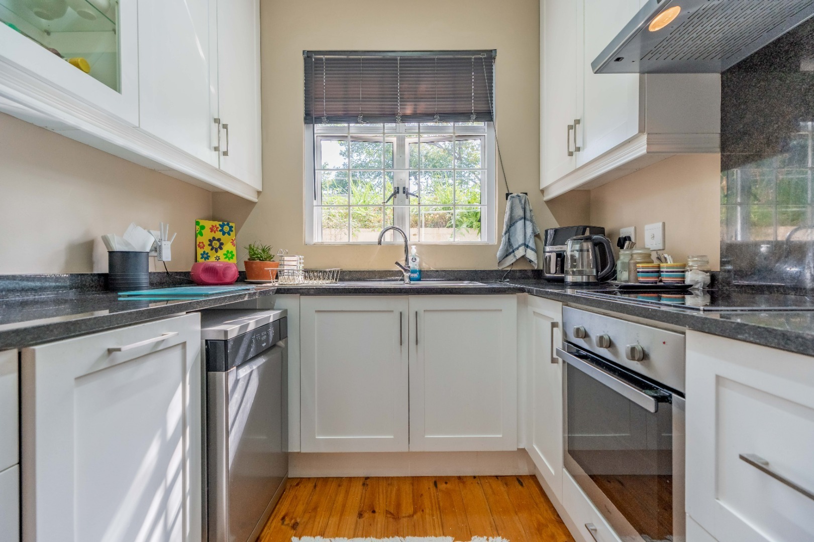 The modern kitchen is fitted with granite countertops, ample built-in cupboards, a built-in stove, hob, extractor, and is plumbed for a dishwasher. There’s also a separate guest loo, while the fully tiled bathroom includes a shower, basin, and toilet.