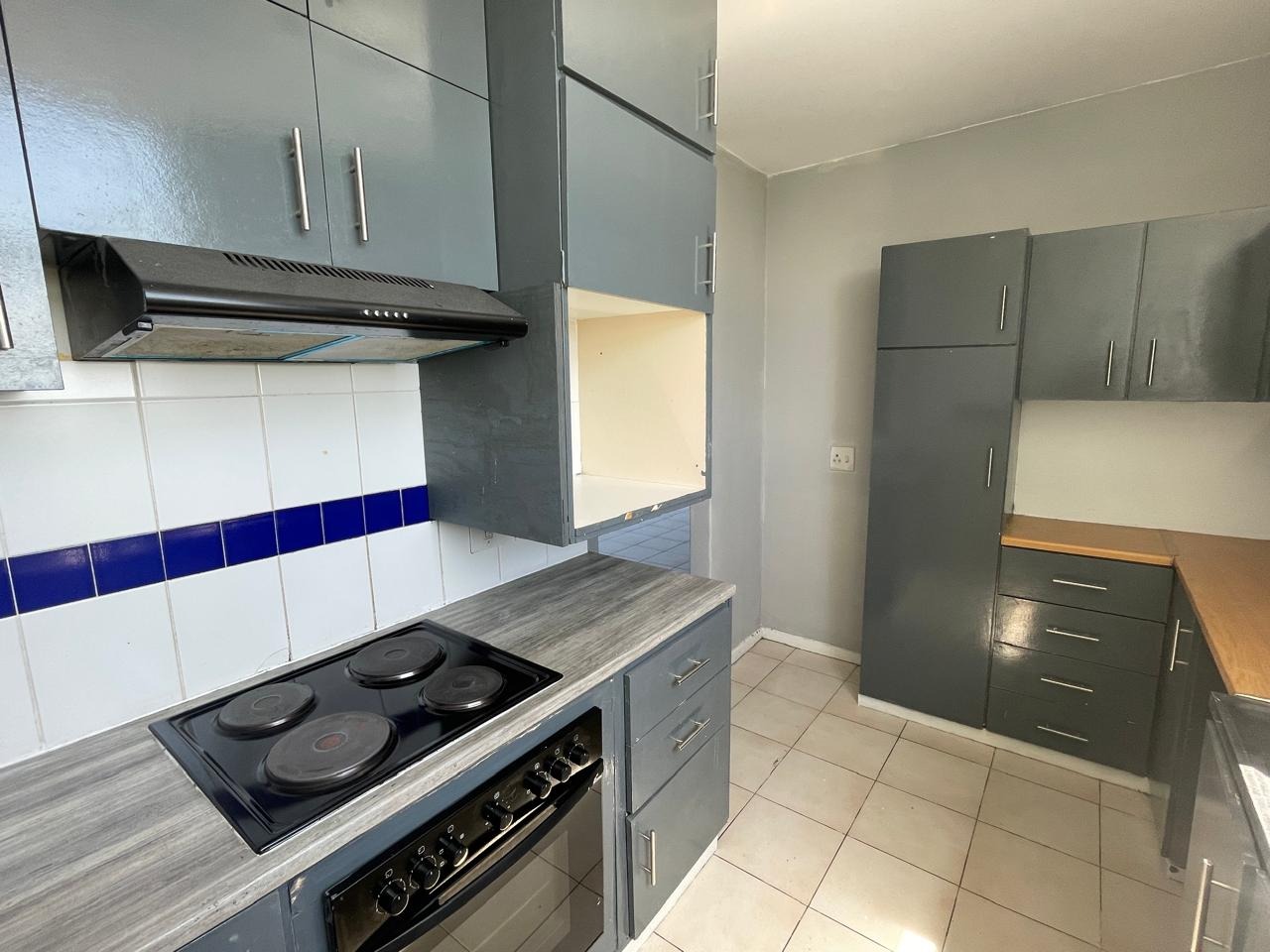 The open living area features large windows with scenic views, tiled flooring, and ample natural light. The kitchen is well-equipped with sleek cabinets, a stove, oven, and countertop space, complemented by tiled splashbacks.