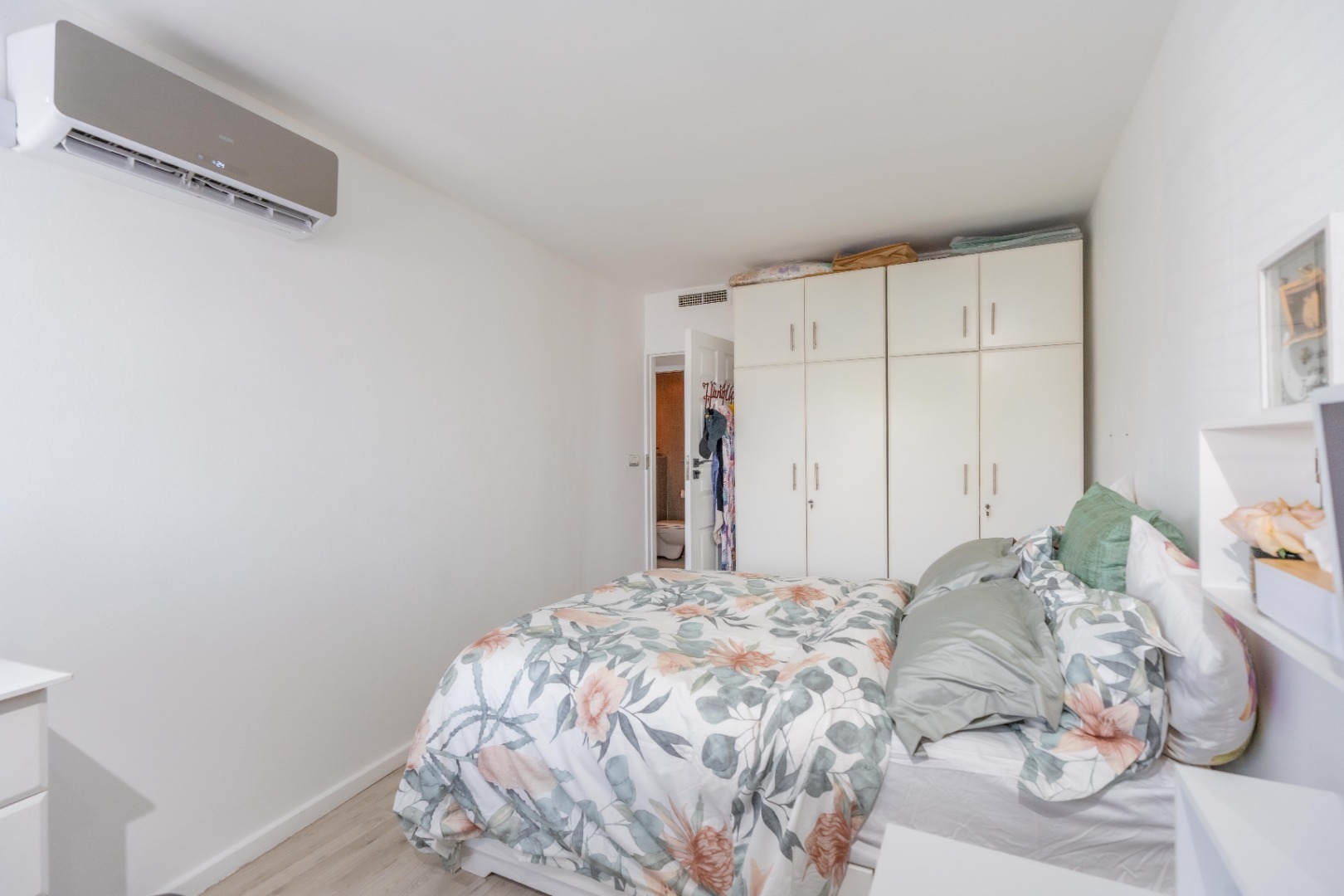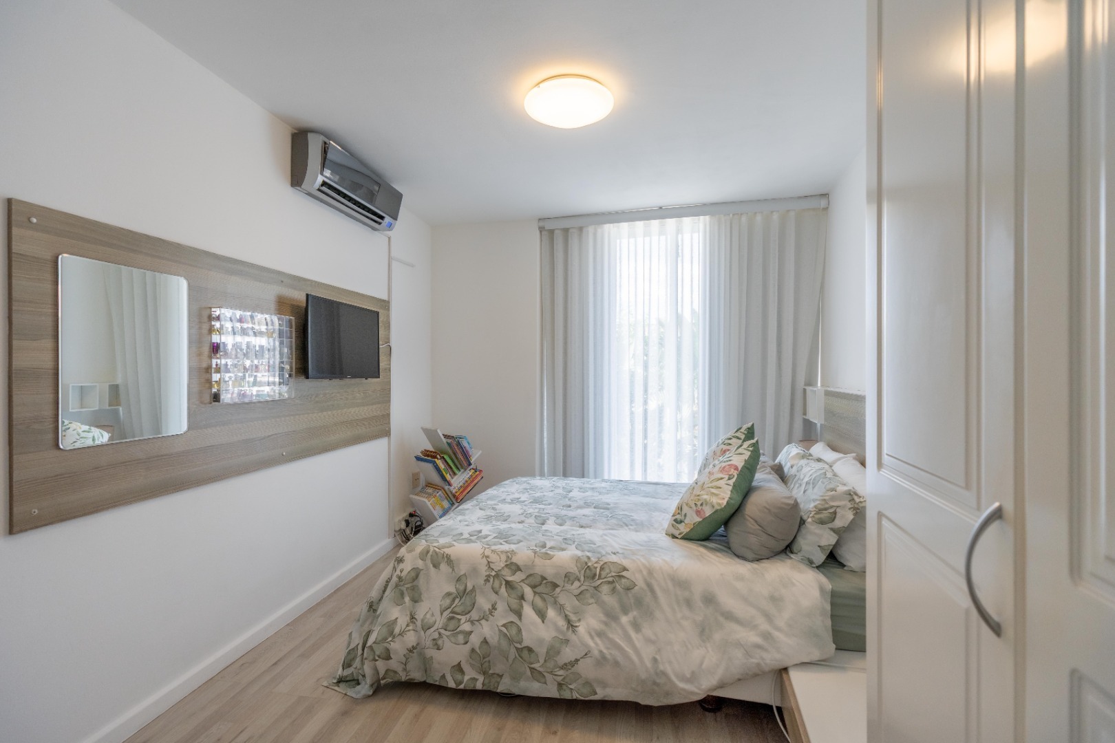 Upstairs, two air-conditioned bedrooms with built-in cupboards await, including a master suite with stylish built-in side tables. The main en-suite is beautifully detailed with a shower, basin, and toilet, mirroring the amenities found in the family bathroom.