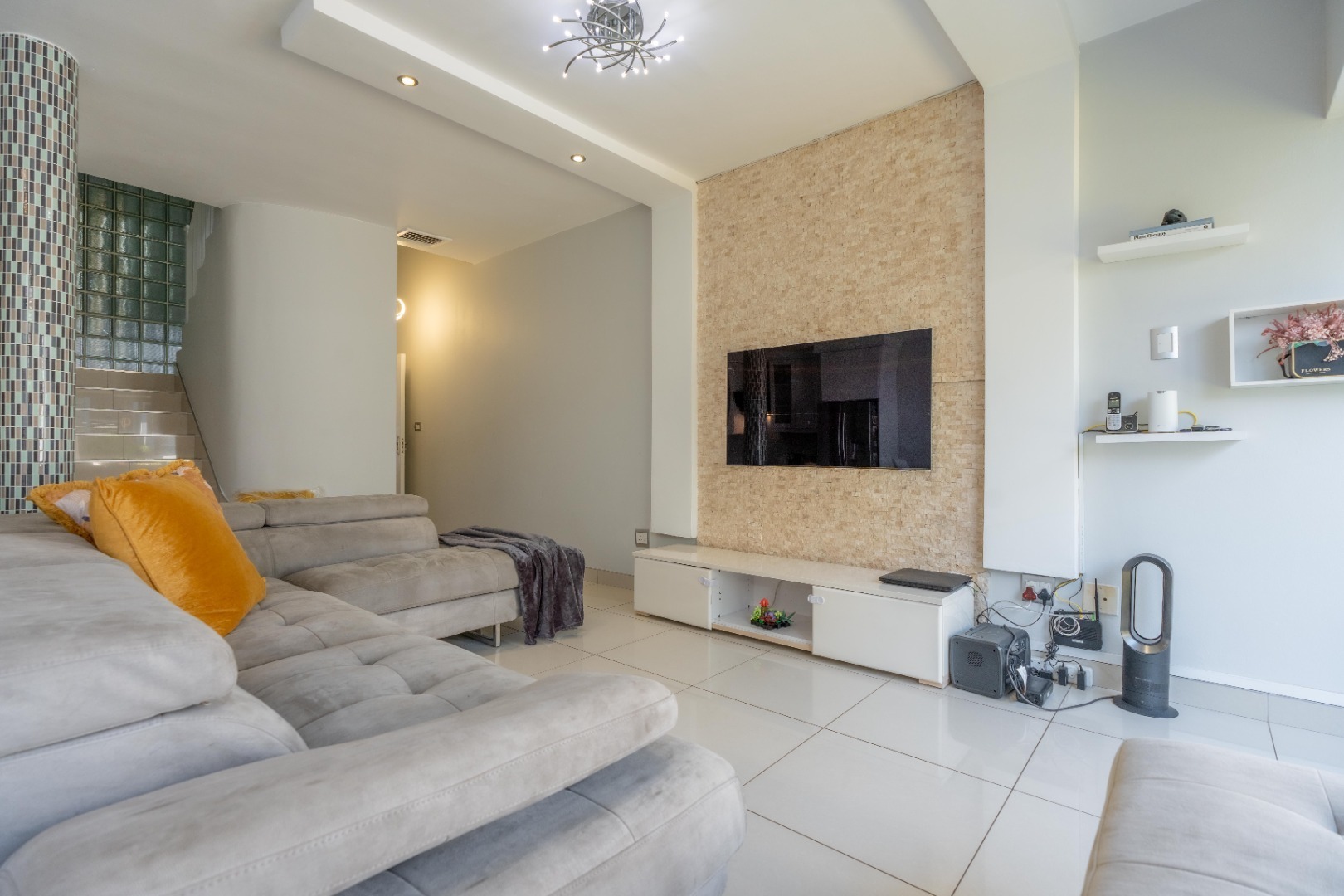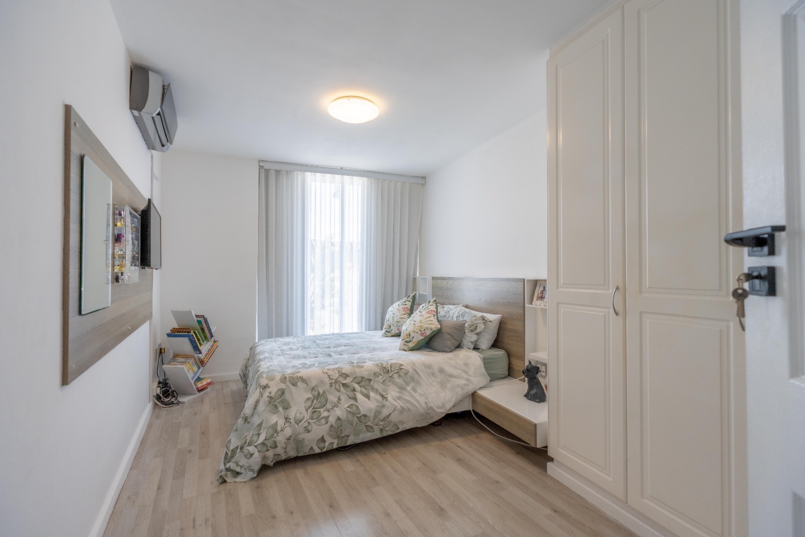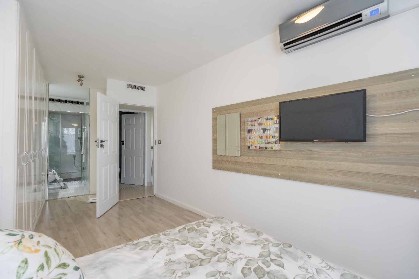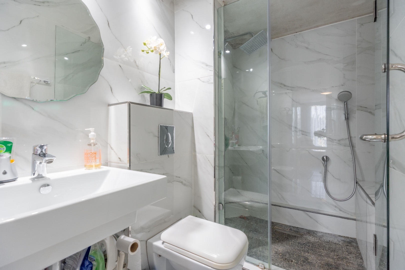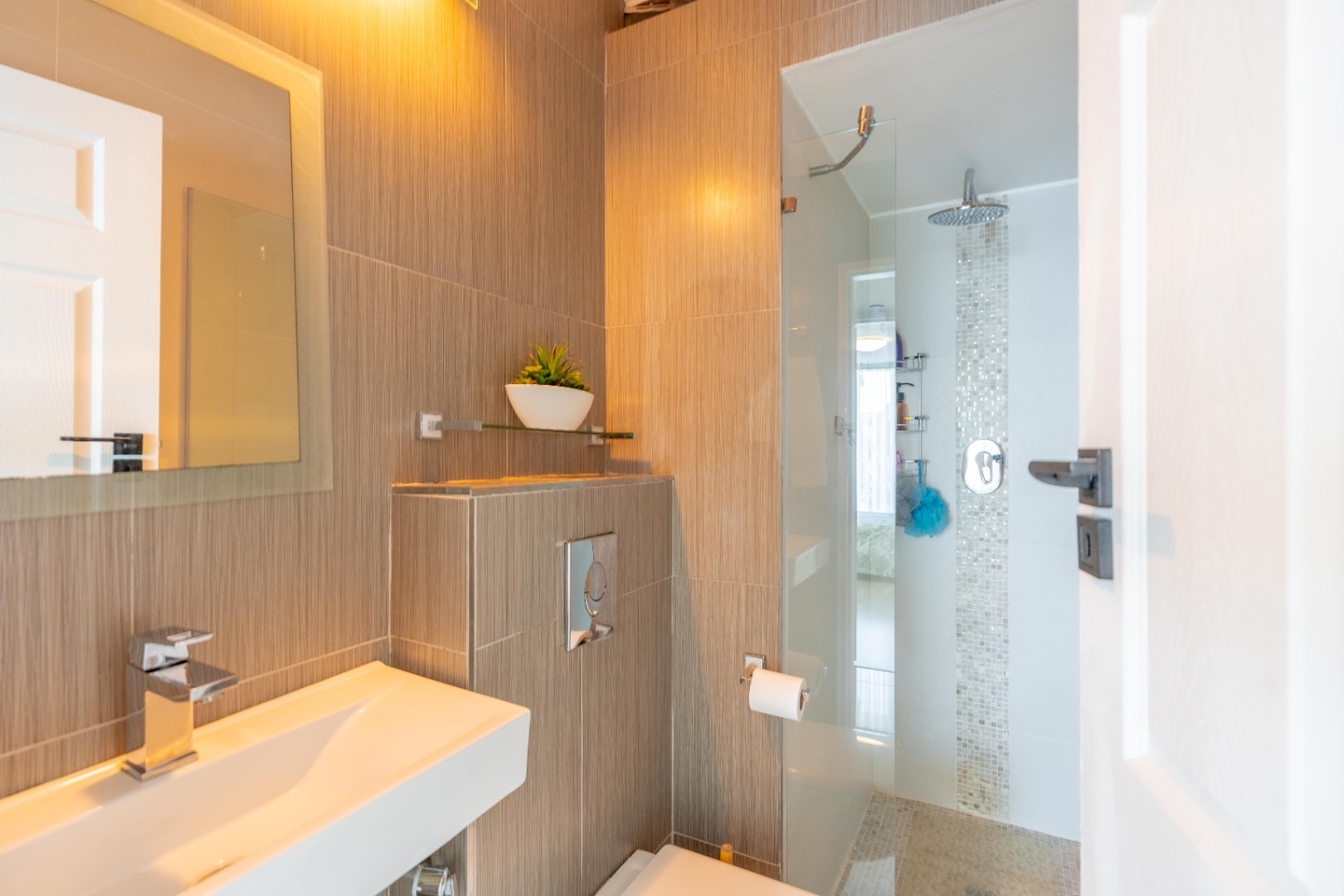 Upstairs, two air-conditioned bedrooms with built-in cupboards await, including a master suite with stylish built-in side tables. The main en-suite is beautifully detailed with a shower, basin, and toilet, mirroring the amenities found in the family bathroom.