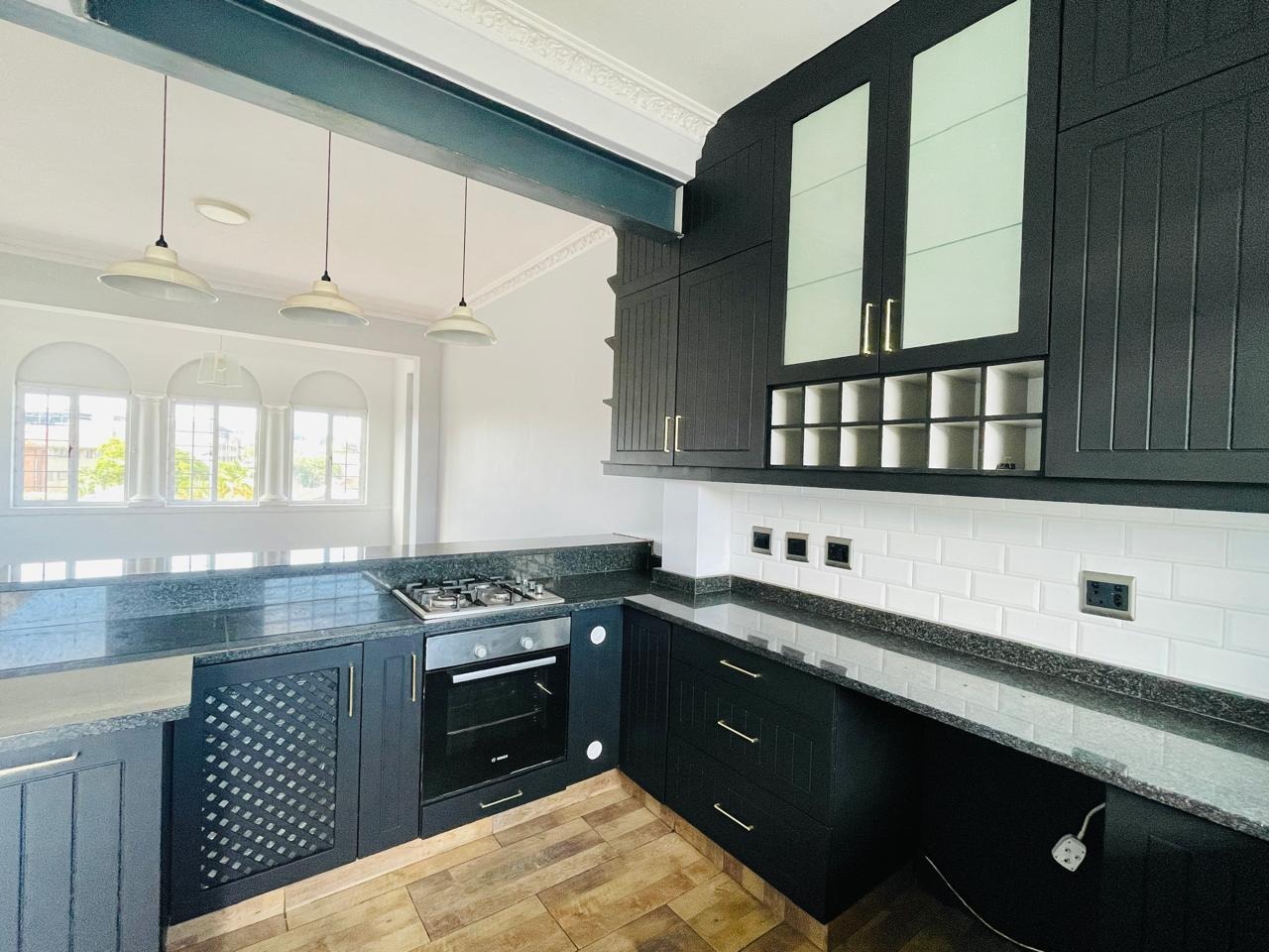The kitchen is fully fitted with a hob stove with gas, electric oven, and washing machine outlet; flowing into a bright, open plan lounge and dining area.