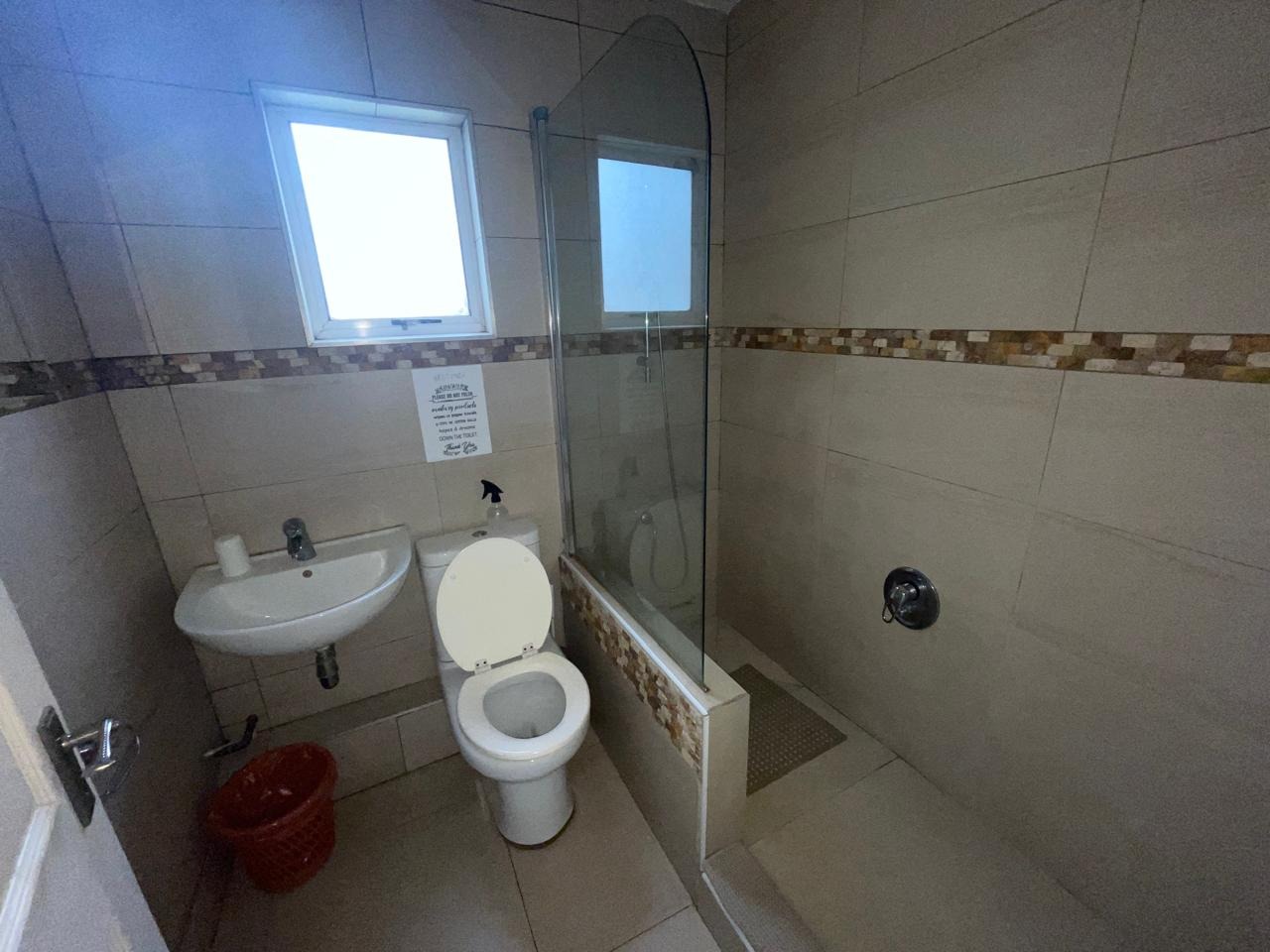There are two bathrooms, each fitted with a shower, toilet, and sink. The bathrooms are tiled in neutral colors, providing a clean and refreshing atmosphere.