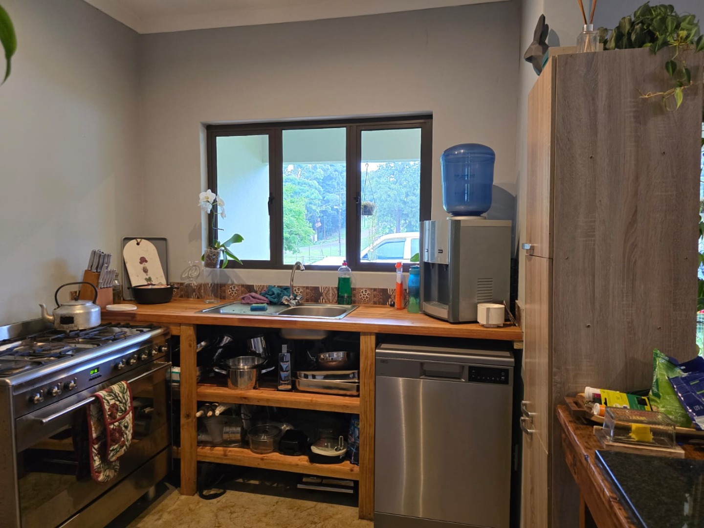 The kitchen is country style with built in cupboards and a dishwasher connection. There is also a spacious laundry with a washing machine connection and space for storage. Step outside onto your private deck, perfect for enjoying a morning coffee or evening braai, overlooking a lush green garden. With 4 open parking spots, there's plenty of room for your vehicles and friends.