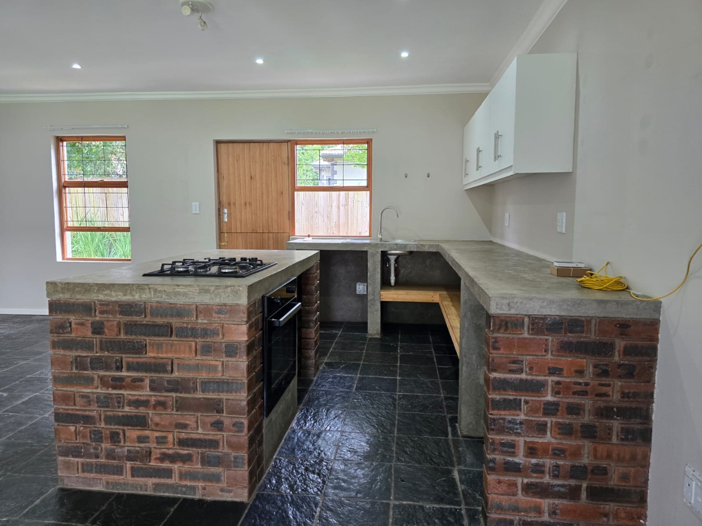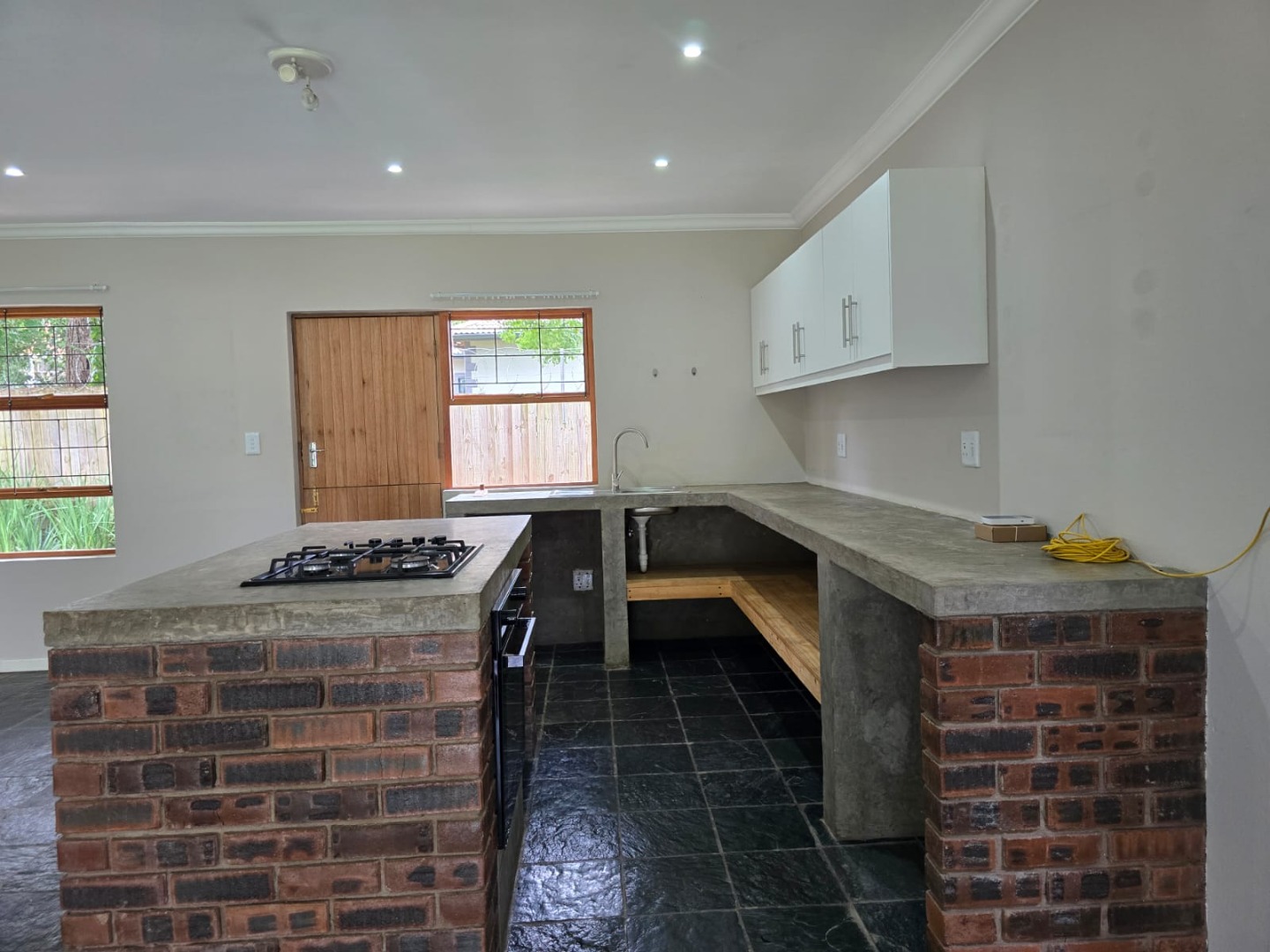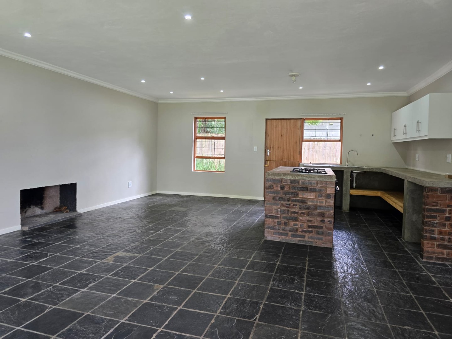 Downstairs features a welcoming entrance hall leading into an open-plan lounge, dining area, and kitchen. The lounge includes a cozy fireplace, perfect for cooler evenings, and flows seamlessly into the living space. The kitchen is fitted with a center island, built-in gas hob, undercounter oven, and a washing machine connection. The unit is tiled throughout for easy maintenance, and a guest toilet is conveniently located on this level.