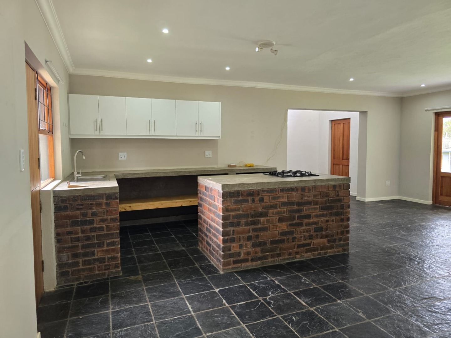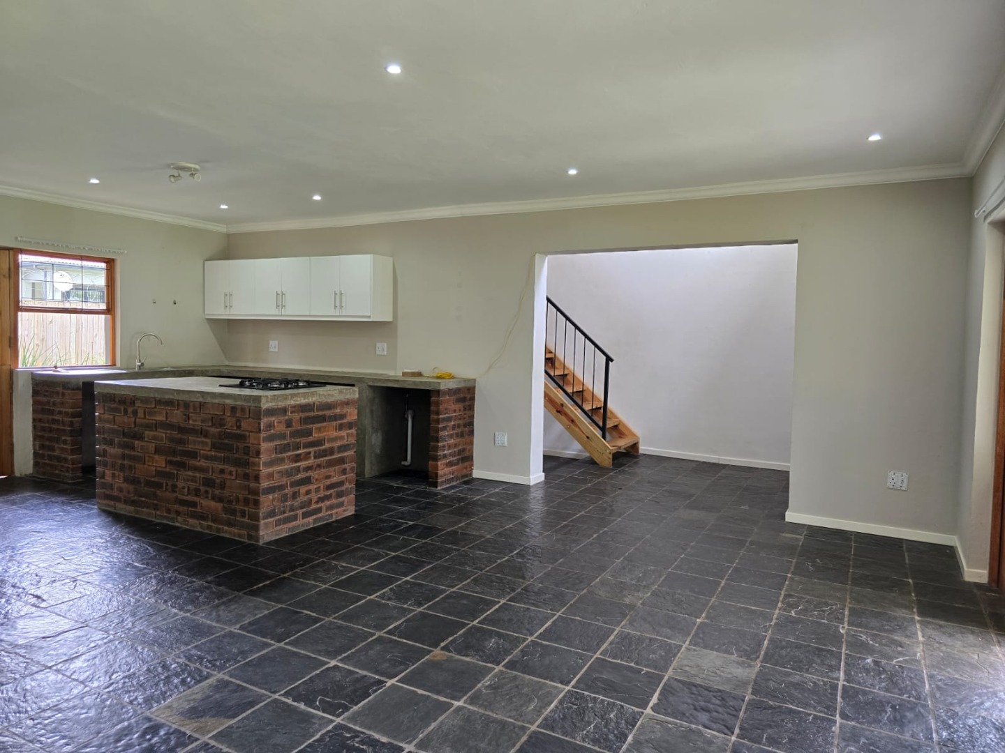 Downstairs features a welcoming entrance hall leading into an open-plan lounge, dining area, and kitchen. The lounge includes a cozy fireplace, perfect for cooler evenings, and flows seamlessly into the living space. The kitchen is fitted with a center island, built-in gas hob, undercounter oven, and a washing machine connection. The unit is tiled throughout for easy maintenance, and a guest toilet is conveniently located on this level.