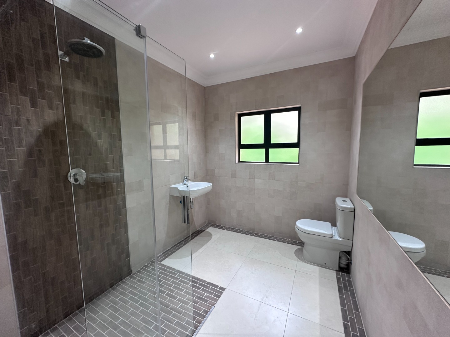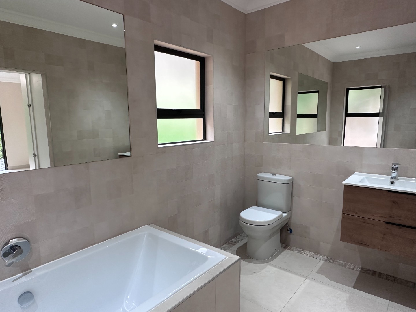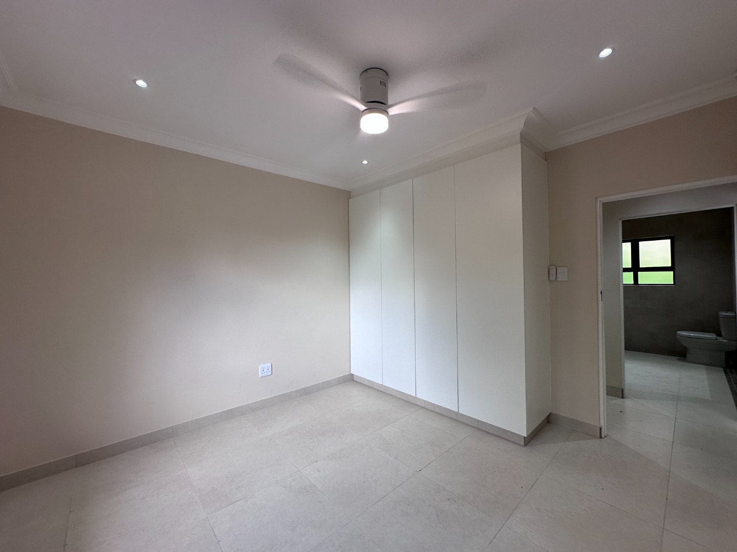 The home offers two spacious bedrooms, both with built-in cupboards, ceiling fans and air-conditioning. The main bedroom enjoys a full en-suite bathroom, privately accessed through the cupboard area, while the second bathroom includes a walk-in shower, basin and toilet.
