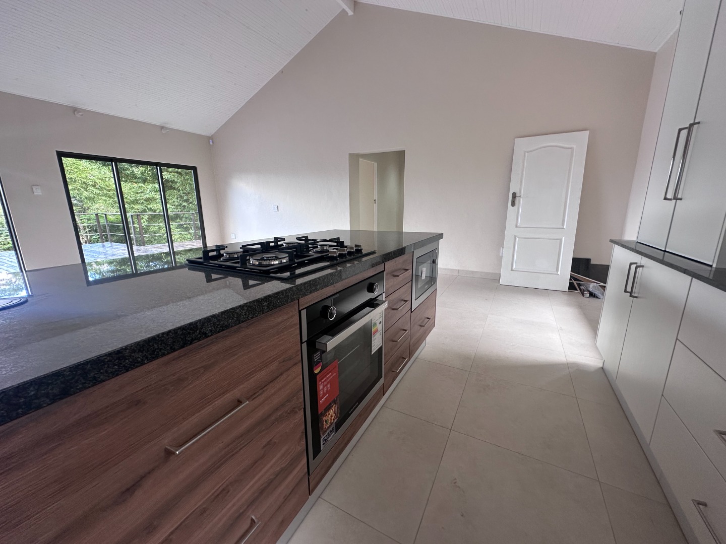 The designer kitchen features a 4-plate gas hob, built-in electric oven and microwave, a clever fold-away coffee station cupboard, and ample built-in cabinetry.