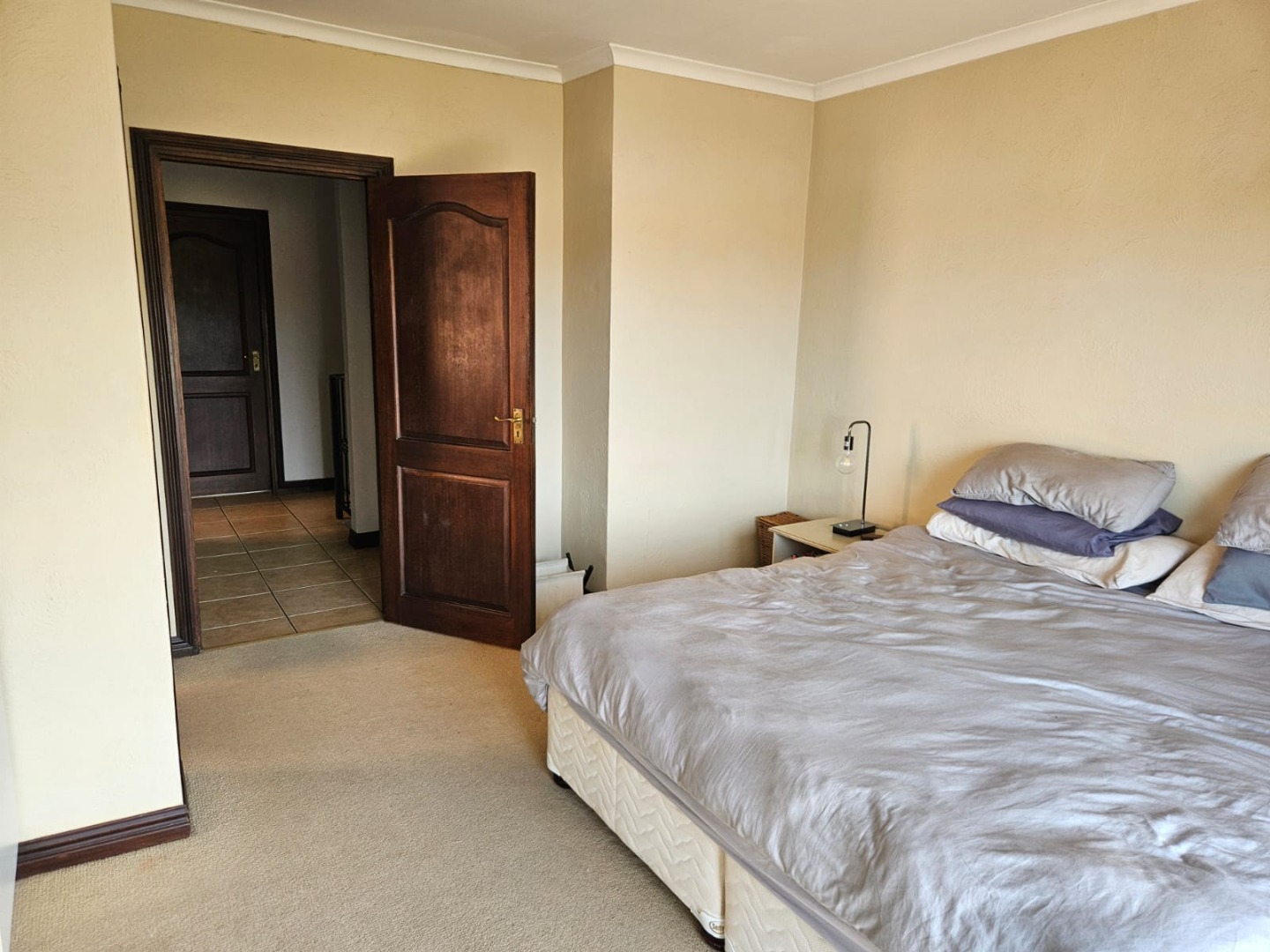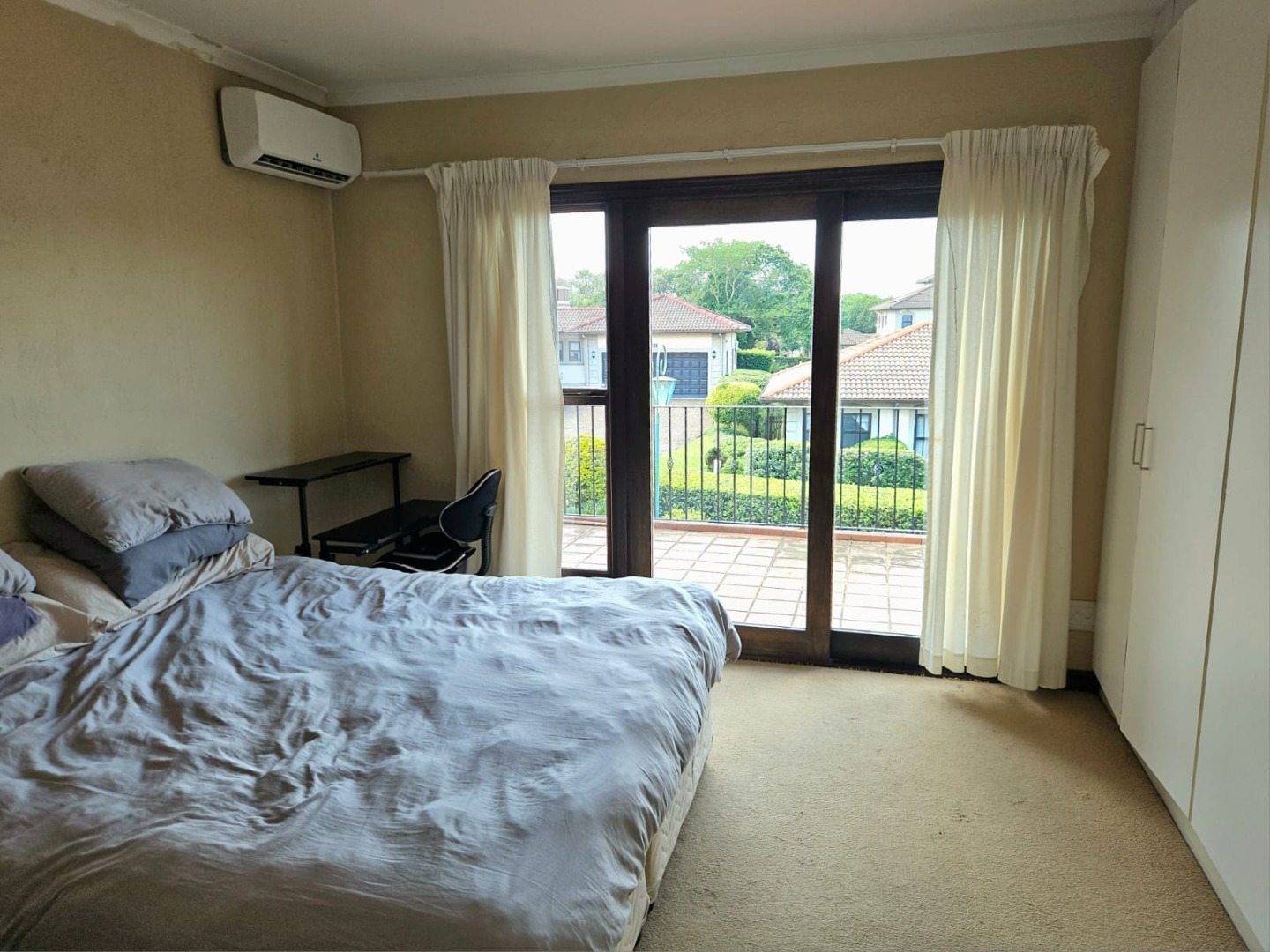 The main-en-suite has a large bath. The main bedroom has a lovely patio as well as an aircon. The photos show a king size bed and a cot in the pics. There is ample space for a dressing table.