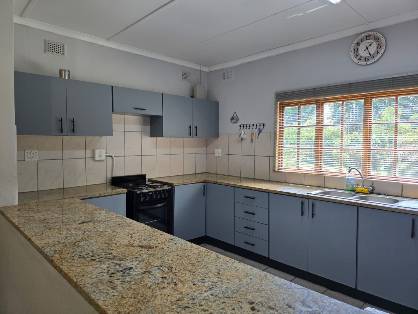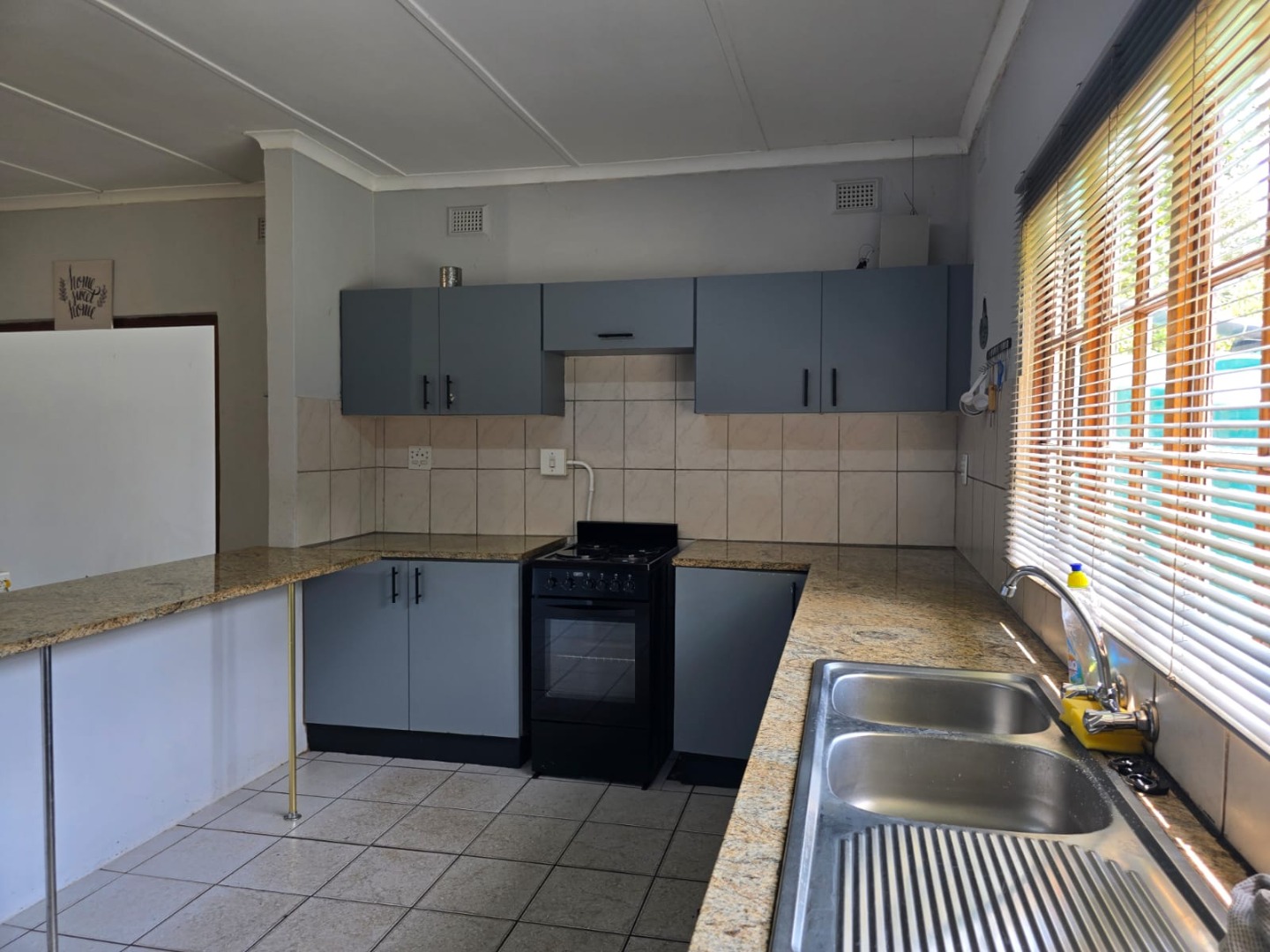 The property features a comfortable lounge with blinds, open plan dining room, and a spacious kitchen with a Granite countertops and stove as well as a laundry for the washing machine.