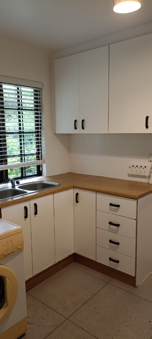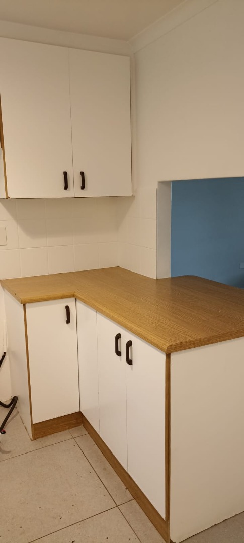 Tiled floors and plenty of kitchen cupboards, full bathroom with a bath and shower.