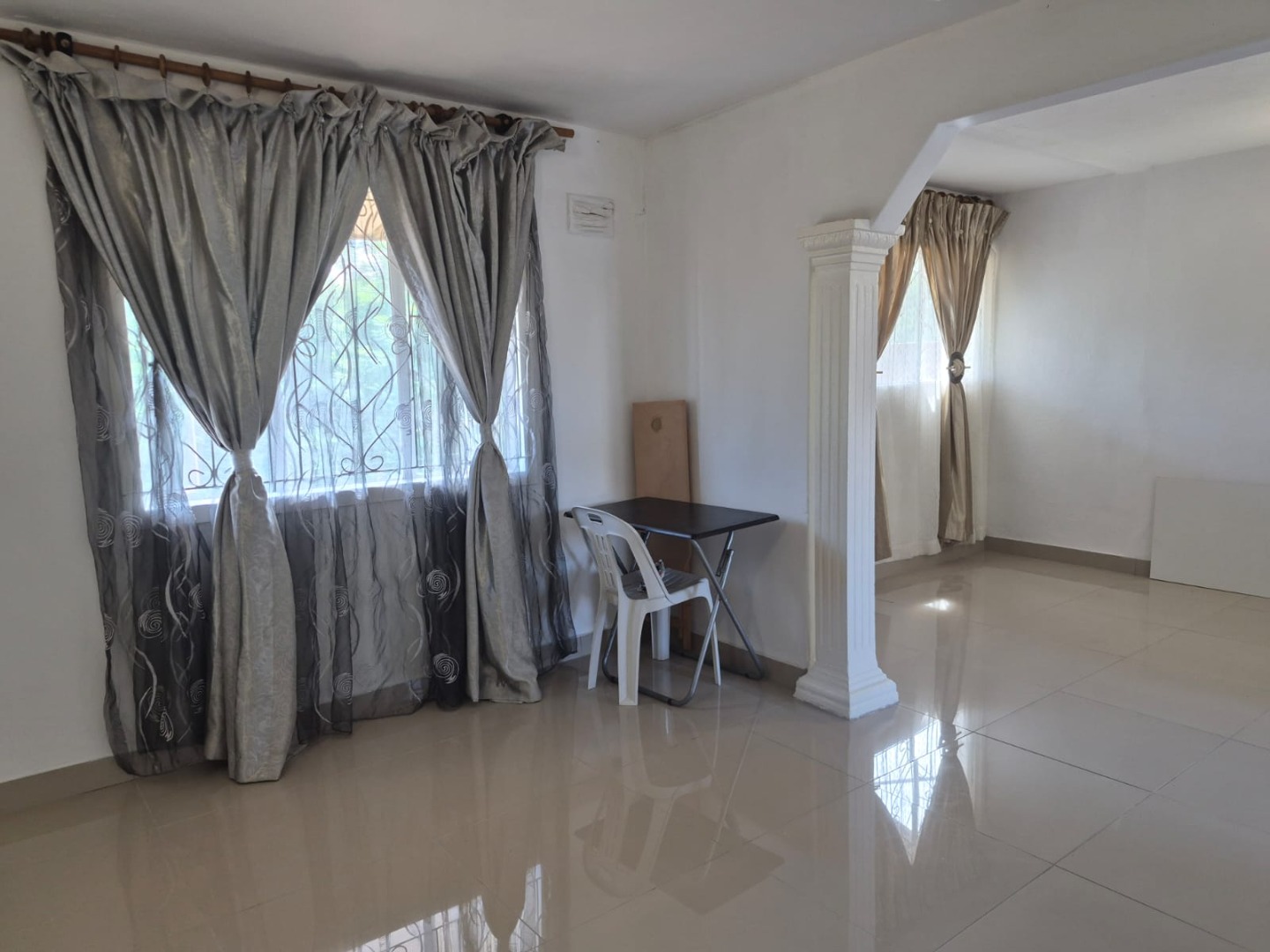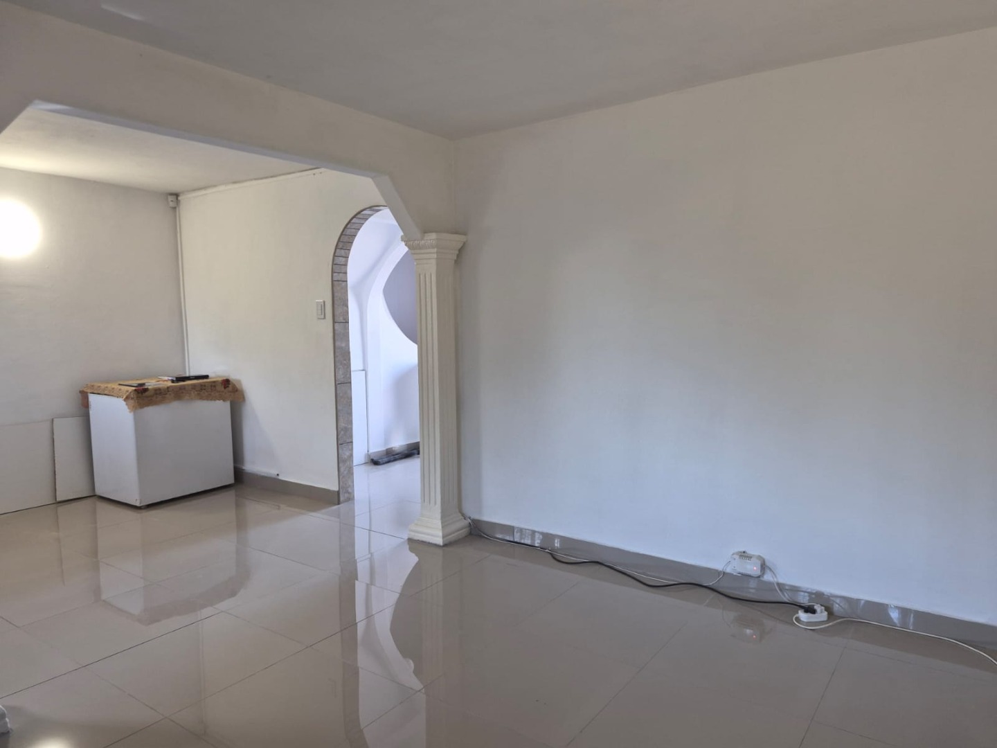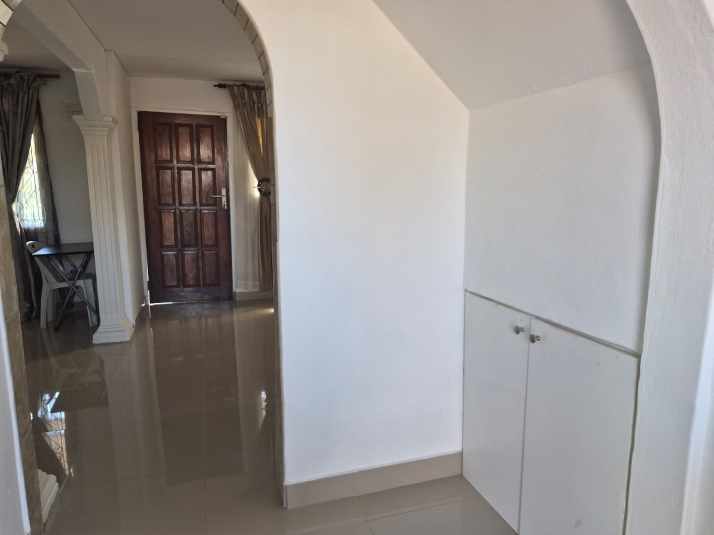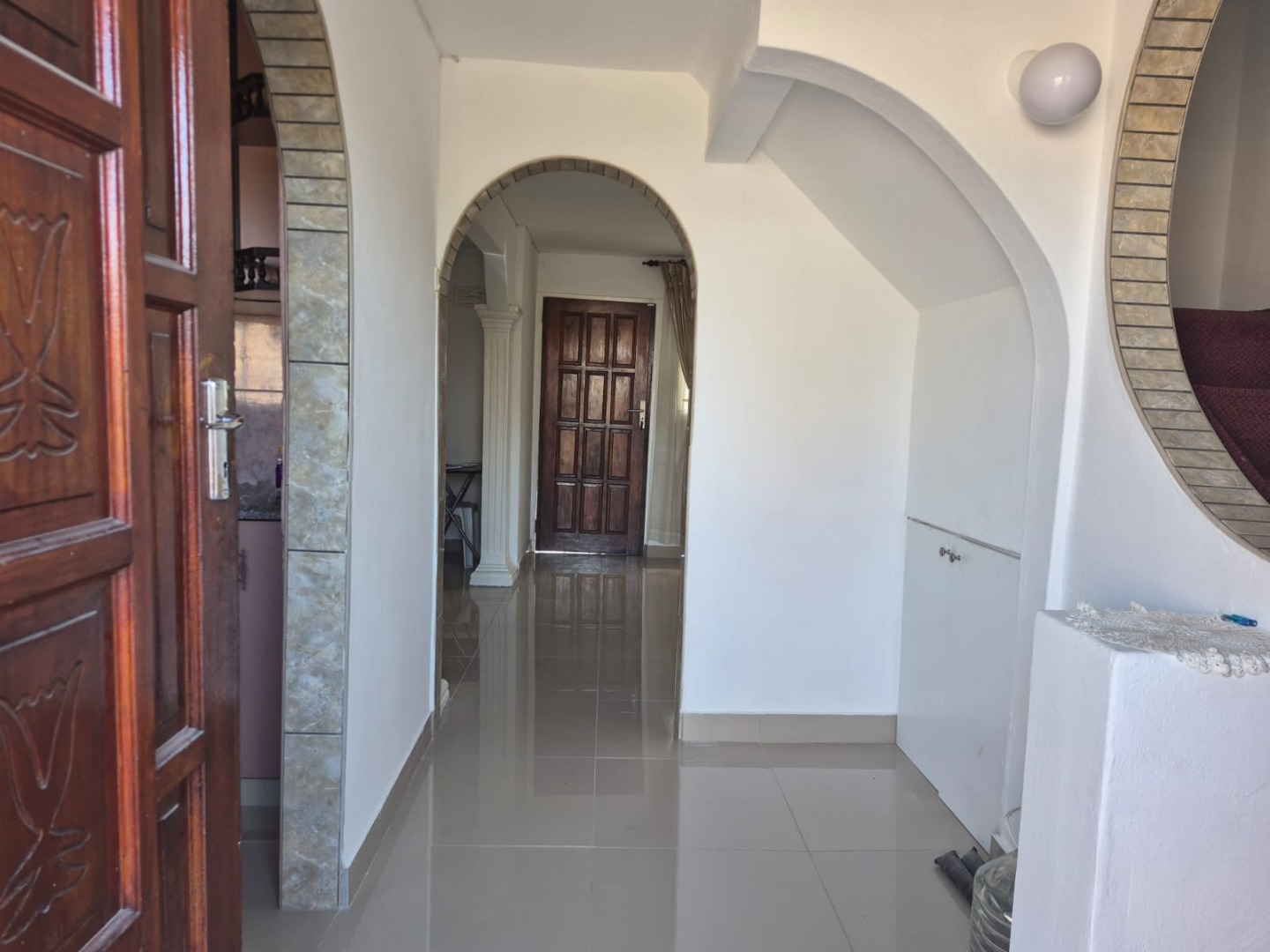 Discover this inviting 3-bedroom, 1-bathroom rental property situated in the suburban area of Greenbury, Phoenix. The interior boasts clean, glossy tiled floors and freshly painted white walls throughout, creating a bright and welcoming ambiance. Architectural details such as decorative arched doorways and ornate dark wood doors add character to the living spaces, which include a comfortable lounge and a dedicated dining room.