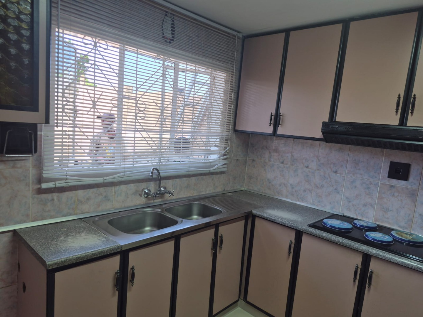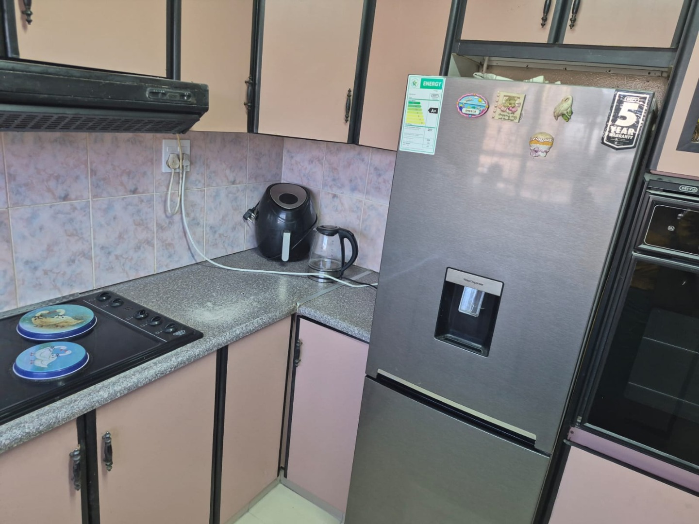 The functional kitchen is well-equipped with a double stainless steel sink, a built-in oven, and a hob, complemented by a modern stainless steel refrigerator. Ample cabinet storage ensures practicality for daily living. For added convenience, a guest toilet is also available.