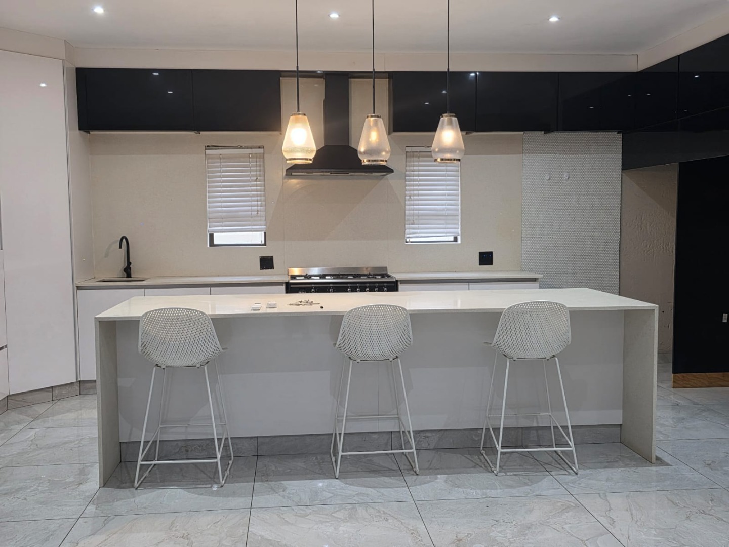 At the heart of the home is a sleek, open-plan kitchen complete with a large central island, space for two double-door fridges, and a separate scullery. Light-filled and inviting, it’s a space made for both everyday living and entertaining.