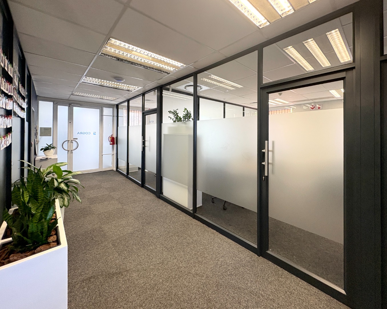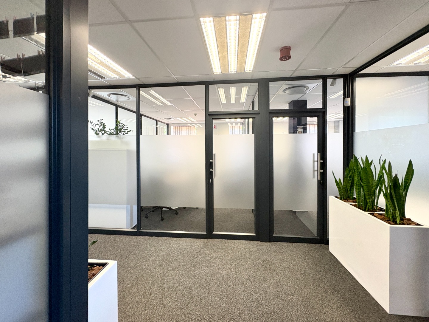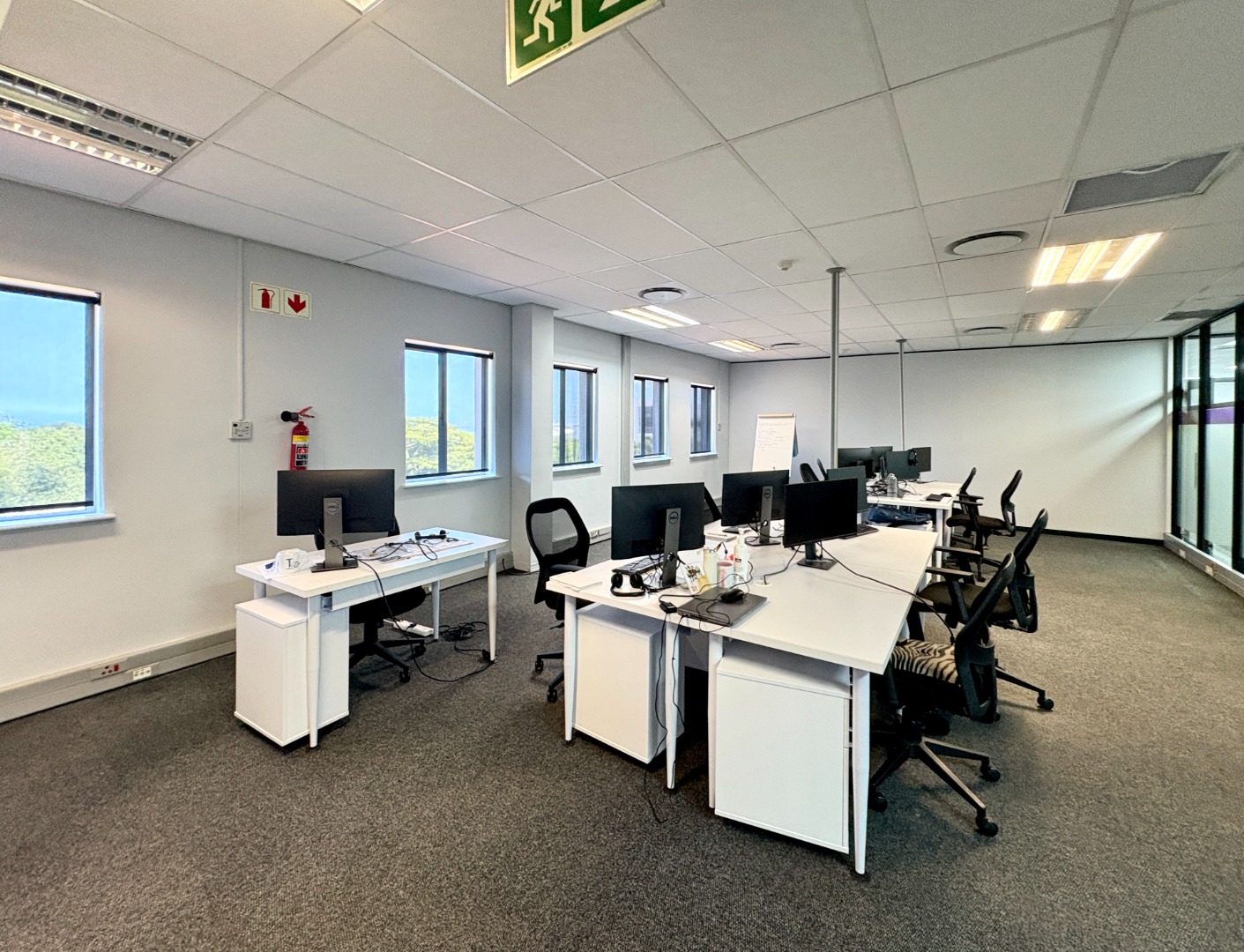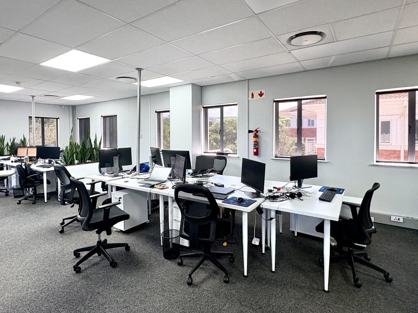 Comprising approximately 950 m² across three fully fitted units — one on the ground floor and two on the first — the building offers a versatile layout designed for functionality and comfort. Each office features a blend of open-plan work areas, executive offices, boardrooms, and kitchen facilities, with shared restrooms conveniently located on each level. The design promotes both collaboration and privacy, ideal for dynamic, growing businesses.